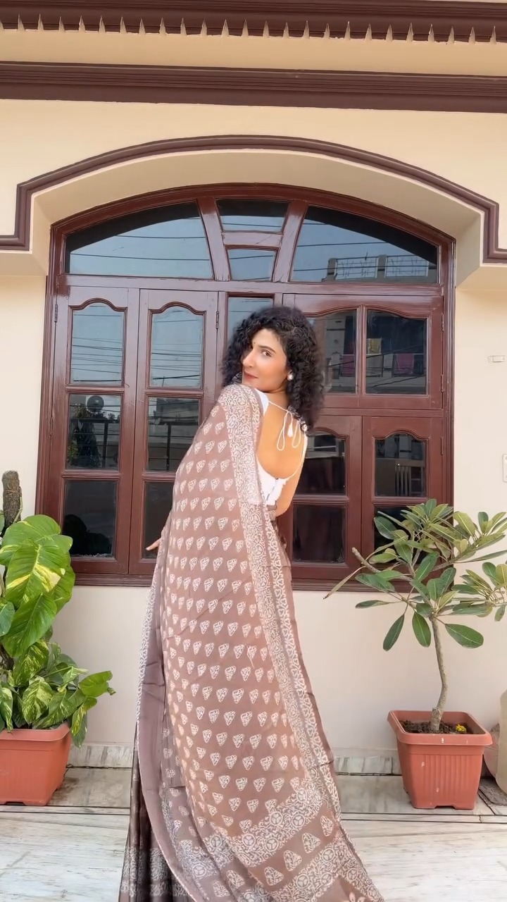 This outfit features a sophisticated brown saree adorned with subtle traditional-inspired prints, offering a refined and earthy aesthetic suitable for both everyday wear and semi-formal occasions. The saree showcases a soft, flowing fabric that drapes elegantly, enhancing comfort while maintaining a graceful silhouette. The intricate border detailing adds a touch of classic charm, complementing the overall minimal yet timeless design. Paired with a contrasting sleeveless blouse, the ensemble creates a balanced fusion of traditional style and modern simplicity. The neutral brown tone makes it highly versatile, allowing easy styling with different accessories for various occasions. Ideal for office wear, casual outings, or small gatherings, this saree reflects understated elegance and practicality. This description is based purely on visual interpretation and does not reference or reproduce any specific brand, trademark.