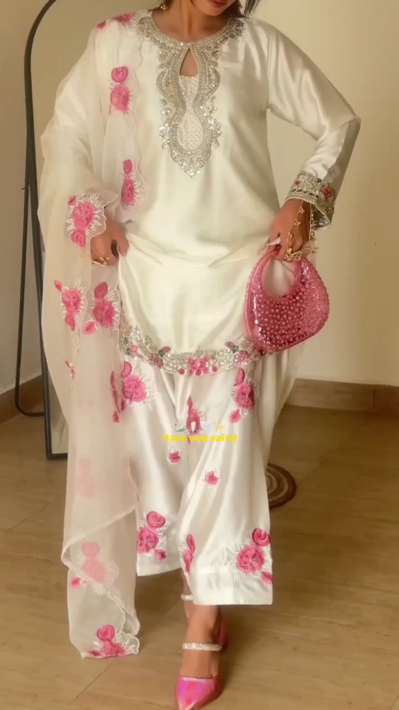 This elegant white suit set is beautifully detailed with soft pink floral embroidery across the kurta, dupatta, and trousers. The neckline features intricate silver embellishment with a keyhole design that adds a refined touch. The hemline and sleeves are finished with delicate embroidered borders, creating a cohesive and graceful look. Paired with a sheer embroidered dupatta and matching bottoms, this outfit is ideal for festive gatherings, daytime functions, and special occasions. The light color palette gives it a fresh and sophisticated appeal.This elegant white suit set is beautifully detailed with soft pink floral embroidery across the kurta, dupatta, and trousers. The neckline features intricate silver embellishment with a keyhole design that adds a refined touch. The hemline and sleeves are finished with delicate embroidered borders, creating a cohesive and graceful look. Paired with a sheer embroidered dupatta and matching bottoms, this outfit is ideal for festive gatherings, daytime functions, and special occasions. The light color palette gives it a fresh and sophisticated appeal.