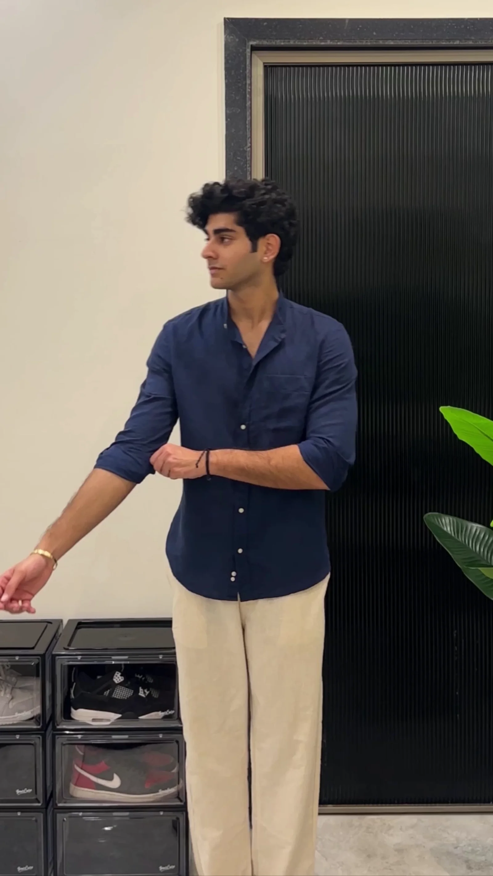 This stylish outfit features a light blue linen shirt paired with cream-colored pants, creating a clean and sophisticated look. The breathable linen fabric makes the shirt ideal for warm weather, offering both comfort and elegance. Its relaxed fit and open collar design provide a modern and effortless appearance. The cream pants complement the shirt perfectly, creating a balanced and refined outfit suitable for casual gatherings, vacations, or semi-formal occasions. This combination delivers a timeless style that is both simple and fashionable.