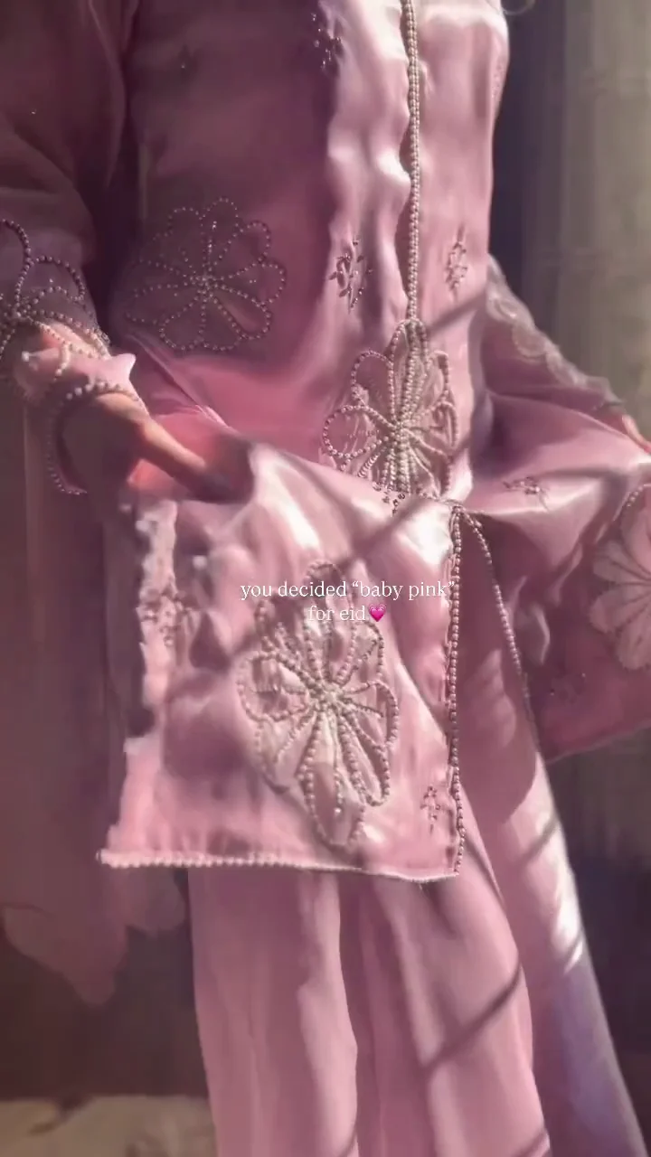A sophisticated baby pink kurta and sharara set designed with delicate embroidery and a flowing silhouette. The soft pastel shade combined with elegant detailing creates a graceful festive outfit. Perfect for Eid celebrations, festive gatherings, and evening events.