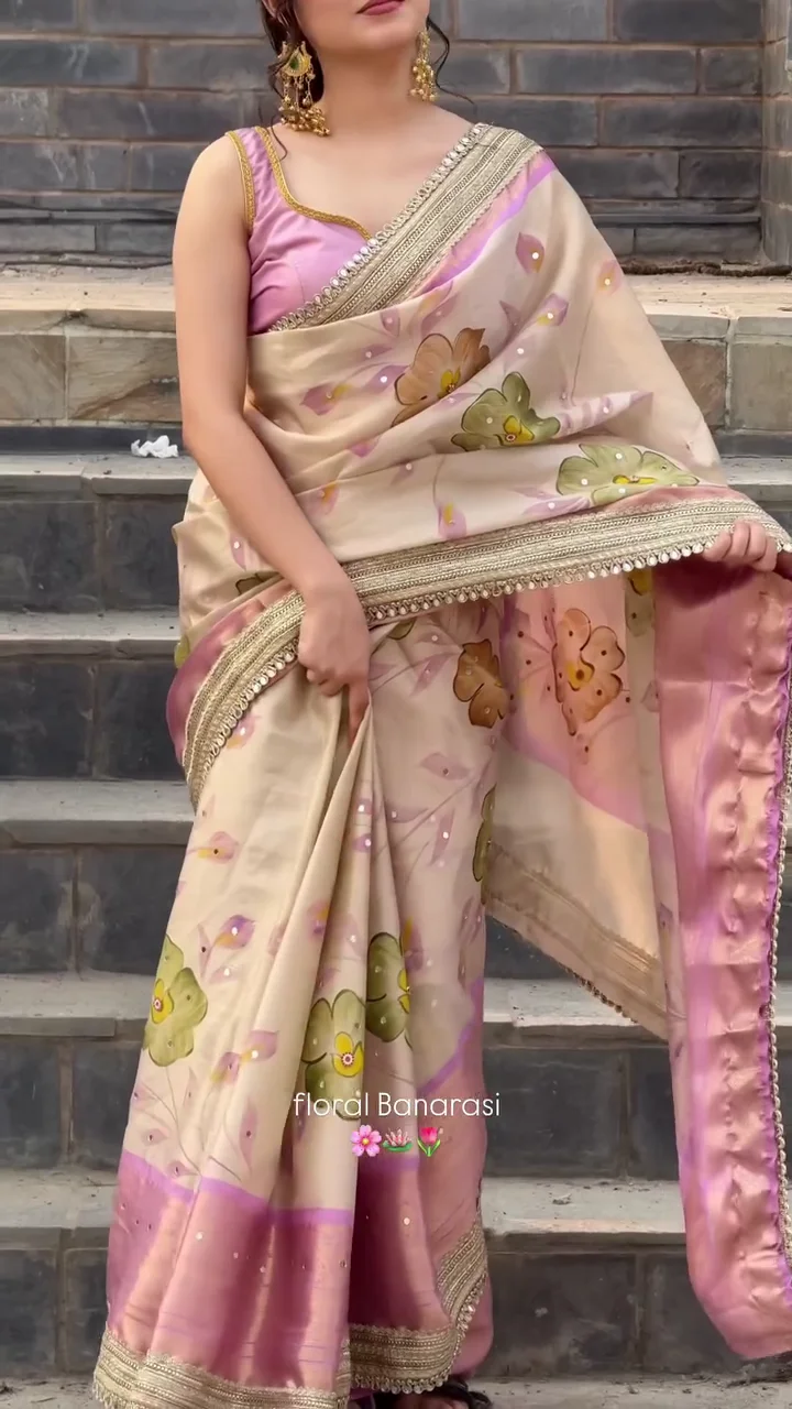 This floral Banarasi saree features delicate botanical motifs woven across a soft pastel base, creating a refined and feminine aesthetic. The subtle sheen of the fabric combined with an elegant border adds sophistication to the overall design. Ideal for daytime celebrations, cultural events, and festive gatherings, this saree offers a perfect balance of tradition and contemporary style.