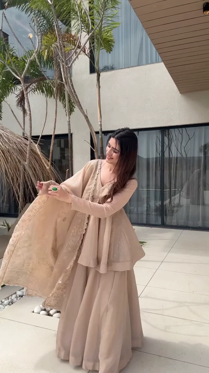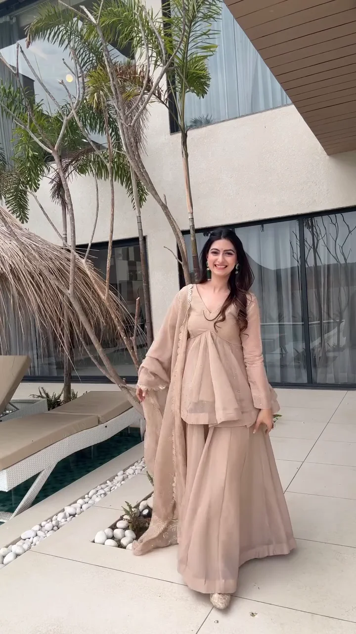 This elegant beige kurta set is paired with classic farshi-style pants that offer volume and regal appeal. The kurta features subtle embellishments that elevate the look without overpowering it. Crafted for comfort and flow, this ensemble is perfect for festive gatherings, daytime weddings, and traditional celebrations. The soft neutral tone allows for versatile styling with statement jewelry.