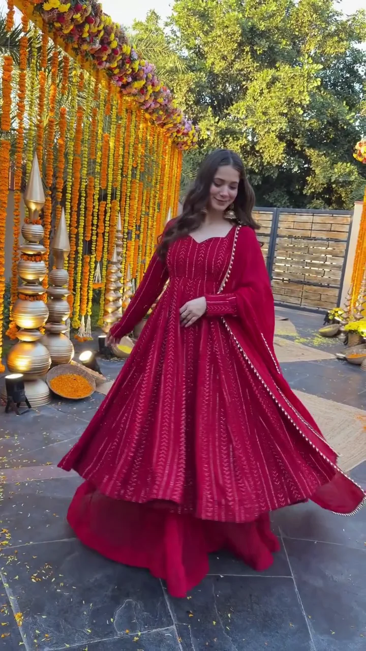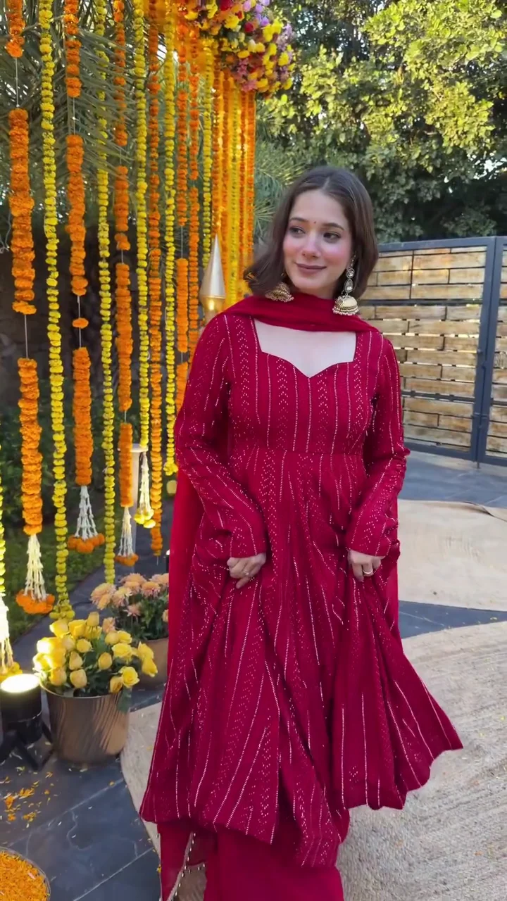 A graceful wine red Anarkali suit designed with fine vertical embellishment that enhances the flow and elegance of the outfit. The flared kurta is paired with a matching bottom and dupatta, making it perfect for festive occasions, family functions, and celebrations. The rich color and soft drape create a flattering silhouette suitable for all body types.