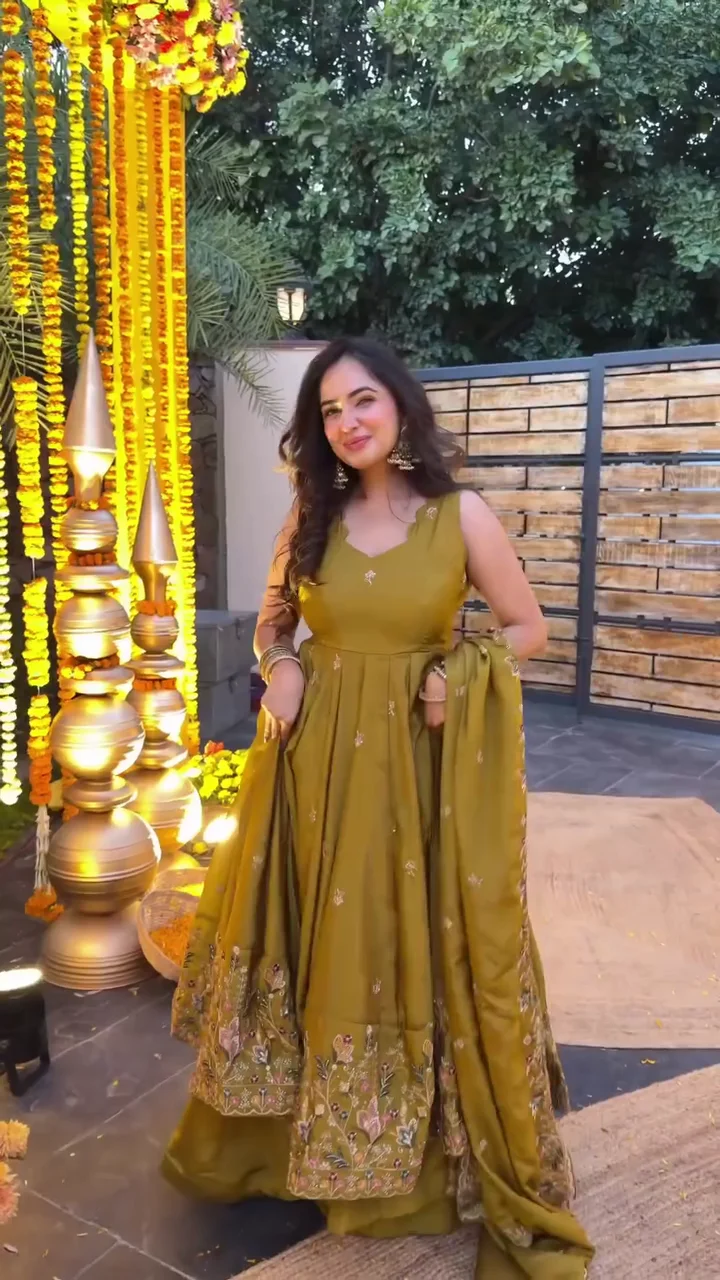 An elegant olive green Anarkali suit adorned with delicate embroidery along the hem and subtle motifs throughout. The outfit includes a matching dupatta and bottom, offering a refined traditional look. Suitable for festive wear, poojas, and daytime celebrations, this piece blends classic design with contemporary color appeal.