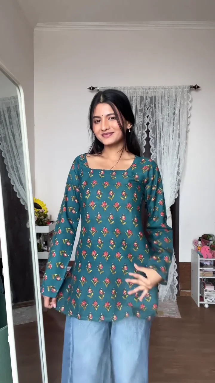 This yellow printed tunic features a vibrant traditional-inspired pattern and relaxed fit. Paired with wide-leg light-wash jeans, it creates a perfect fusion of ethnic and modern styling. The flared sleeves and detailed print add character, while the denim balances the look for everyday wear. Ideal for casual outings and college wear, this combination offers comfort with standout style.