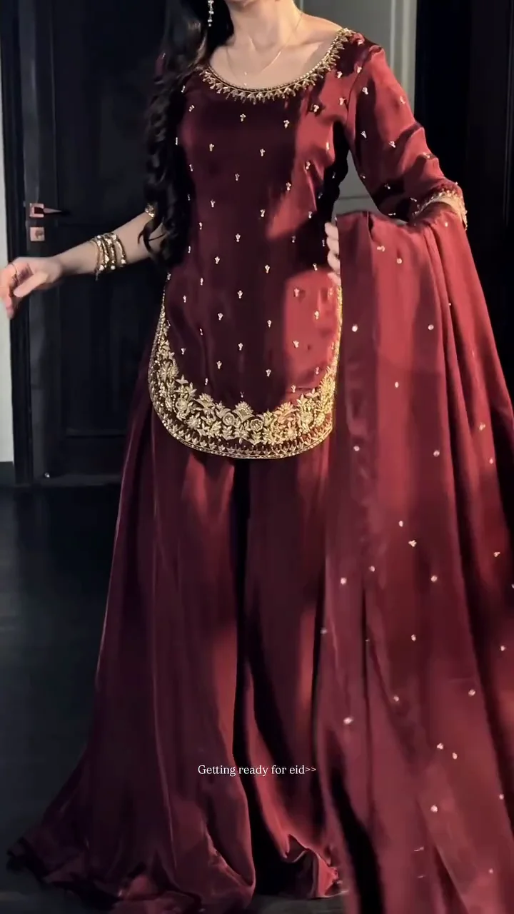 This maroon kurta sharara set is crafted with intricate golden embroidery along the neckline and hem, giving it a rich festive appeal. The straight-cut kurta is paired with a wide sharara that offers movement and elegance. The detailed border work adds depth and refinement to the outfit. Ideal for Eid, weddings, and festive gatherings, this set combines timeless craftsmanship with contemporary styling for a polished ethnic look.