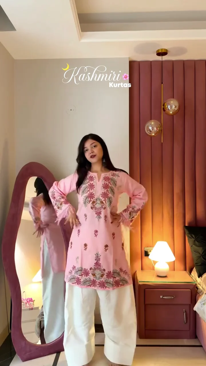 A beautifully crafted white kurta featuring vibrant Kashmiri-inspired embroidery along the neckline and hem. The wide-leg pants enhance the overall flow and comfort of the ensemble. This outfit is perfect for festive mornings, cultural events, or elegant day functions. The detailed threadwork stands out against the soft white base, creating a refined yet striking appearance.