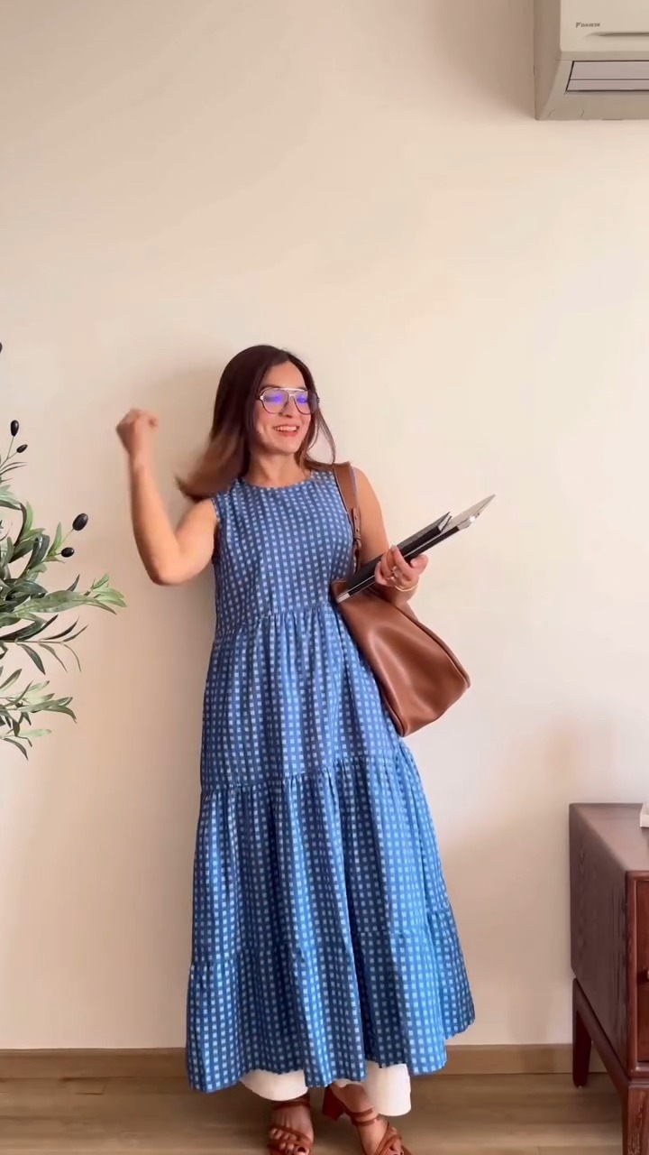 This outfit features a charming blue midi dress designed with subtle check patterns, offering a perfect blend of simplicity and elegance. The sleeveless design and round neckline provide a clean, modern look, while the tiered structure adds volume and graceful movement to the silhouette. Crafted from a lightweight and breathable fabric, this dress ensures all-day comfort, making it ideal for casual outings, work environments, or relaxed day events. The soft gathered waist enhances the fit without compromising on ease, creating a flattering yet effortless style. Paired with minimal accessories and neutral footwear, this piece stands out as a versatile wardrobe staple that transitions seamlessly from day to evening wear. Its understated pattern and soothing color palette make it suitable for those who appreciate refined, minimal fashion. This description is based purely on visual interpretation and does not reference or reproduce any specific brand, trademark.