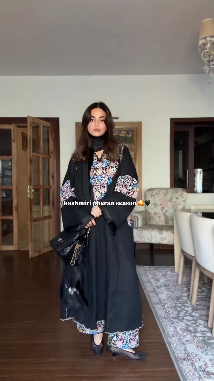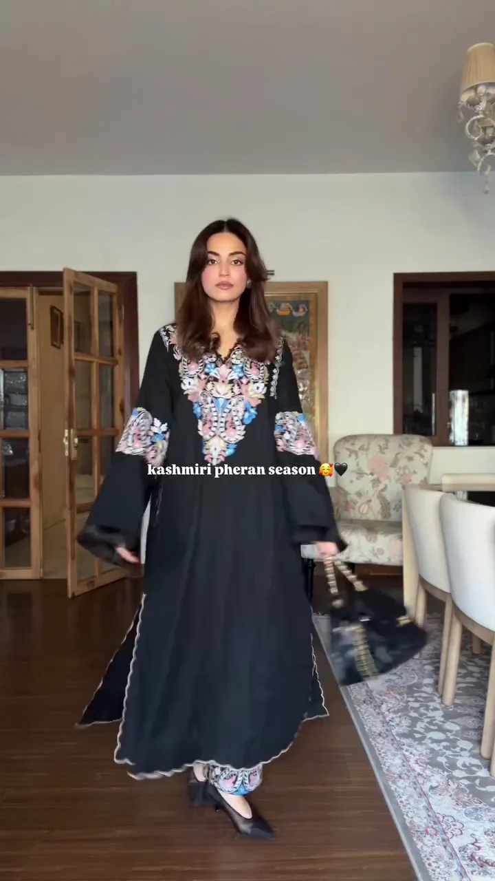 This black Kashmiri-inspired pheran features detailed multicolored embroidery on the sleeves and front panel. Designed for colder seasons, it combines warmth with traditional artistry. The relaxed silhouette ensures comfort, while the embroidery adds character and cultural depth. Ideal for winter gatherings or heritage-inspired styling, this piece blends tradition with contemporary elegance.