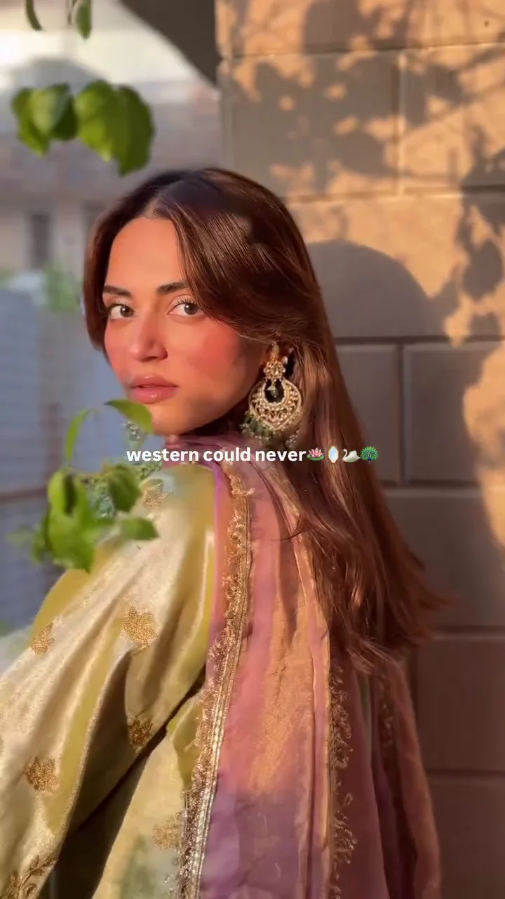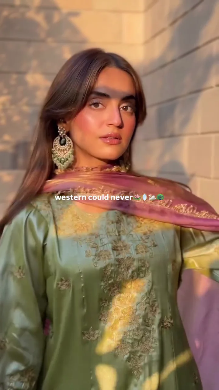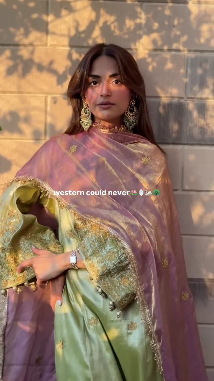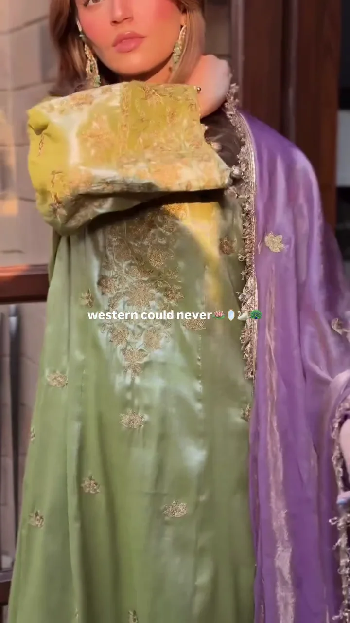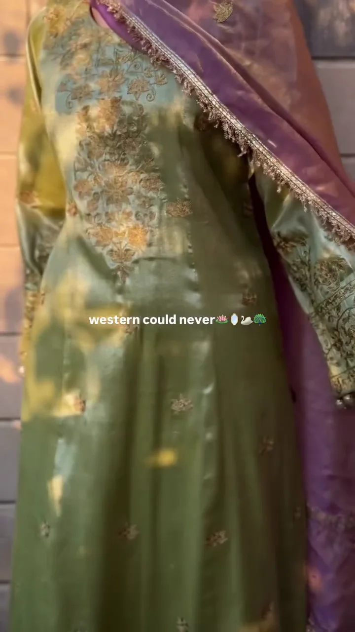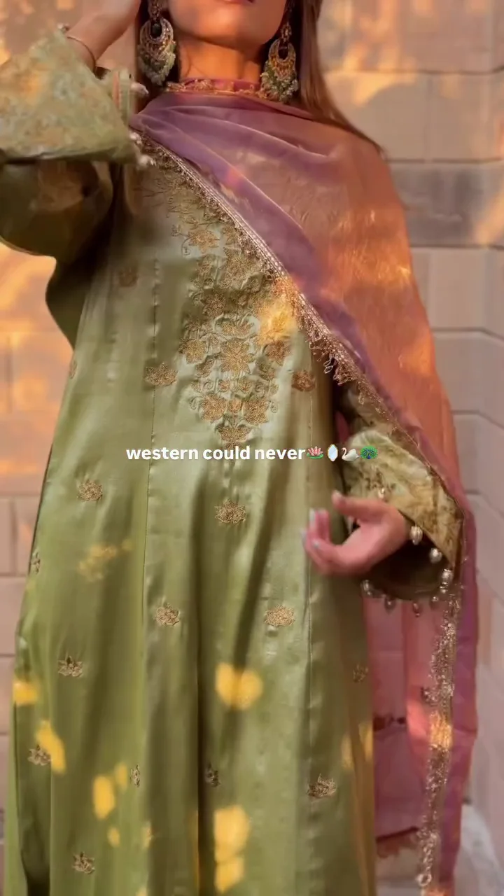 This olive green silk suit features intricate golden embroidery across the bodice and sleeves, creating a regal aesthetic. The soft sheen of the fabric enhances its festive appeal, while the matching dupatta adds balance and fluidity. Suitable for weddings and evening celebrations, this outfit offers a timeless and luxurious ethnic style.