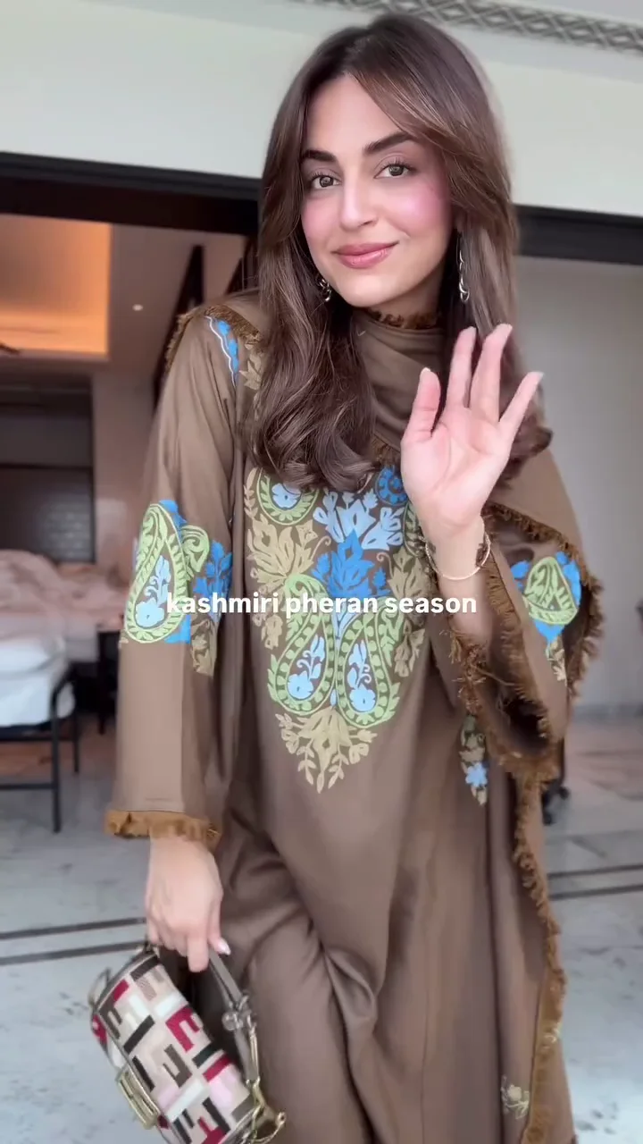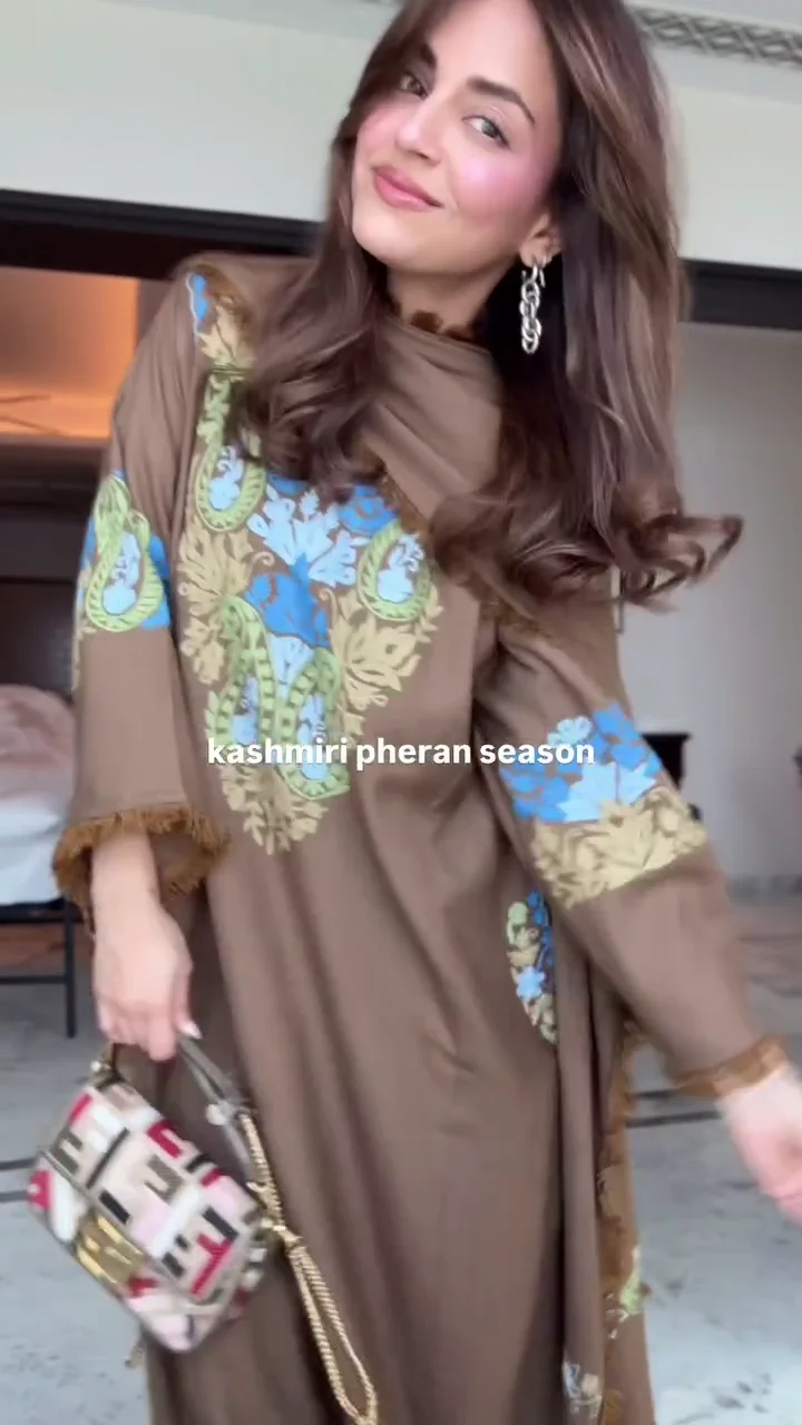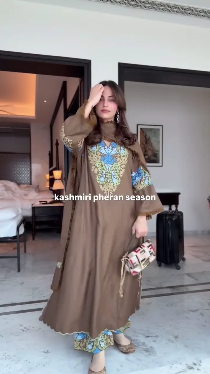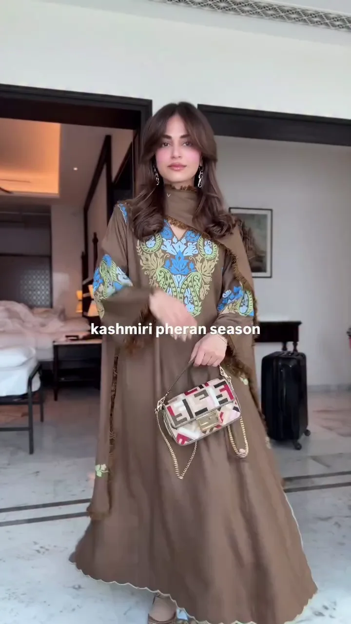 A classic brown pheran adorned with traditional Kashmiri-style embroidery along the chest and sleeves. Designed for warmth and elegance, it offers a comfortable fit suitable for winter gatherings. The subtle detailing and structured silhouette make it a versatile seasonal piece that can be styled effortlessly for both casual and semi-formal occasions.