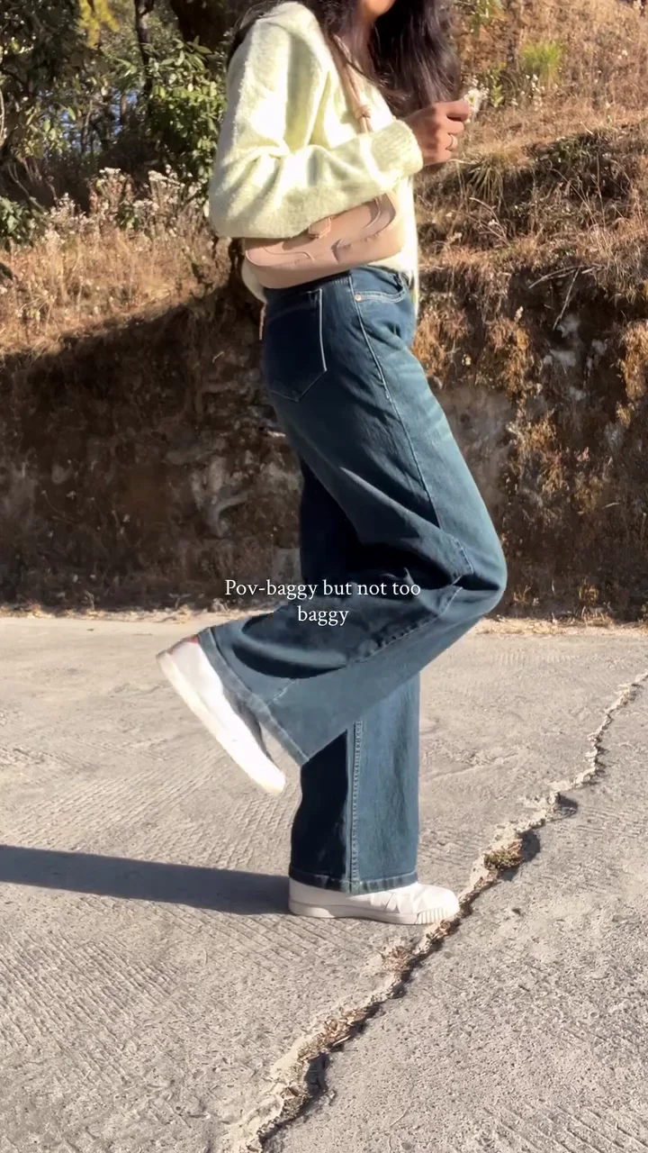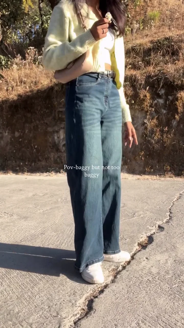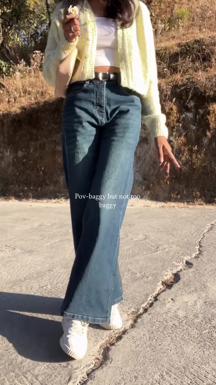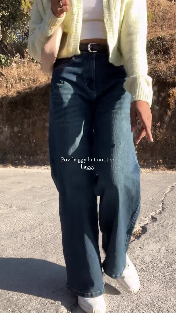These high-waisted blue denim jeans feature a relaxed baggy fit that offers comfort without appearing oversized. Designed for everyday wear, they pair effortlessly with crop tops, cardigans, or casual tees. The structured waistband enhances the silhouette while maintaining a laid-back, trendy vibe.