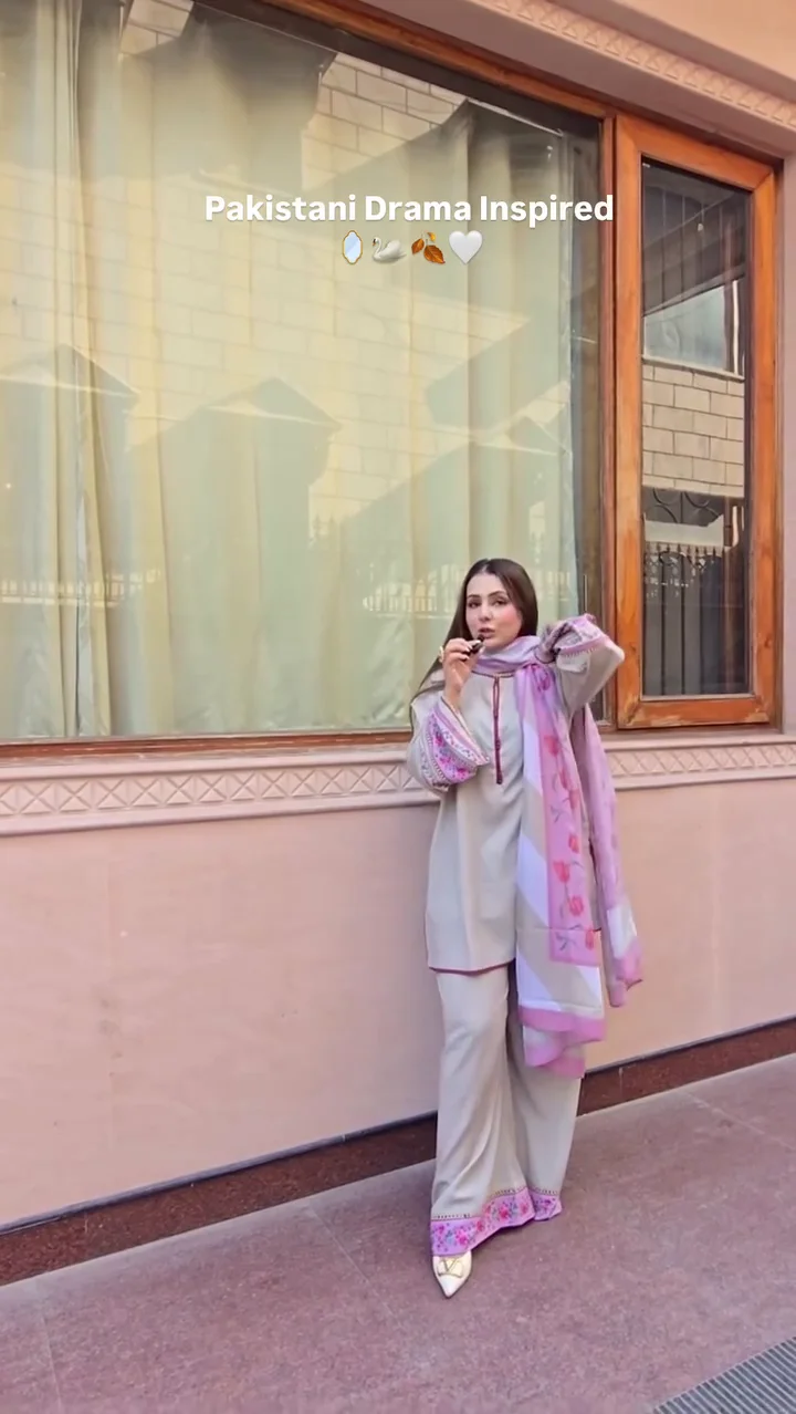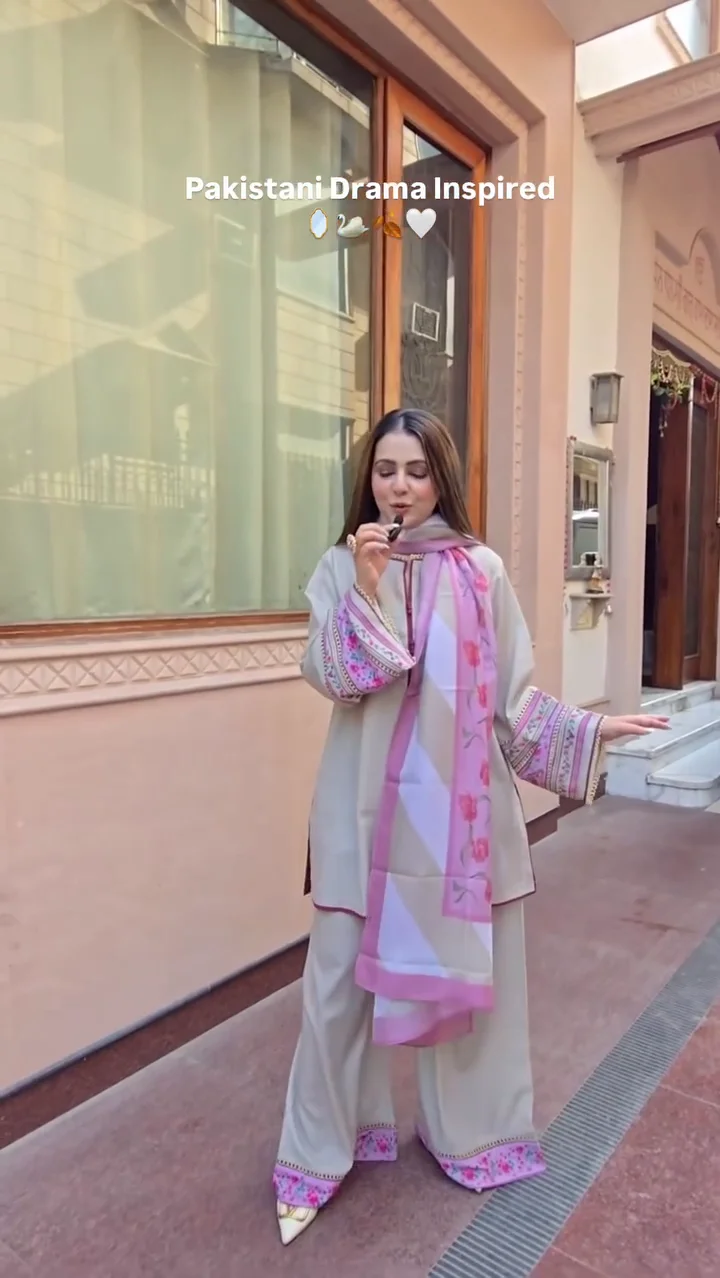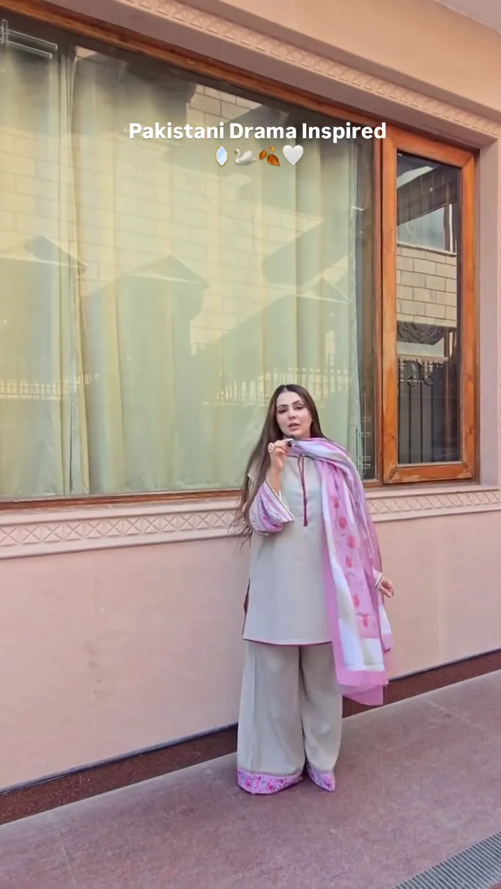 A graceful grey kurta and trouser set highlighted with delicate pink detailing on the sleeves and dupatta. The straight-fit silhouette offers a clean and elegant finish, making it ideal for formal gatherings and festive occasions. The subtle contrast of grey and pink adds sophistication to the overall look.