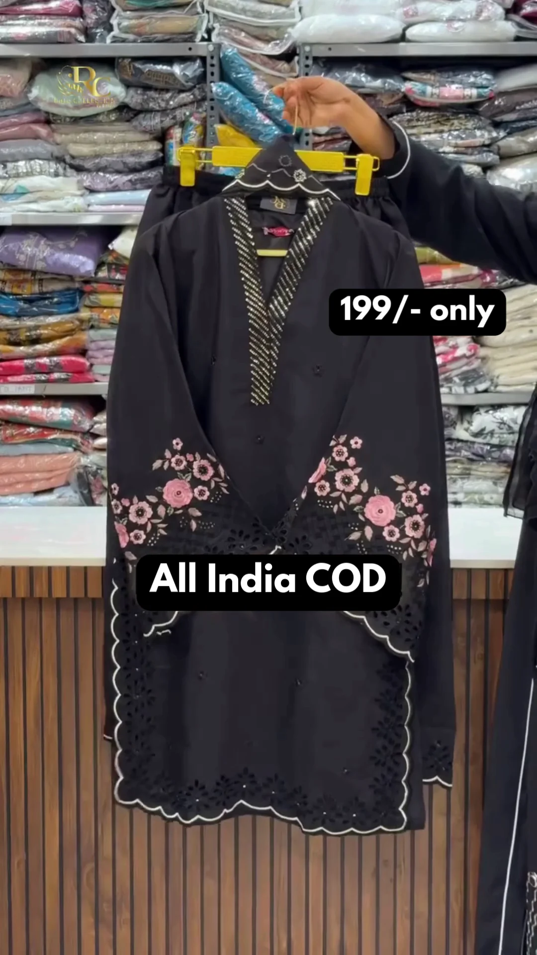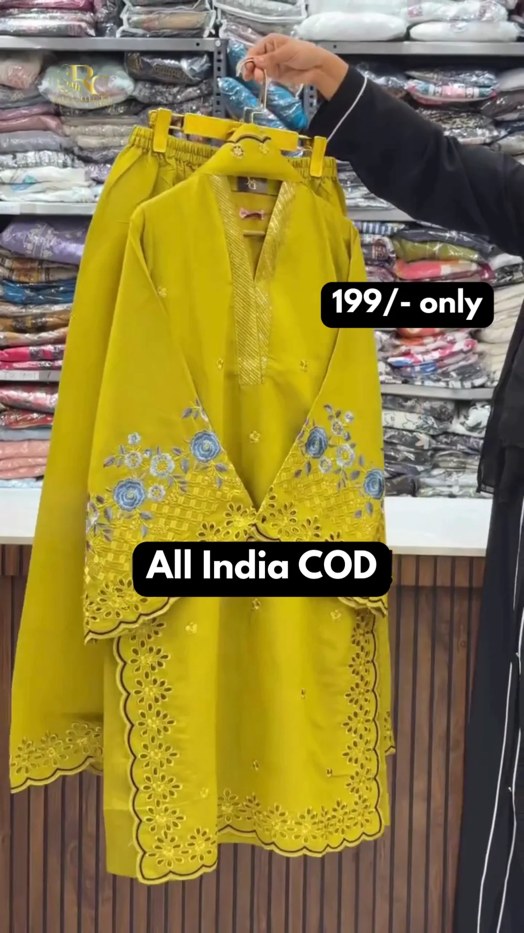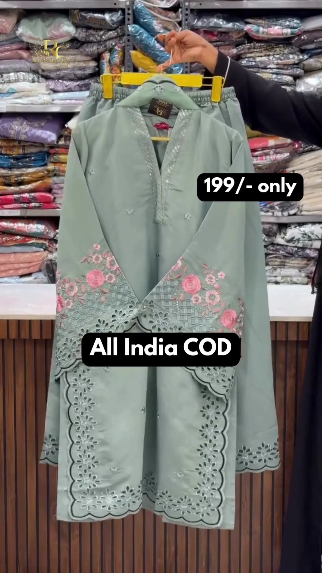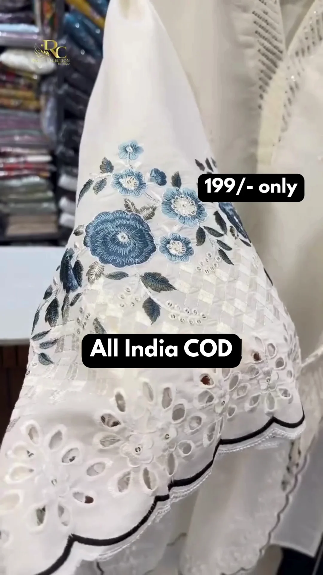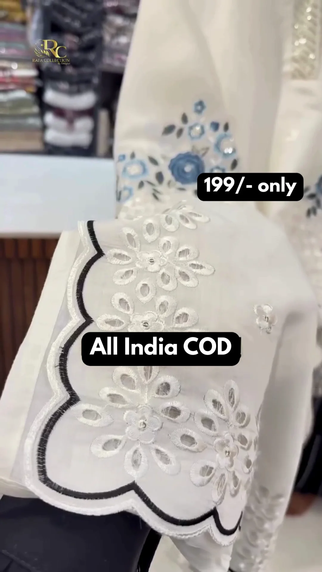 A graceful ivory kurti featuring delicate blue floral embroidery on the front with intricate lace detailing and scalloped borders. Designed with a soft V-neck and full sleeves, this piece offers a refined festive look perfect for daytime gatherings and special occasions.