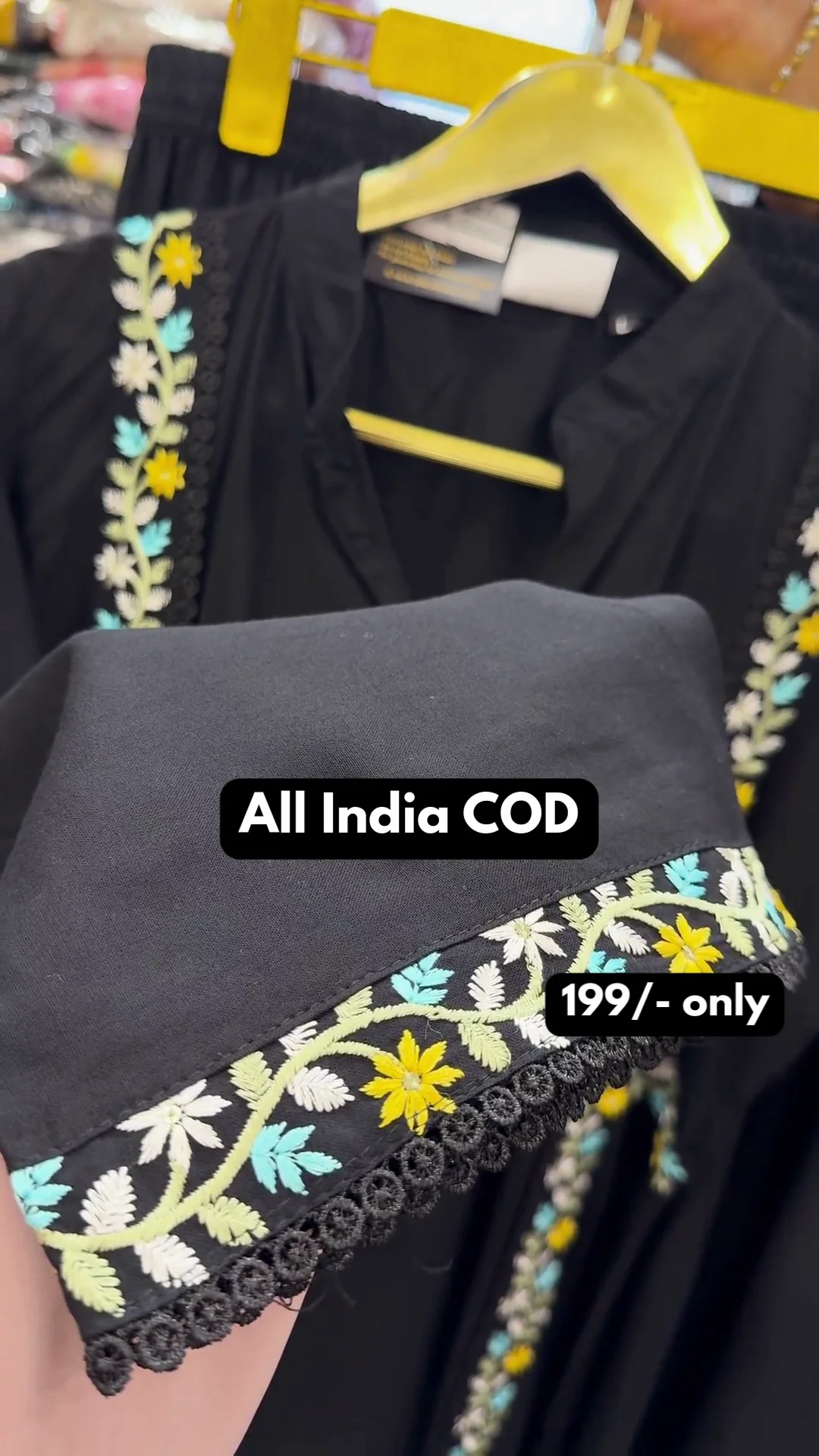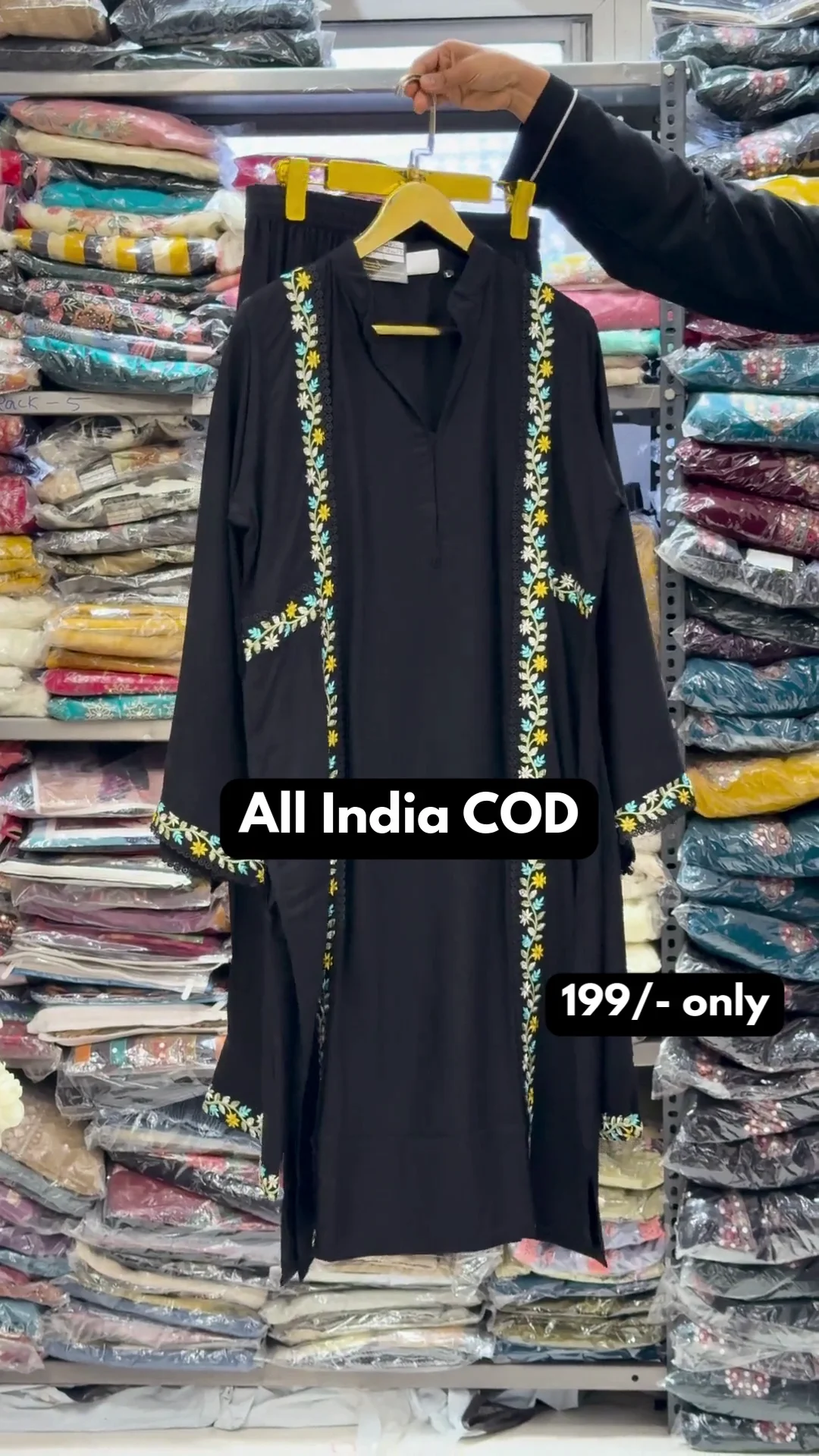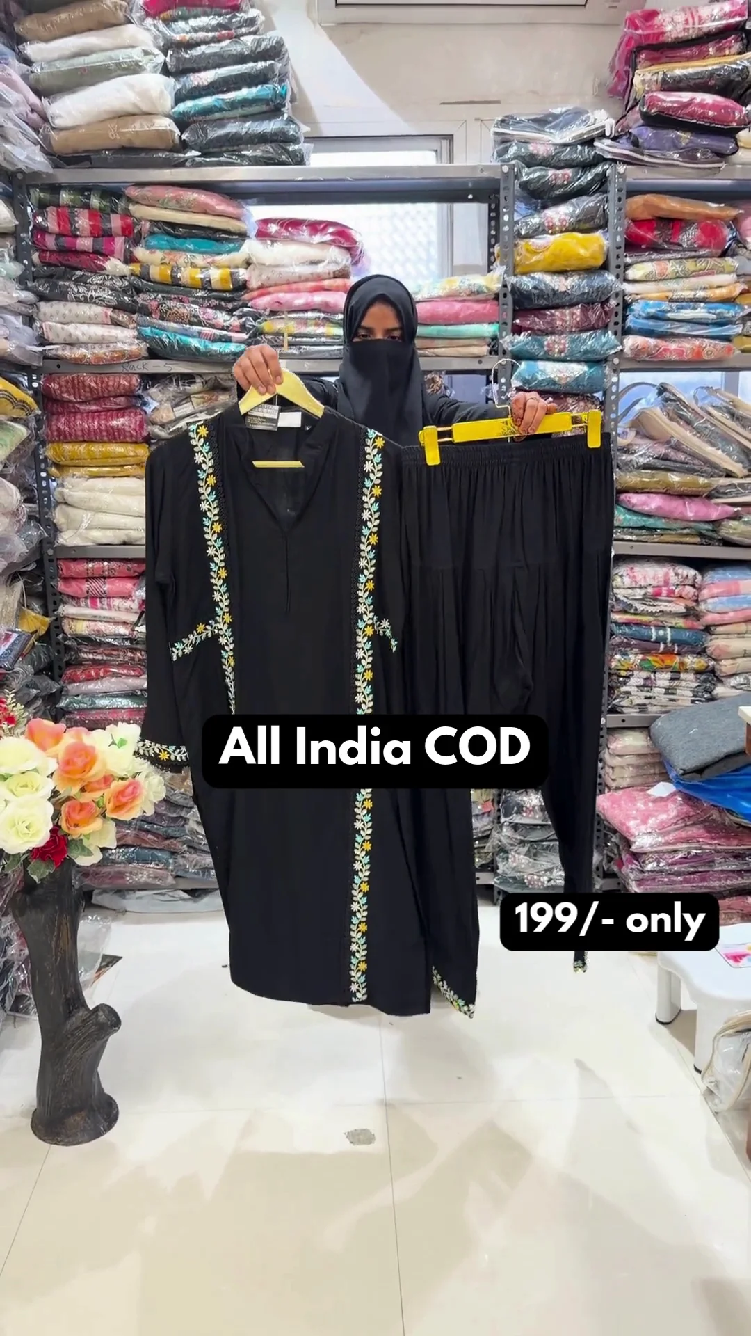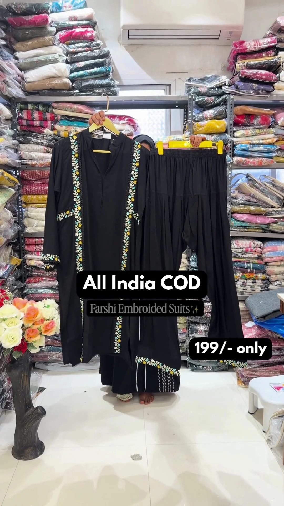 A sophisticated black Farshi-style suit featuring vertical floral embroidery panels and coordinated detailing on the sleeves. The straight silhouette offers a graceful and contemporary traditional look.