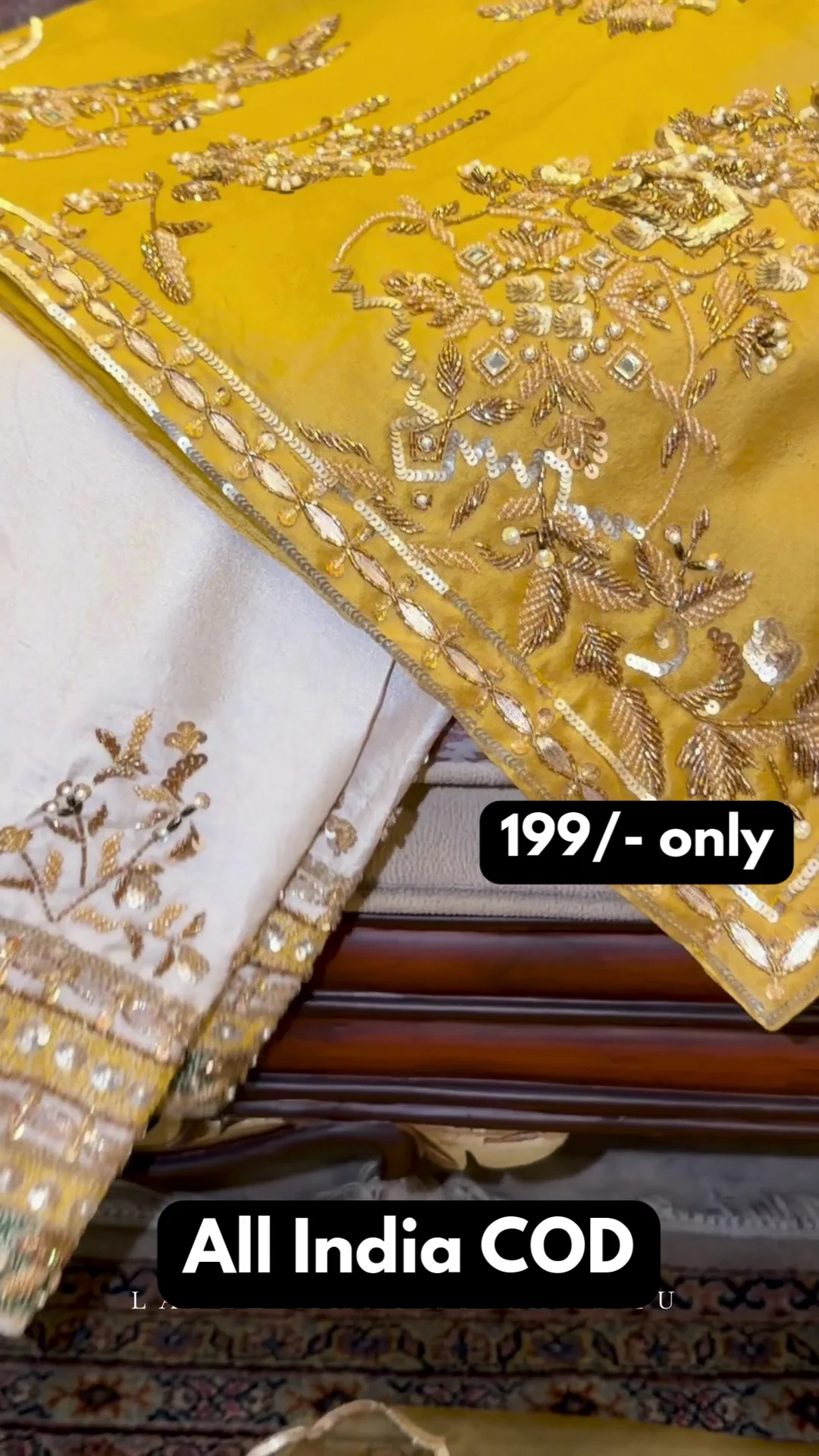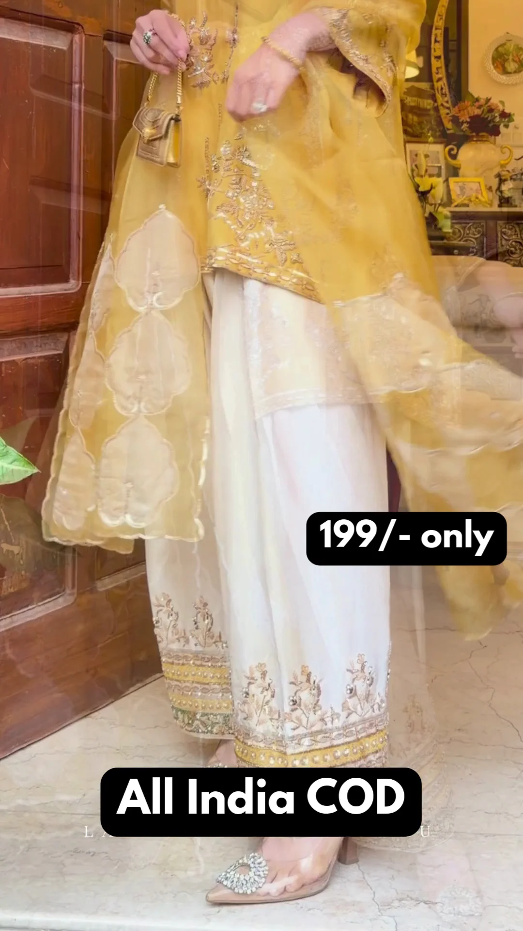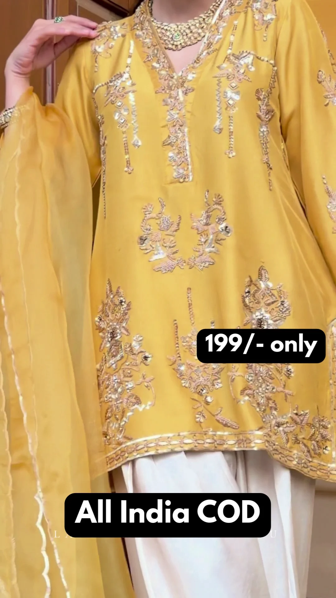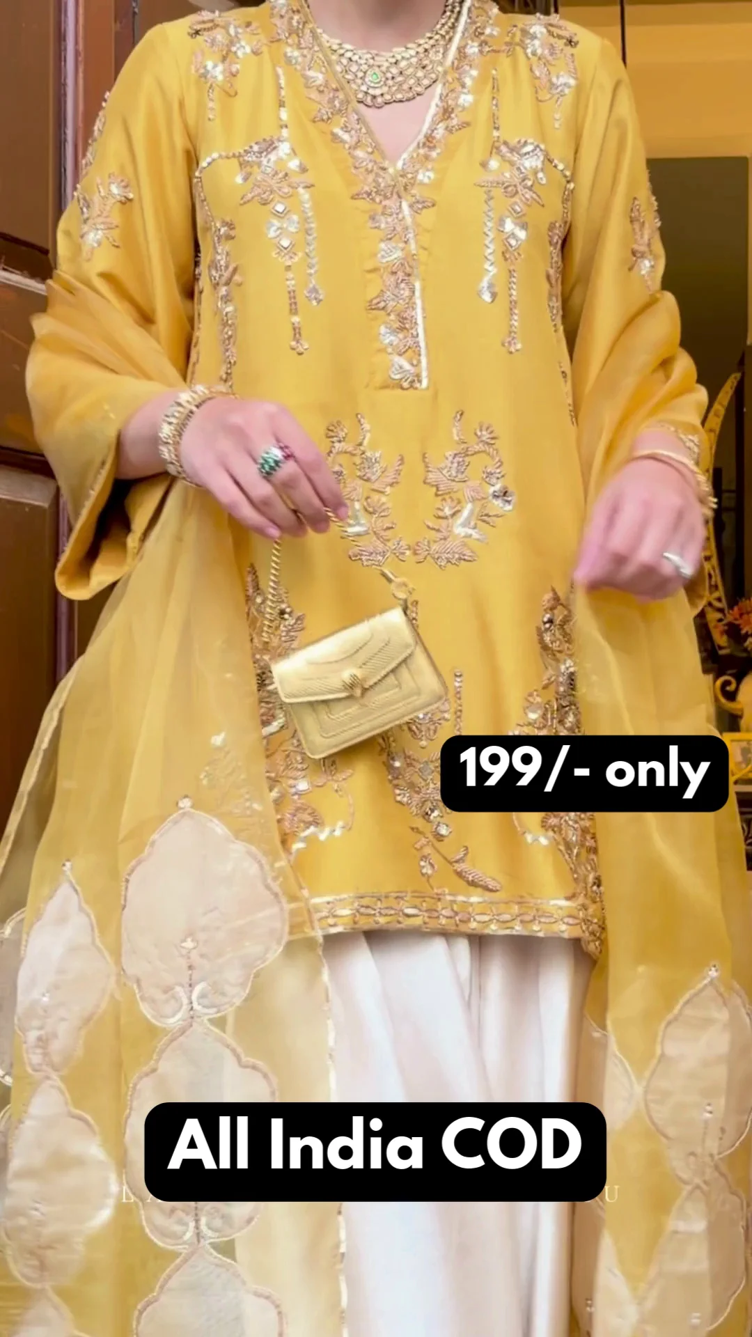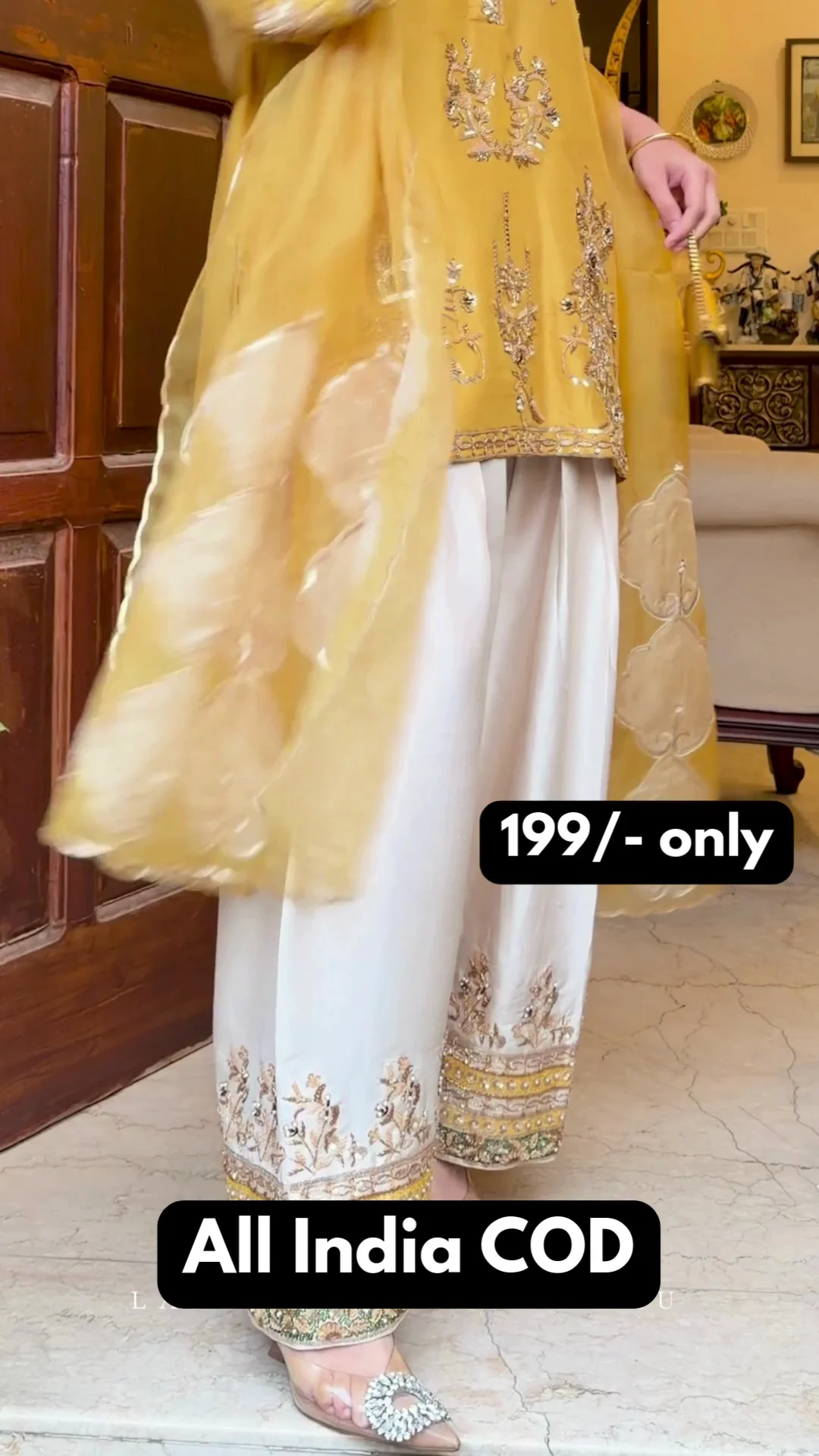 This elegant mustard yellow kurta set is designed with intricate golden embroidery that adds a rich and festive appeal. The kurta features detailed embellishments on the neckline, sleeves, and hem, creating a graceful and refined look. It is paired with flowy off-white wide-leg bottoms highlighted with delicate embroidered borders. The matching dupatta completes the ensemble, making it perfect for weddings, festive gatherings, and special occasions. Crafted for comfort and style, this outfit blends traditional charm with contemporary sophistication.