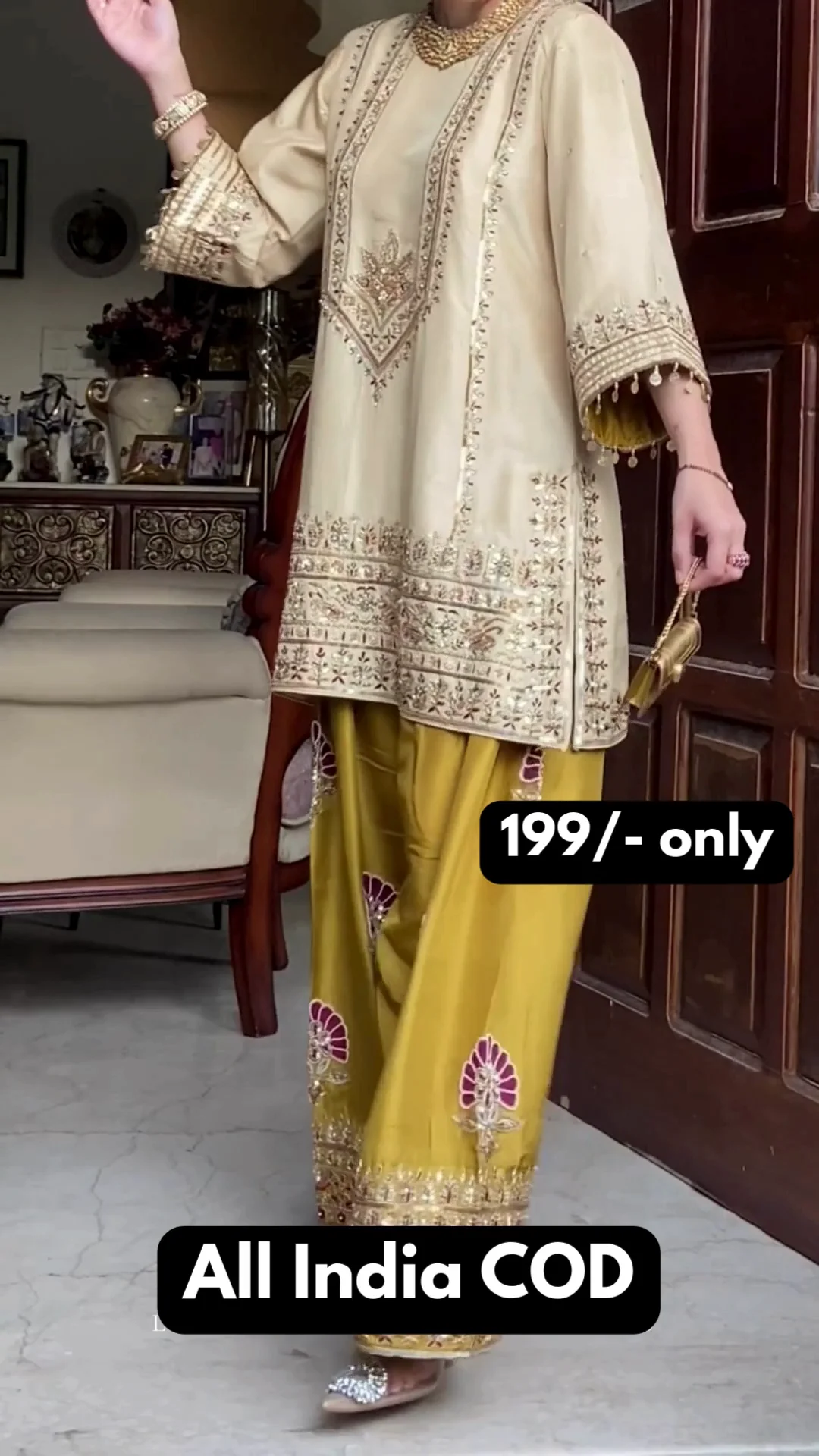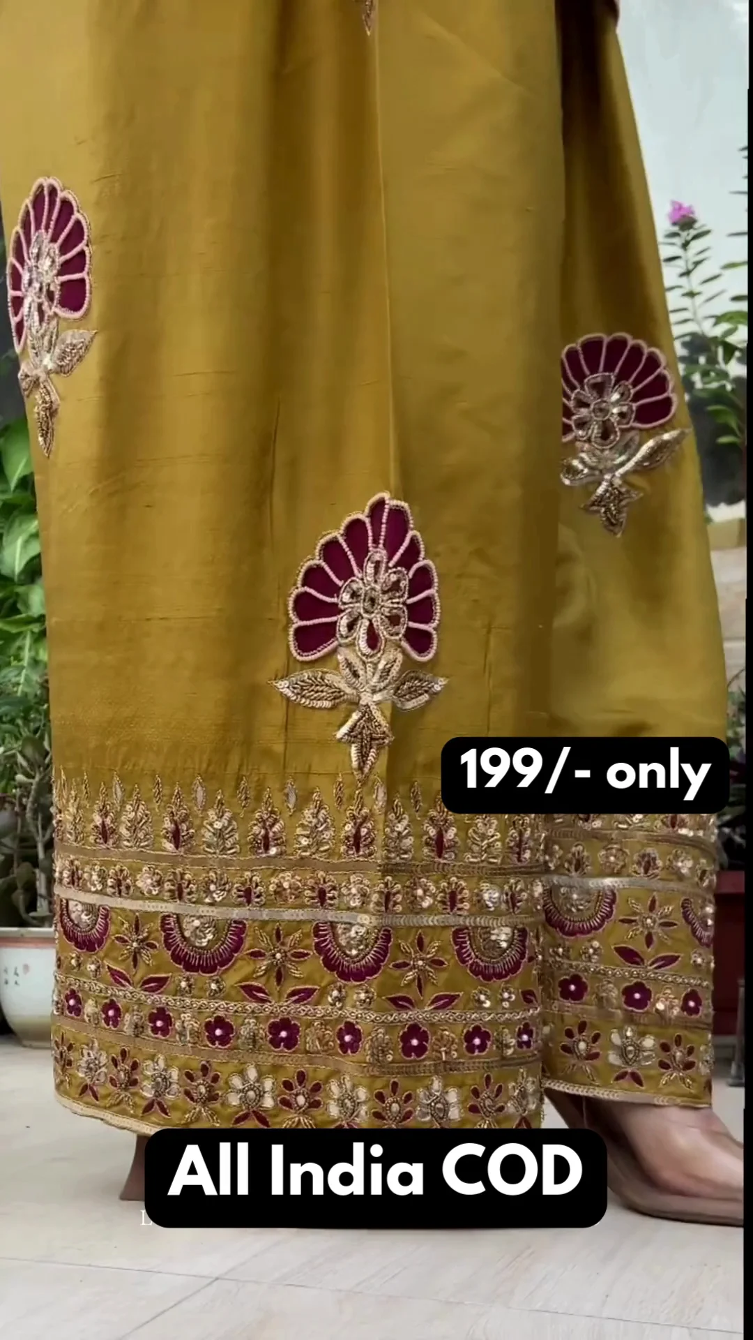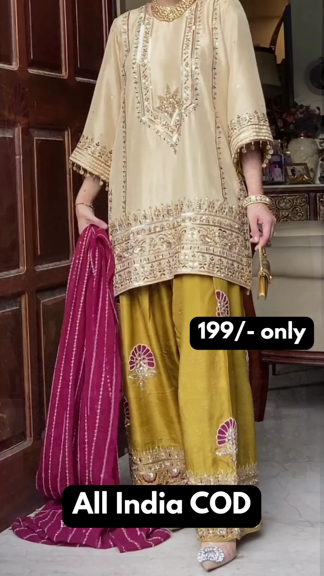 This stunning beige kurta is enriched with intricate golden embroidery along the neckline, sleeves, and hem, giving it a regal finish. It is paired with olive-toned wide-leg bottoms featuring bold embroidered motifs and detailed borders. The deep magenta dupatta adds a striking contrast, enhancing the richness of the ensemble. Perfect for festive occasions, family functions, and celebratory events, this set delivers elegance, comfort, and timeless traditional appeal.