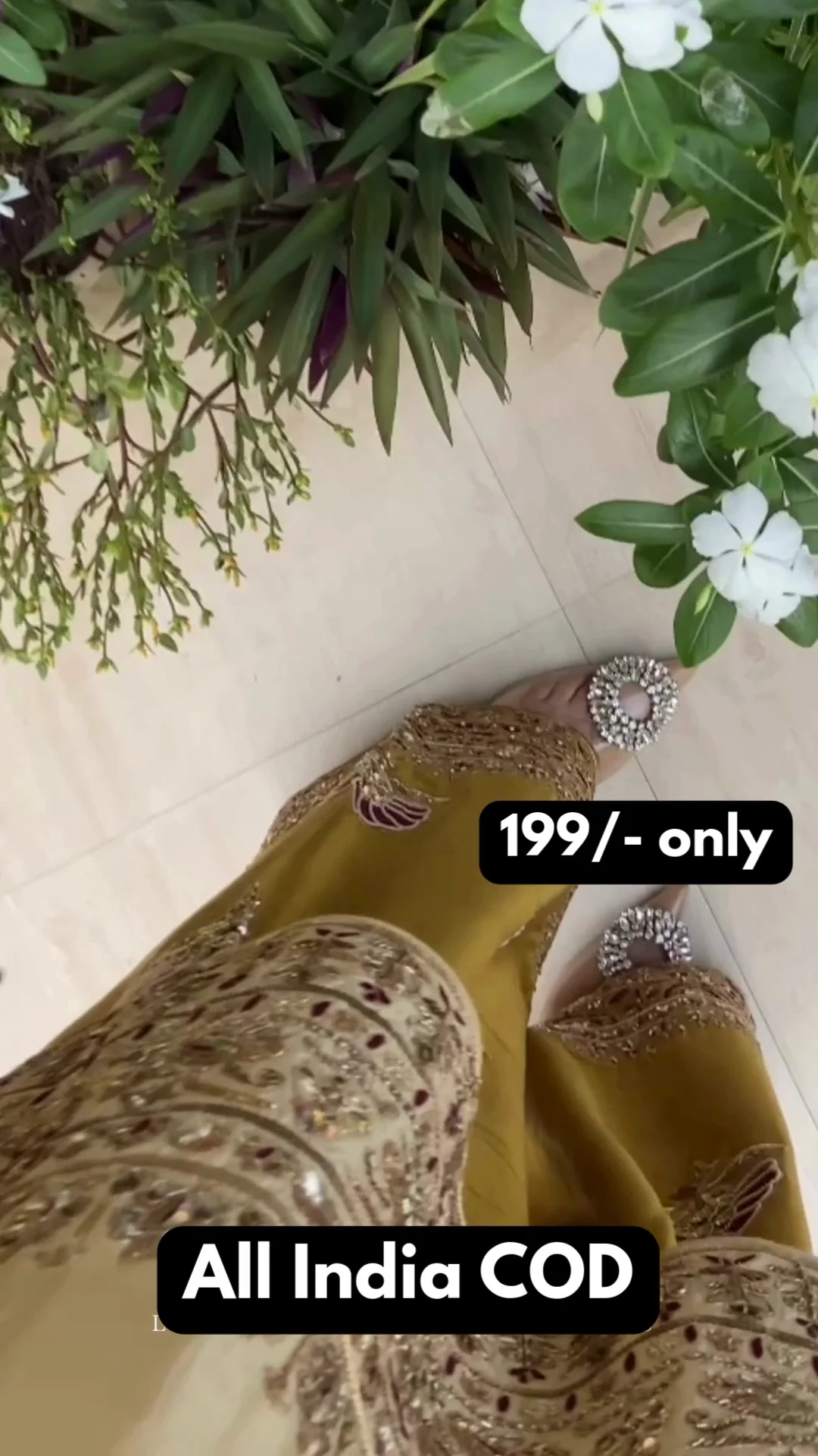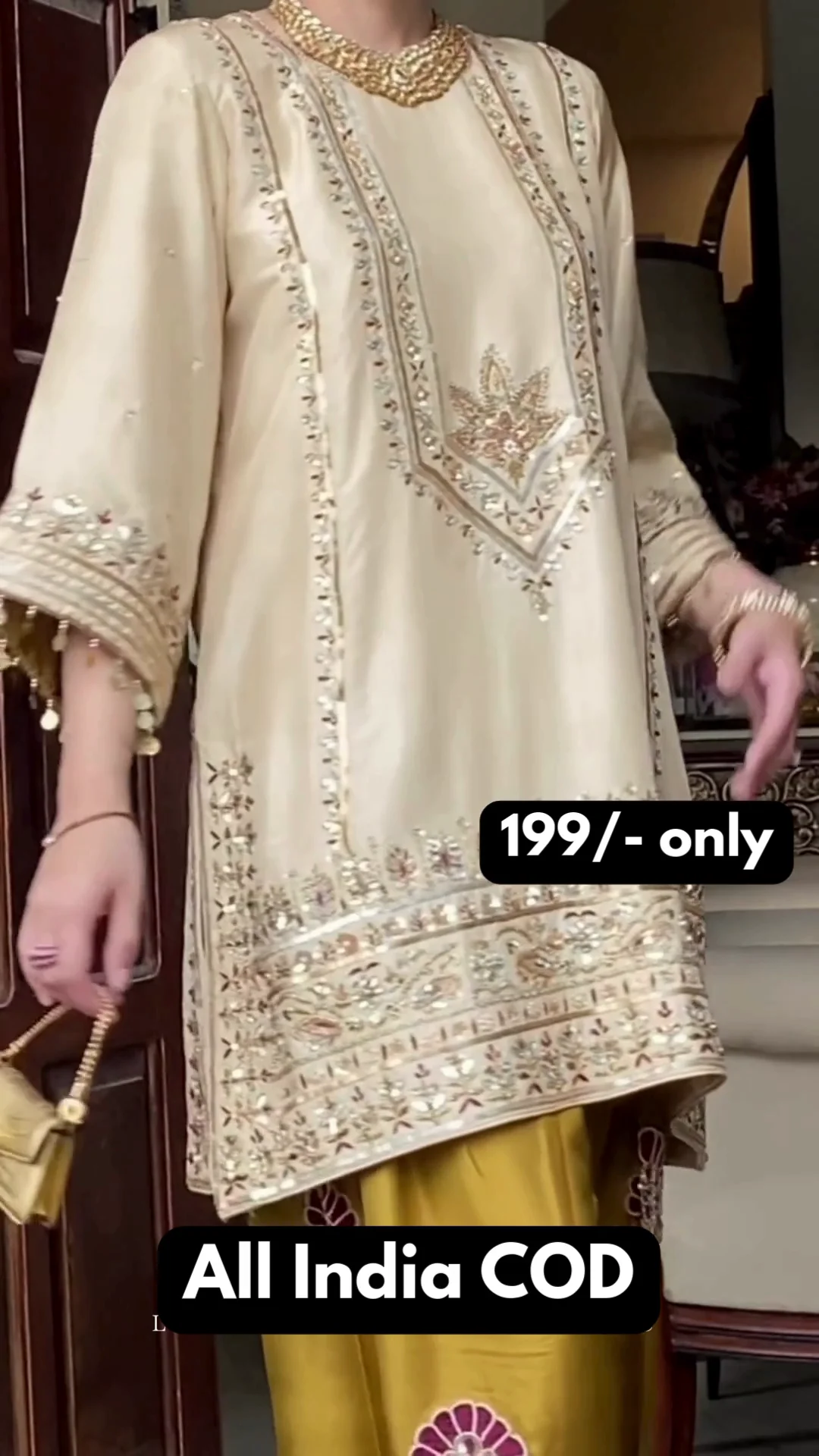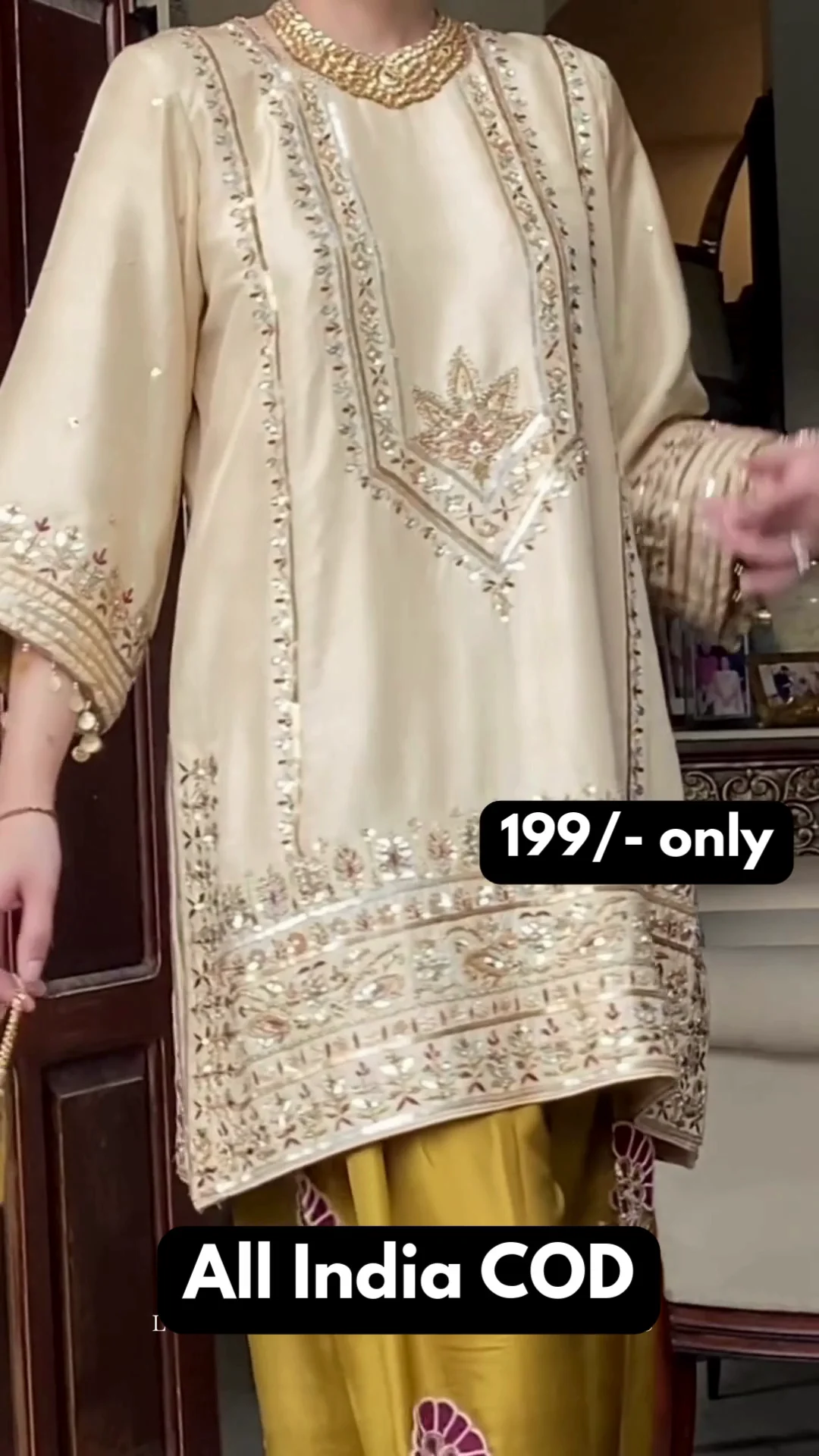 This stunning beige kurta is enriched with intricate golden embroidery along the neckline, sleeves, and hem, giving it a regal finish. It is paired with olive-toned wide-leg bottoms featuring bold embroidered motifs and detailed borders. The deep magenta dupatta adds a striking contrast, enhancing the richness of the ensemble. Perfect for festive occasions, family functions, and celebratory events, this set delivers elegance, comfort, and timeless traditional appeal.