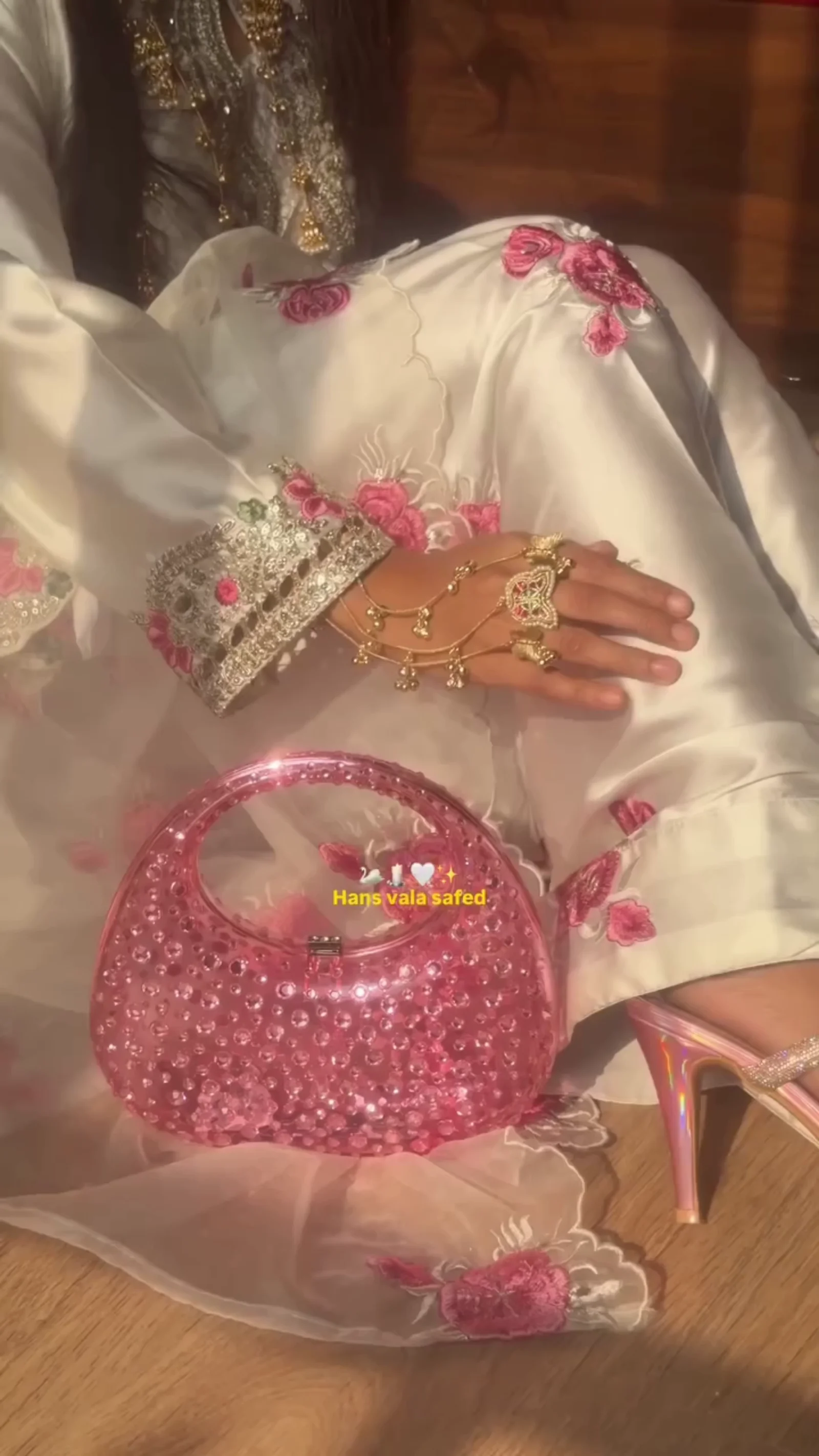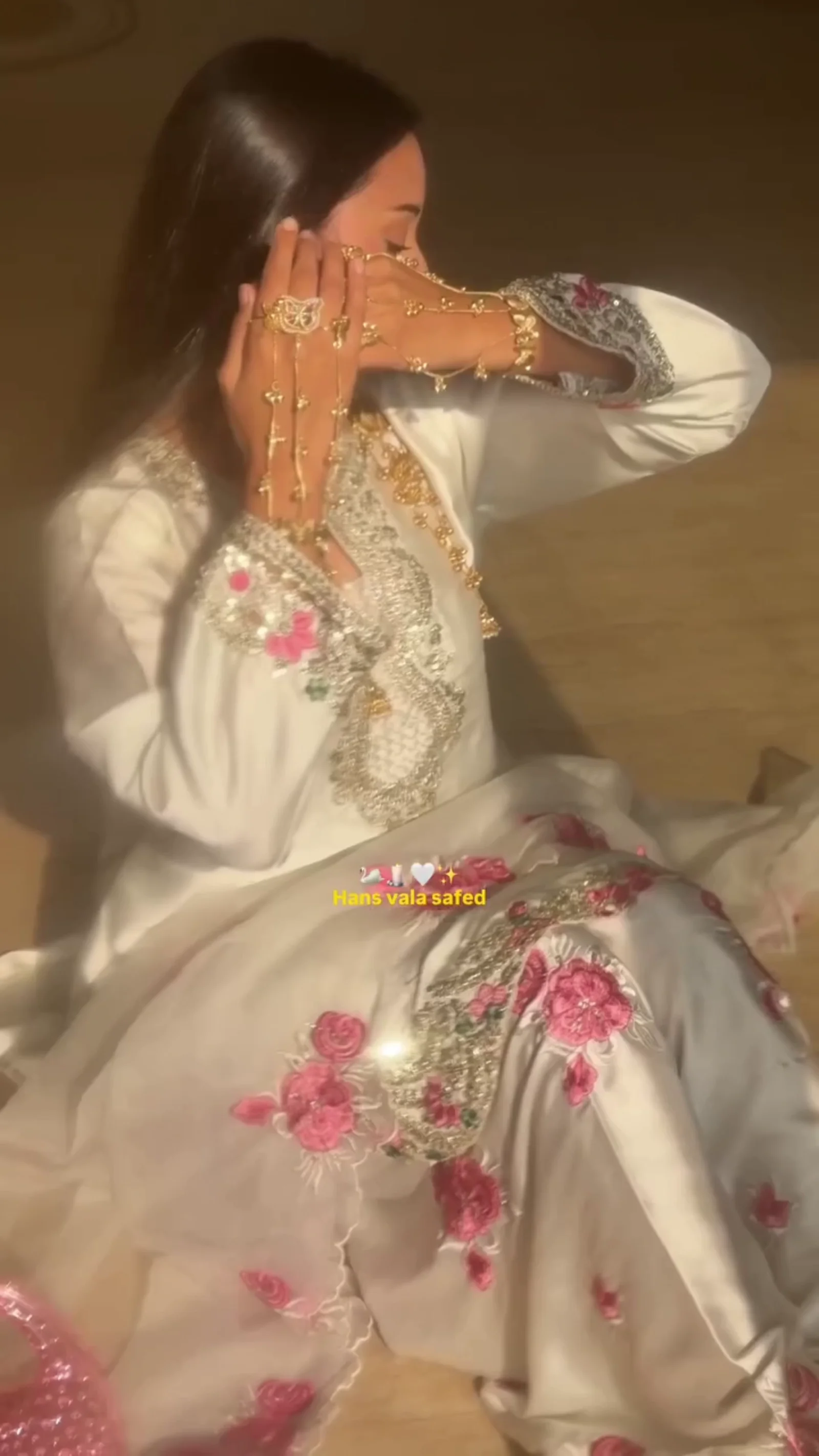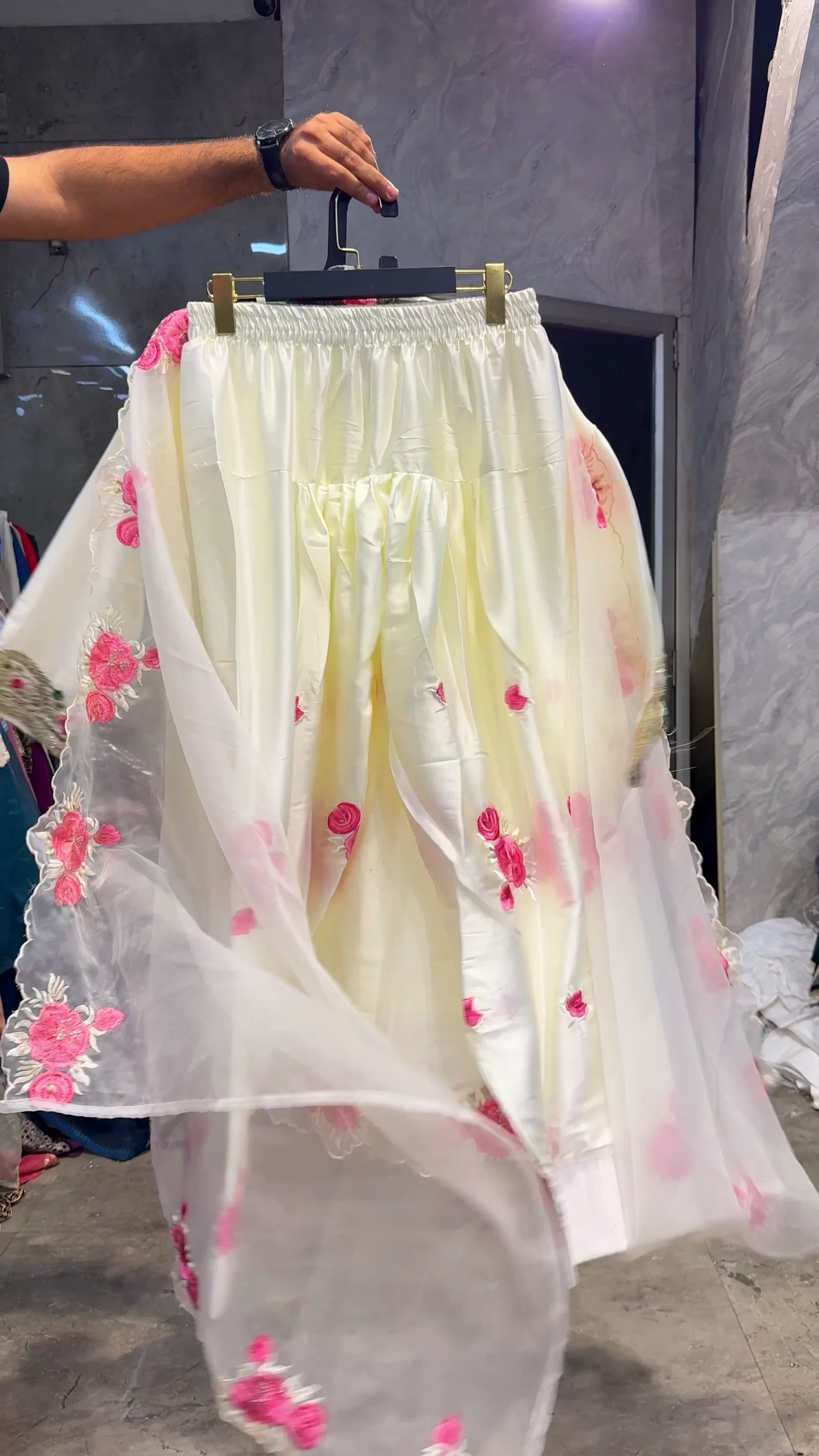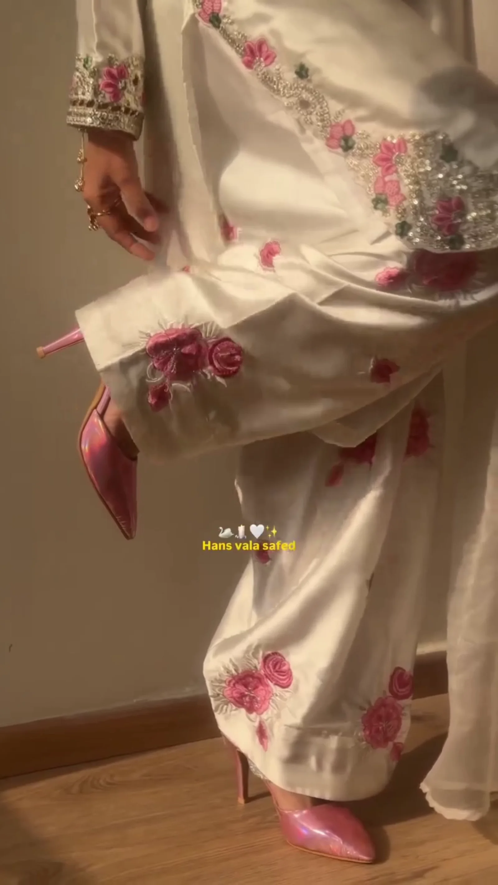 This elegant white suit set is beautifully detailed with soft pink floral embroidery across the kurta, dupatta, and trousers. The neckline features intricate silver embellishment with a keyhole design that adds a refined touch. The hemline and sleeves are finished with delicate embroidered borders, creating a cohesive and graceful look. Paired with a sheer embroidered dupatta and matching bottoms, this outfit is ideal for festive gatherings, daytime functions, and special occasions. The light color palette gives it a fresh and sophisticated appeal.This elegant white suit set is beautifully detailed with soft pink floral embroidery across the kurta, dupatta, and trousers. The neckline features intricate silver embellishment with a keyhole design that adds a refined touch. The hemline and sleeves are finished with delicate embroidered borders, creating a cohesive and graceful look. Paired with a sheer embroidered dupatta and matching bottoms, this outfit is ideal for festive gatherings, daytime functions, and special occasions. The light color palette gives it a fresh and sophisticated appeal.