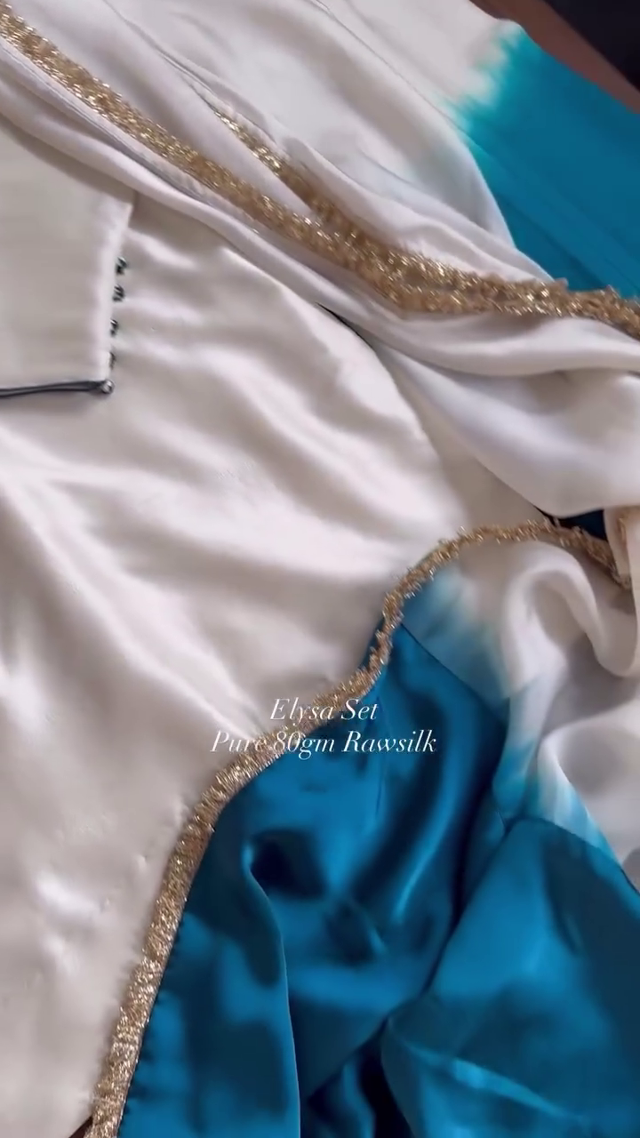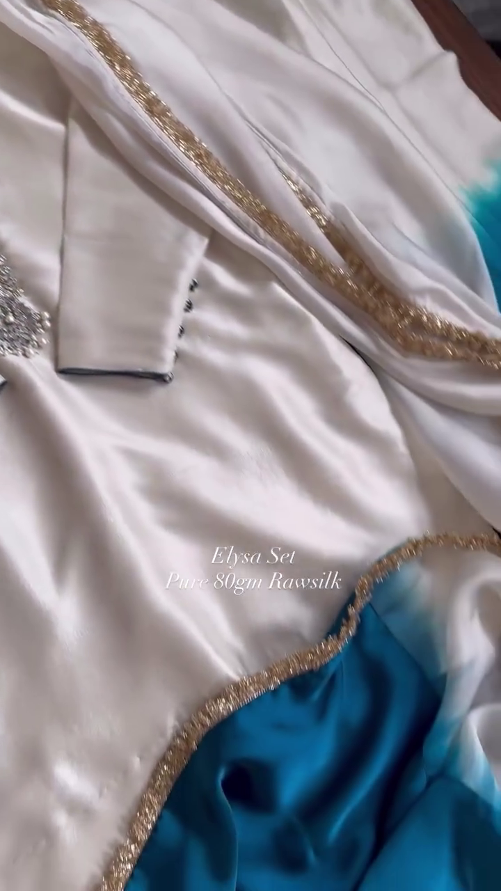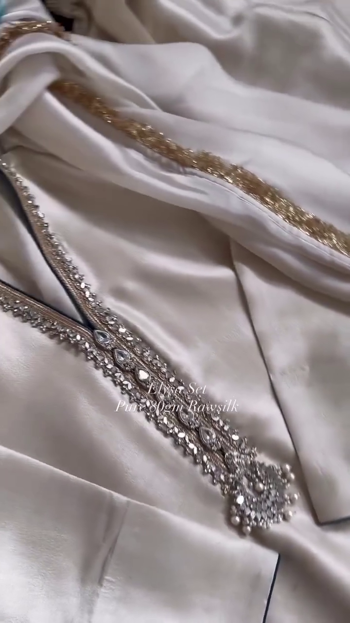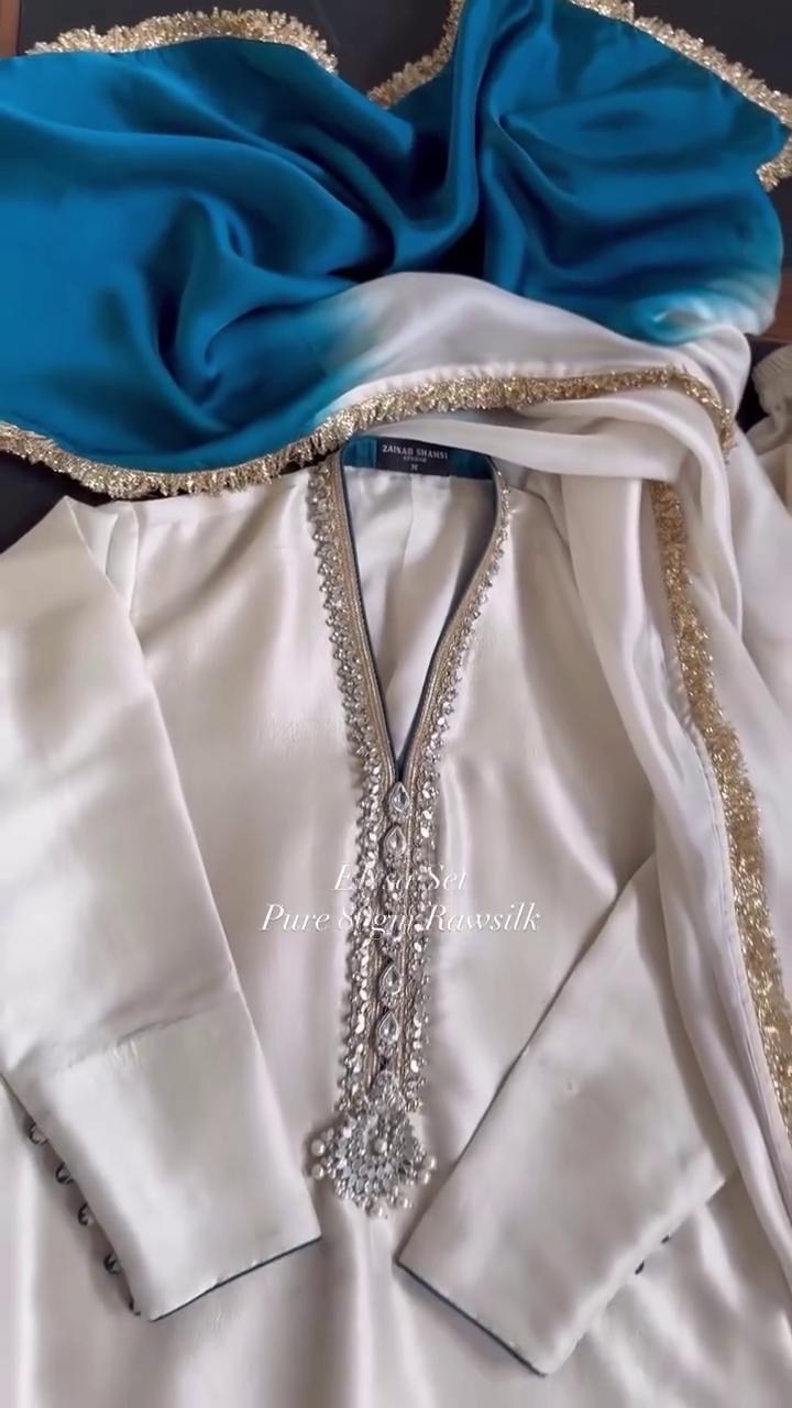 This ivory suit set is crafted in rich raw silk fabric, featuring delicate stone and bead embellishments along the neckline. The matching dupatta is bordered with fine golden detailing, adding a subtle shimmer to the overall look. The straight-cut kurta paired with coordinating bottoms offers a timeless and sophisticated silhouette. Ideal for formal events, festive occasions, and elegant evening wear, this ensemble combines simplicity with refined craftsmanship.