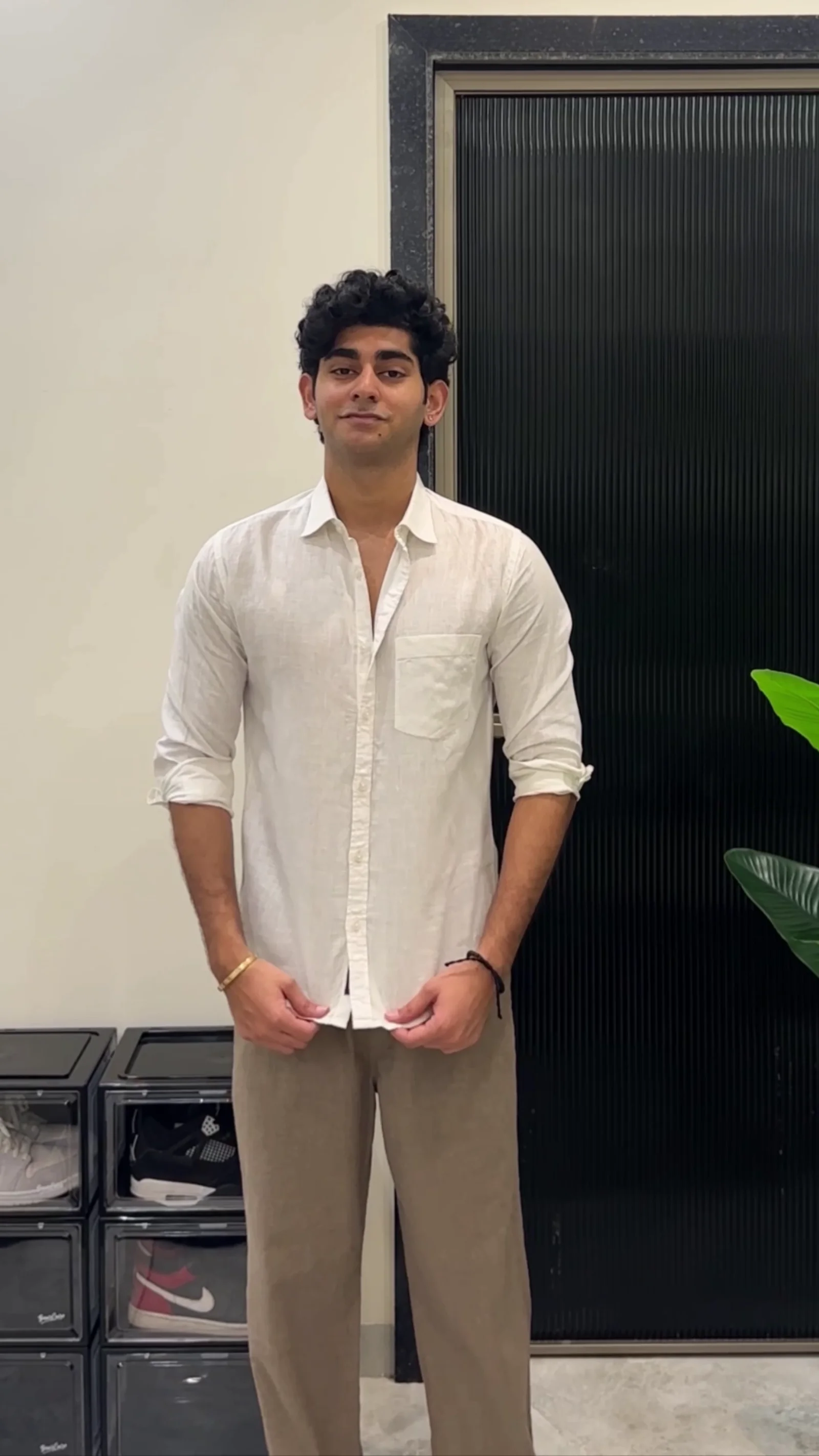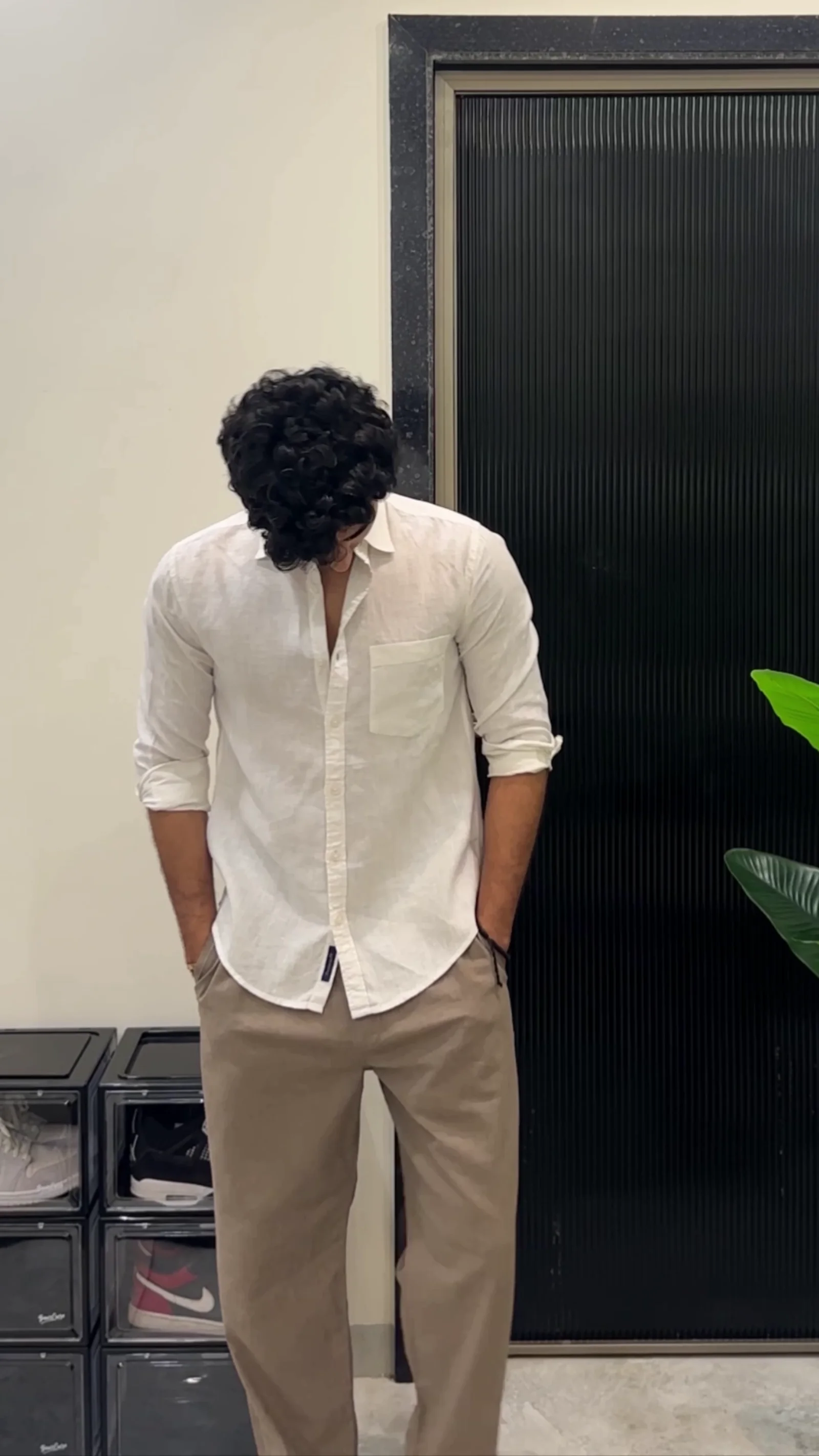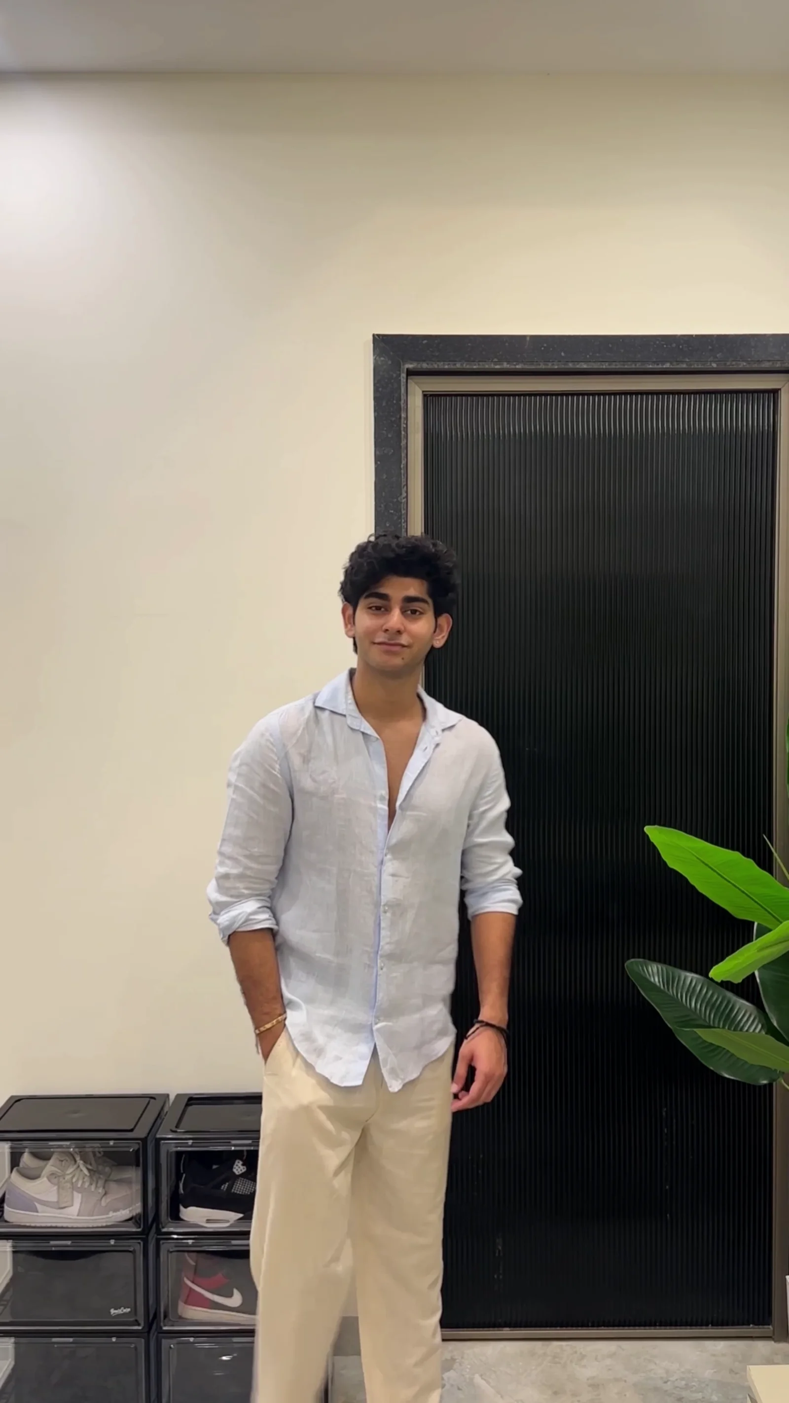 This stylish outfit features a light blue linen shirt paired with cream-colored pants, creating a clean and sophisticated look. The breathable linen fabric makes the shirt ideal for warm weather, offering both comfort and elegance. Its relaxed fit and open collar design provide a modern and effortless appearance. The cream pants complement the shirt perfectly, creating a balanced and refined outfit suitable for casual gatherings, vacations, or semi-formal occasions. This combination delivers a timeless style that is both simple and fashionable.
