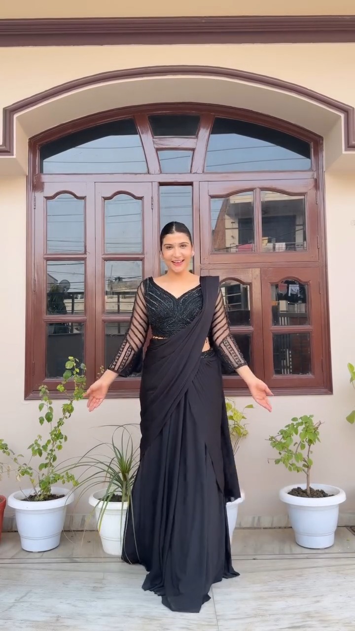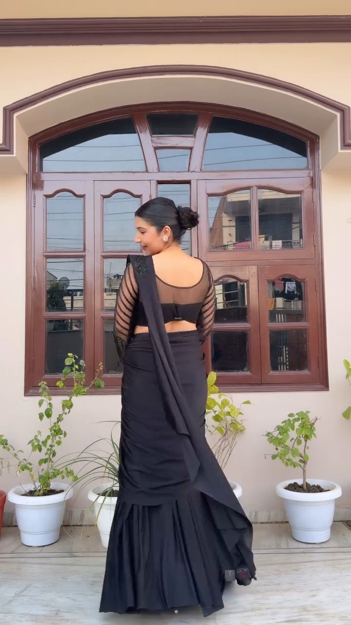 This saree brings a bold and refined presence with its all-black design, making it a standout choice for evening events and special occasions. The smooth, flowing fabric creates a sleek drape that enhances the silhouette, while the matching blouse with sheer striped sleeves adds a contemporary and stylish twist. The subtle texture on the blouse contrasts beautifully with the plain saree, giving the outfit depth without relying on heavy embellishments. Its monochrome palette makes it effortlessly elegant and easy to accessorize, whether styled minimally or with statement pieces. The overall look is modern, confident, and ideal for those who prefer a clean yet impactful outfit. This ensemble is perfect for formal gatherings, parties, or occasions where a sophisticated appearance is desired, combining simplicity with strong visual appeal.