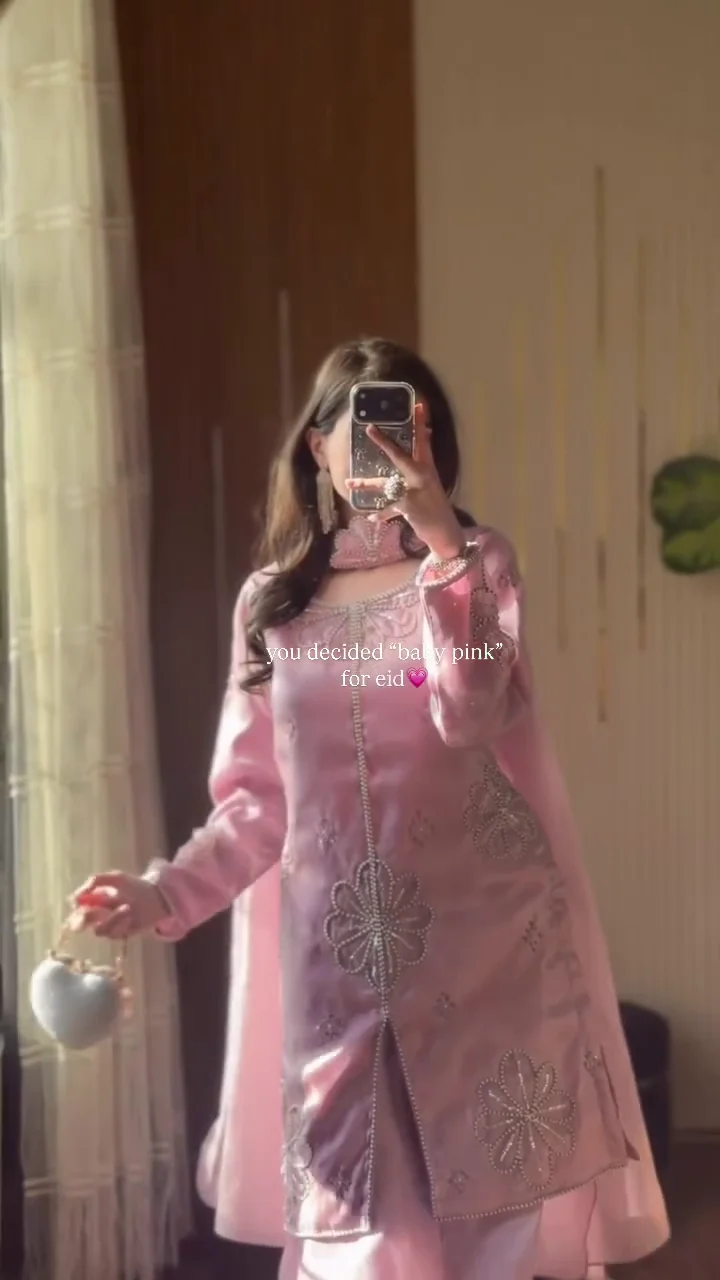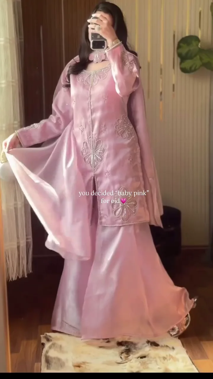 A sophisticated baby pink kurta and sharara set designed with delicate embroidery and a flowing silhouette. The soft pastel shade combined with elegant detailing creates a graceful festive outfit. Perfect for Eid celebrations, festive gatherings, and evening events.
