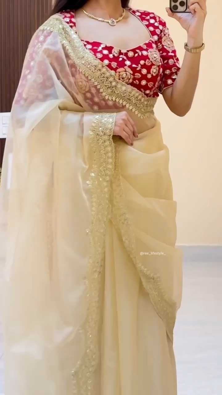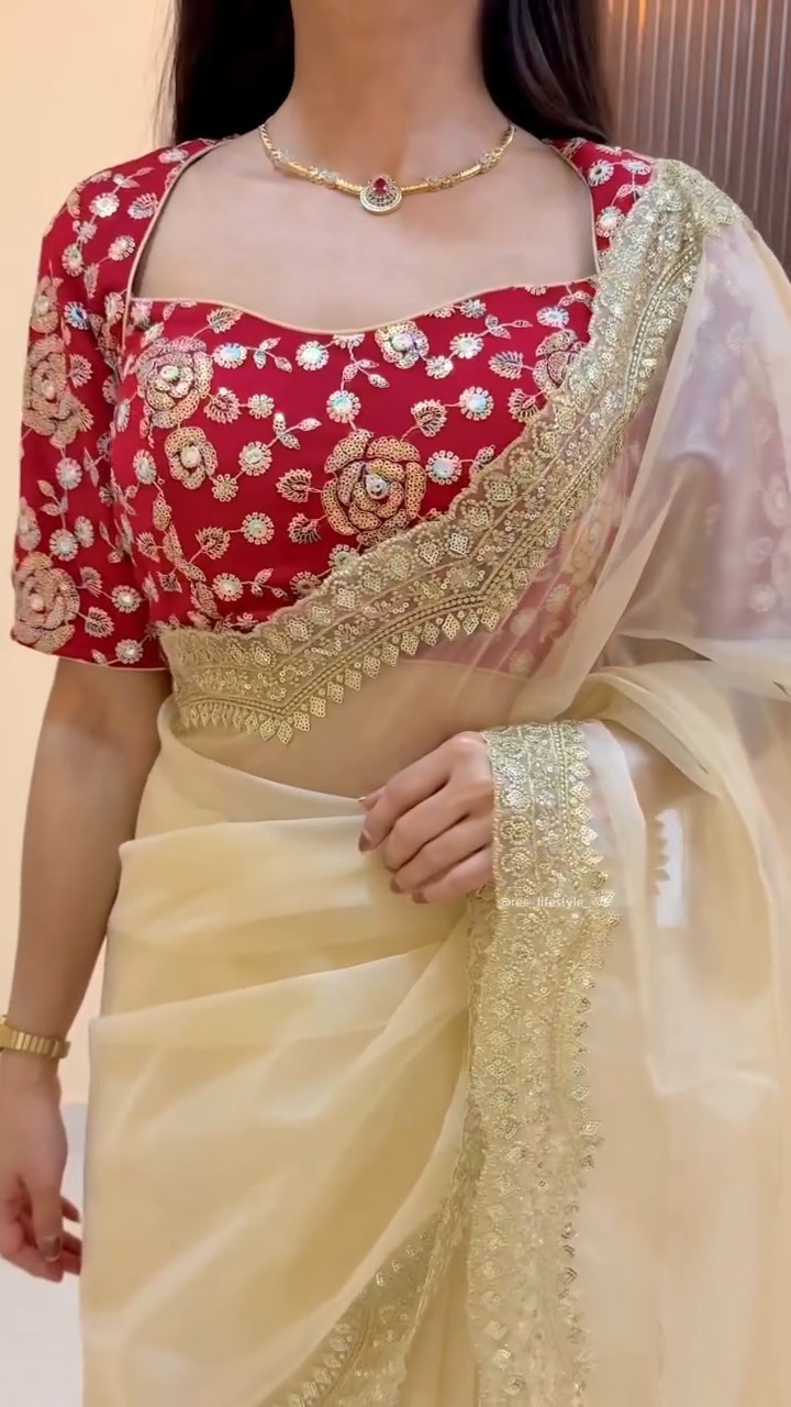 This outfit features a graceful cream saree paired with a richly designed red blouse, creating a striking contrast that blends elegance with festive charm. The saree is crafted from a lightweight, flowy fabric that drapes smoothly, while its detailed embroidered border adds a touch of sophistication and traditional artistry. The blouse stands out with intricate floral patterns and a structured fit, enhancing the overall look with a bold and refined appeal. The soft cream tone of the saree balances the vibrant red, making the ensemble visually appealing without being overwhelming. Ideal for celebrations, weddings, or special gatherings, this combination offers a perfect mix of classic and contemporary styling. The delicate detailing and harmonious color pairing make it suitable for those who appreciate refined ethnic wear with a standout element.