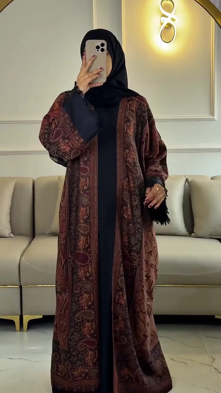 This elegant paisley print open abaya is designed for women who love modest fashion with a touch of sophistication. The rich brown and maroon paisley pattern gives the outfit a classic and luxurious appearance, making it perfect for casual outings, gatherings, or special occasions. The loose and flowy silhouette ensures comfort while maintaining a graceful and stylish look.