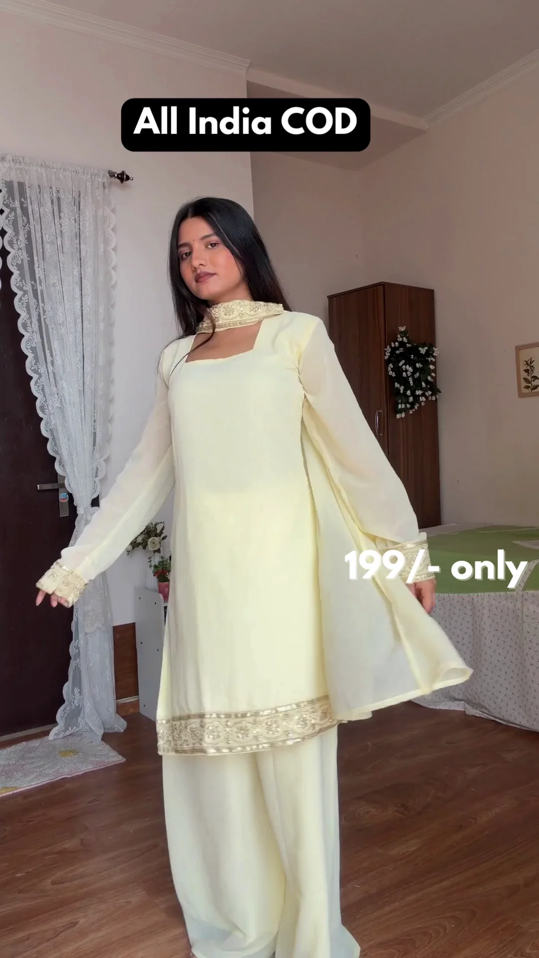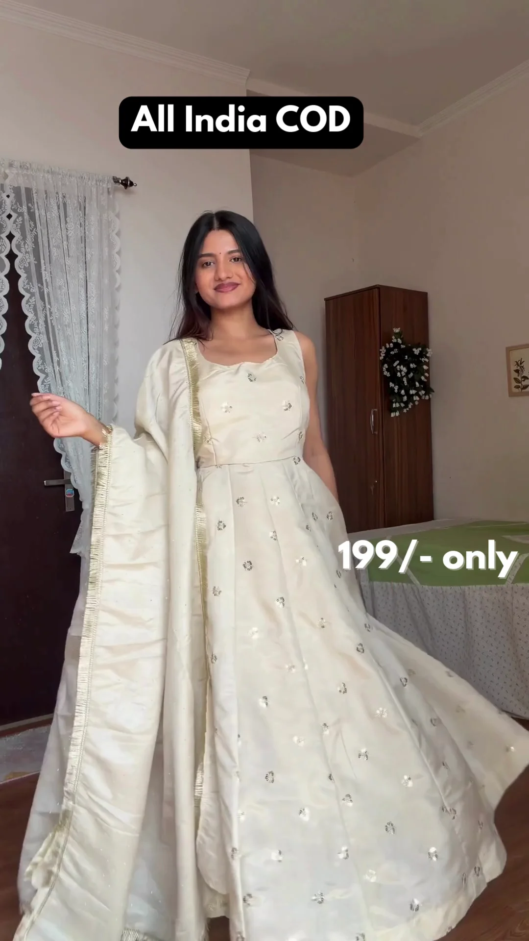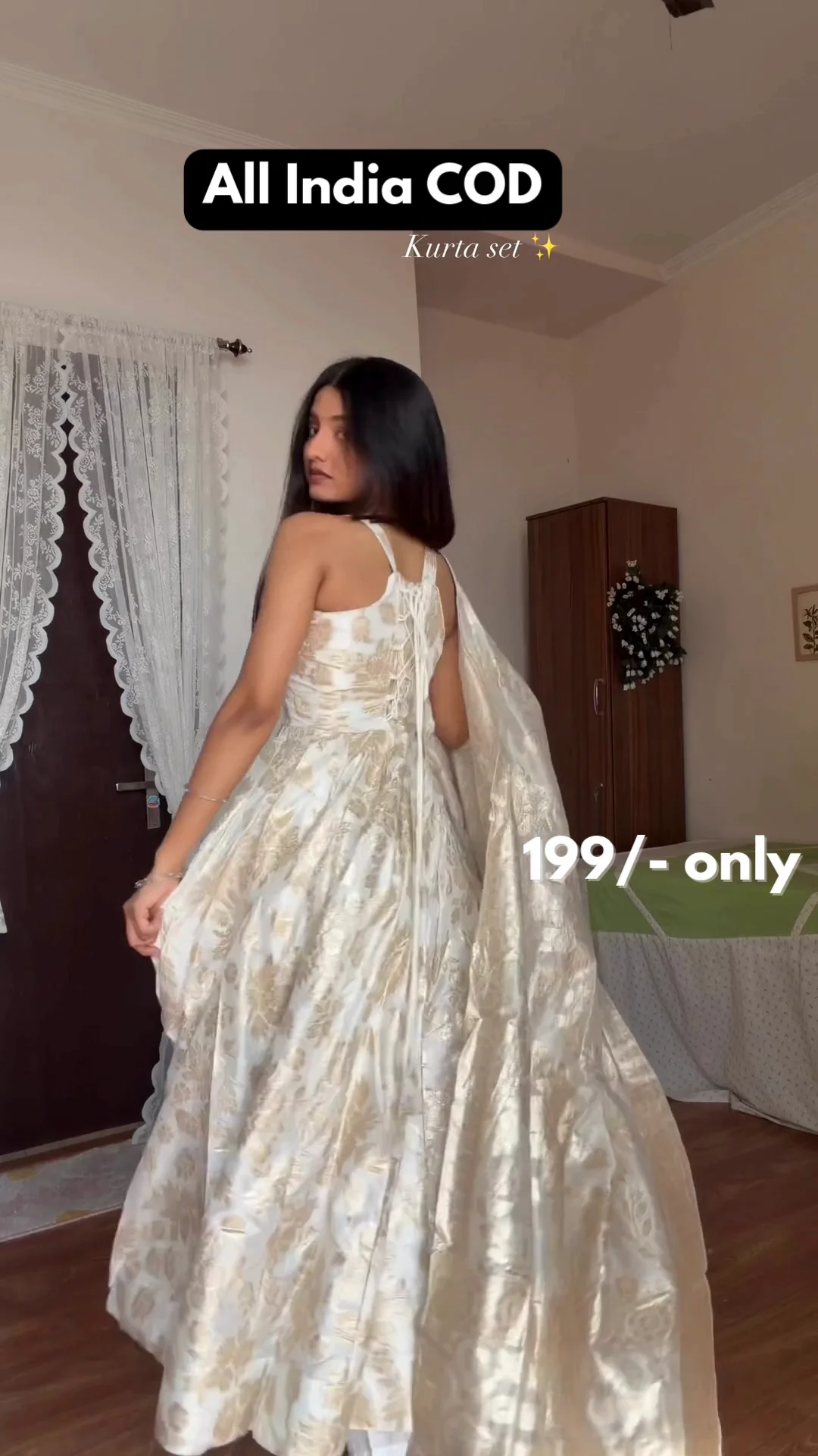 A stunning ivory and gold brocade Anarkali set crafted with rich floral patterns that give the outfit a regal appeal. The flared silhouette and matching dupatta add elegance and movement, making it perfect for festive events, weddings, and traditional celebrations.