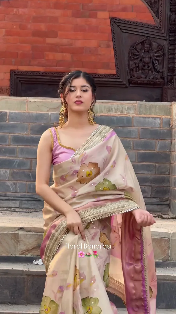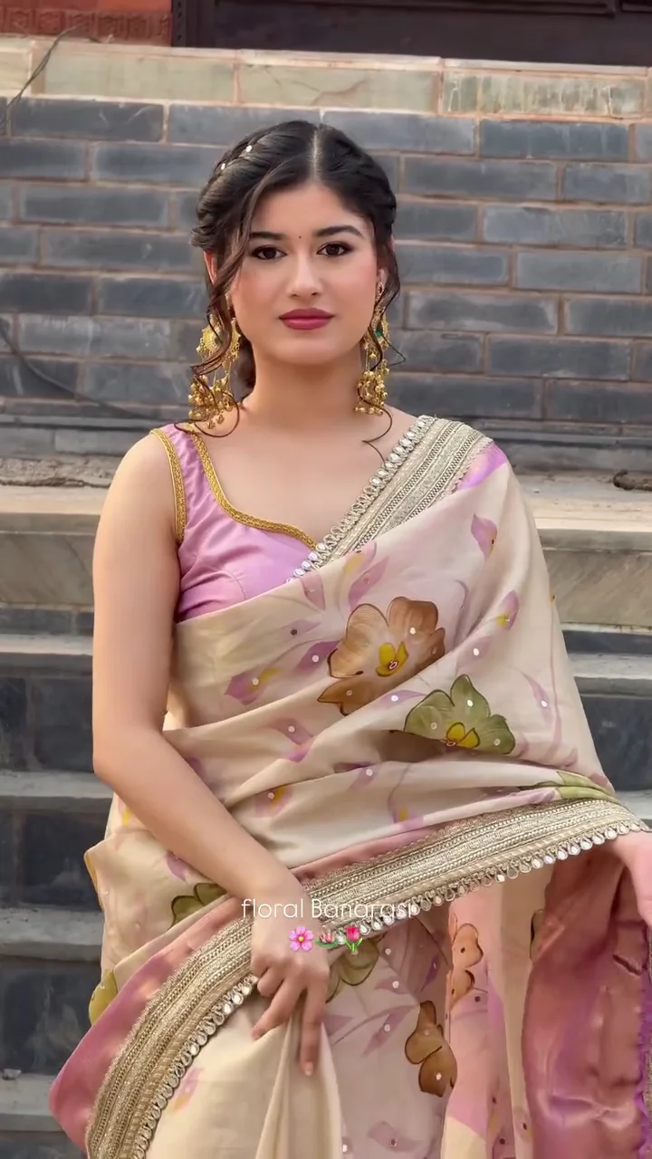 This floral Banarasi saree features delicate botanical motifs woven across a soft pastel base, creating a refined and feminine aesthetic. The subtle sheen of the fabric combined with an elegant border adds sophistication to the overall design. Ideal for daytime celebrations, cultural events, and festive gatherings, this saree offers a perfect balance of tradition and contemporary style.