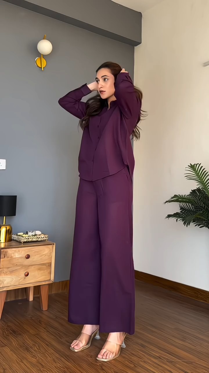 This outfit features a refined plum-colored co-ord set that combines simplicity with a strong, polished presence. The top is designed with a clean button-down style and a relaxed fit, offering both structure and comfort for all-day wear. Paired with wide-leg trousers, the ensemble creates a balanced silhouette that feels modern and effortlessly elegant. The rich plum shade adds depth and sophistication, making it suitable for both work settings and semi-formal occasions. The smooth fabric enhances the overall finish, allowing the outfit to drape neatly while maintaining a crisp appearance. Its minimal design makes it easy to style with subtle accessories, letting the color and fit take center stage. This co-ord set is ideal for those who prefer understated fashion with a confident and contemporary edge.