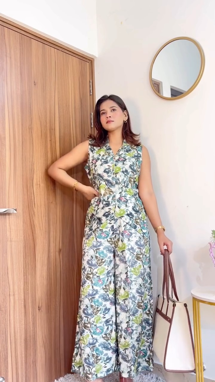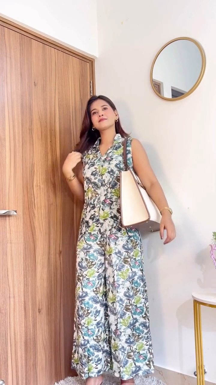 This outfit features a stylish sleeveless jumpsuit adorned with soft floral prints that create a fresh and effortless look. The design includes a collared neckline that adds a structured touch, balancing the relaxed feel of the outfit. The fitted upper portion flows into wide-leg pants, offering a comfortable yet flattering silhouette that allows ease of movement throughout the day. The blend of muted and vibrant tones in the print gives the jumpsuit a lively yet refined appearance, making it suitable for casual outings, brunches, or daytime events. Its lightweight fabric enhances comfort, especially in warm weather, while the all-in-one design makes styling simple and convenient. This piece is ideal for those who enjoy easy, fashionable outfits that combine practicality with a modern, feminine aesthetic.