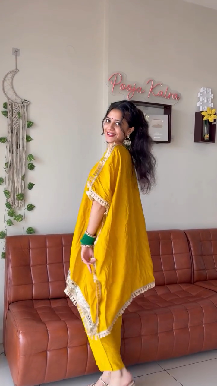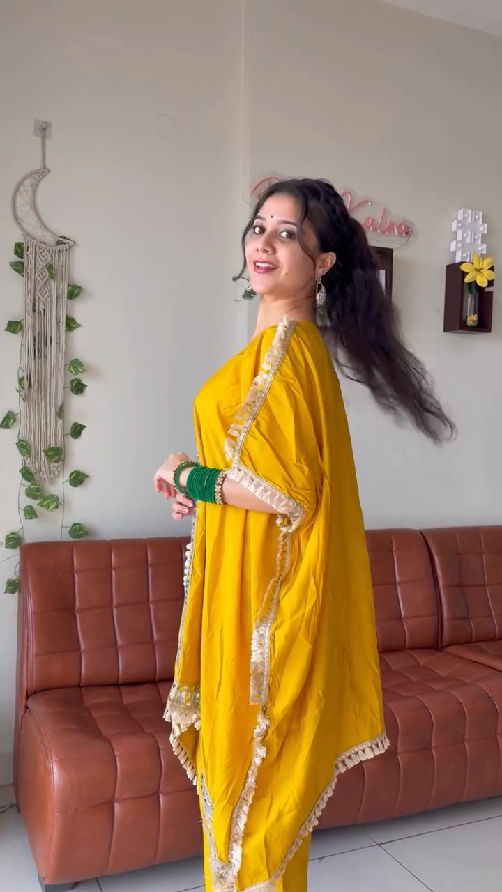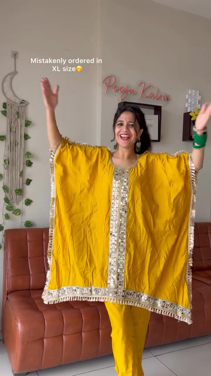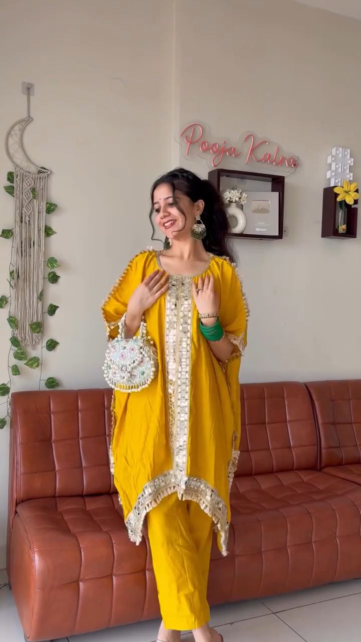 Brighten up your ethnic wardrobe with this stunning mustard yellow kaftan-style kurta set that blends comfort with festive elegance. The kurta features a relaxed, flowy silhouette enhanced with intricate embellishments along the neckline and center panel, adding a touch of subtle shimmer and sophistication. Delicate tassel detailing along the edges further elevates its charm, giving it a graceful and handcrafted appeal. Paired with matching straight pants, this outfit offers a perfect balance of style and ease, making it ideal for festive gatherings, casual celebrations, or day events. The lightweight fabric ensures all-day comfort while maintaining a chic and polished look. Style it with statement accessories or keep it minimal for an effortlessly elegant appearance that stands out with its vibrant color and refined detailing.