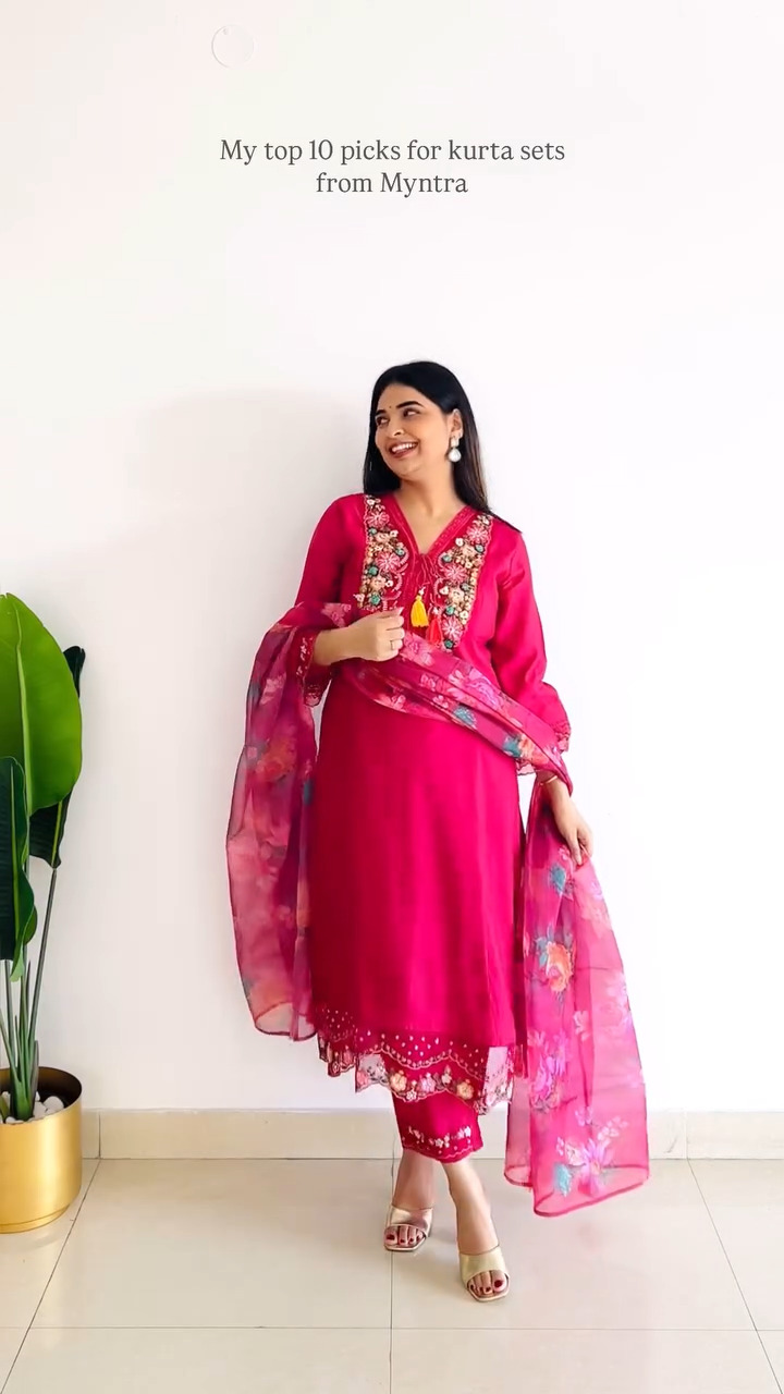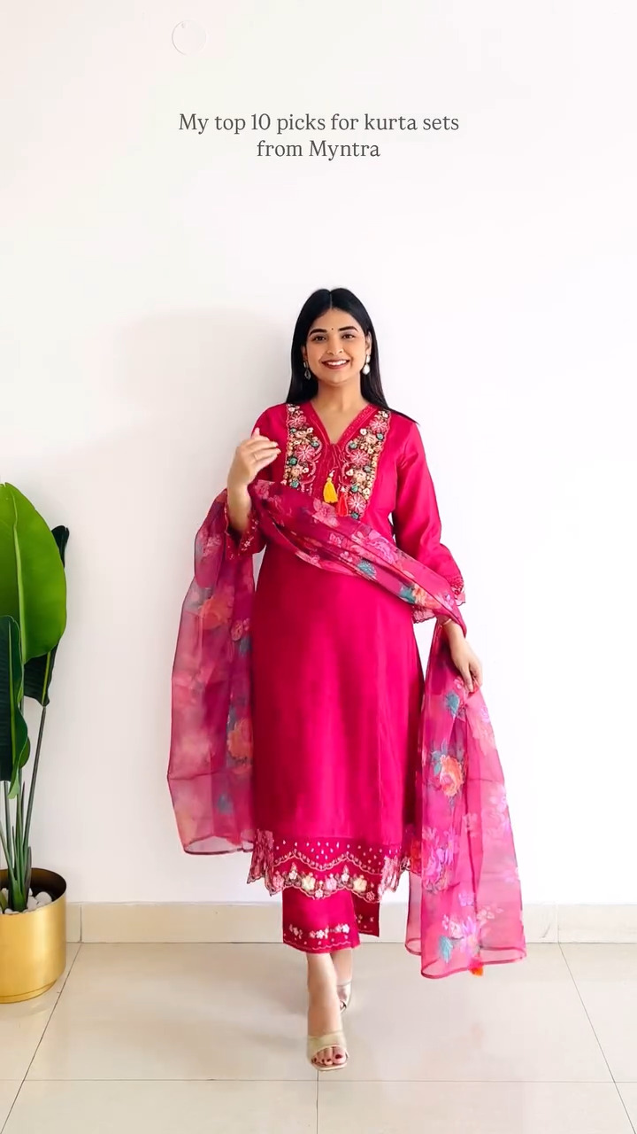 Add a pop of color to your festive wardrobe with this vibrant pink kurta set designed to radiate elegance and charm. The kurta features intricate floral embroidery around the neckline and sleeves, beautifully enhancing its rich tone while adding a touch of detailed craftsmanship. Its straight silhouette offers a flattering and comfortable fit, making it suitable for both festive occasions and special gatherings. Paired with matching pants that feature subtle embroidery and a lightweight floral printed dupatta, this ensemble creates a perfectly balanced and graceful look. The soft fabric ensures ease of movement while maintaining a polished appearance throughout the day. Style it with statement earrings and classic heels to complete a stunning outfit that effortlessly blends tradition with modern sophistication.