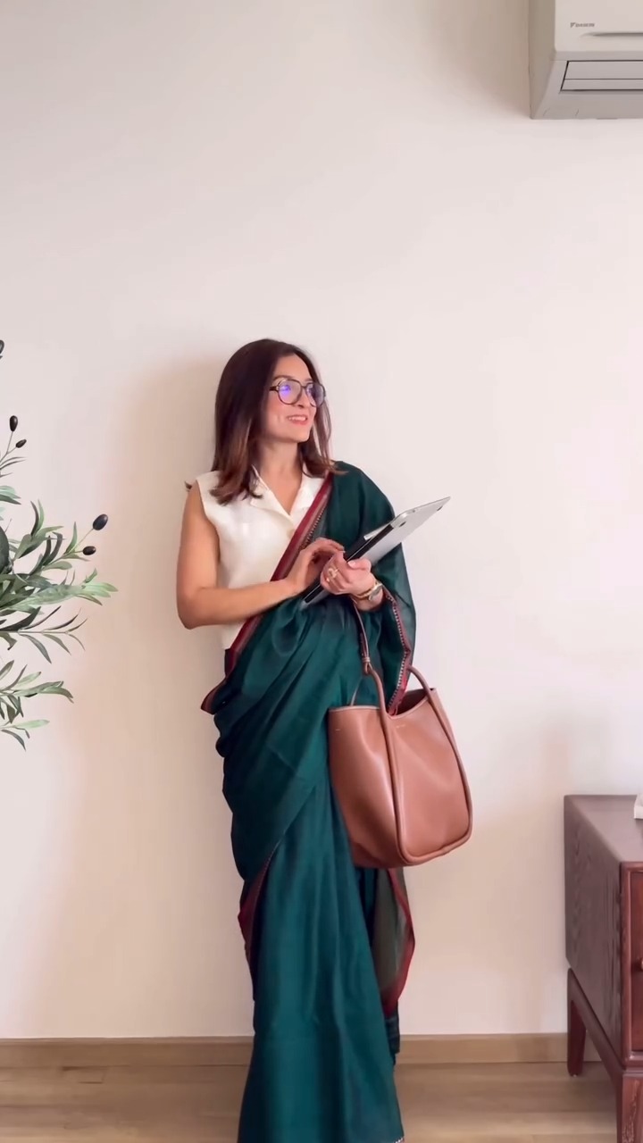 This outfit features a sophisticated deep green saree designed with a subtle contrasting border, offering a timeless yet versatile appeal suitable for both professional and casual settings. The saree is paired with a modern sleeveless blouse in a light neutral tone, creating a balanced fusion of traditional and contemporary fashion. The fabric appears lightweight and flowy, ensuring comfort while maintaining a graceful drape that enhances the overall silhouette. This style is ideal for working professionals, social gatherings, or day events where elegance meets practicality. The minimalistic design allows easy accessorizing, making it adaptable to various personal styles and occasions. Its refined color palette and clean finish make it a wardrobe essential for those who appreciate understated fashion with cultural roots. Please note that this description is created based on visual interpretation only and does not reference or reproduce any proprietary brand, design ownership, or copyrighted material.