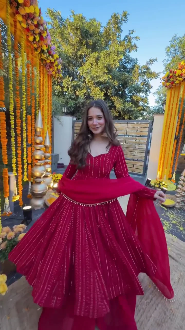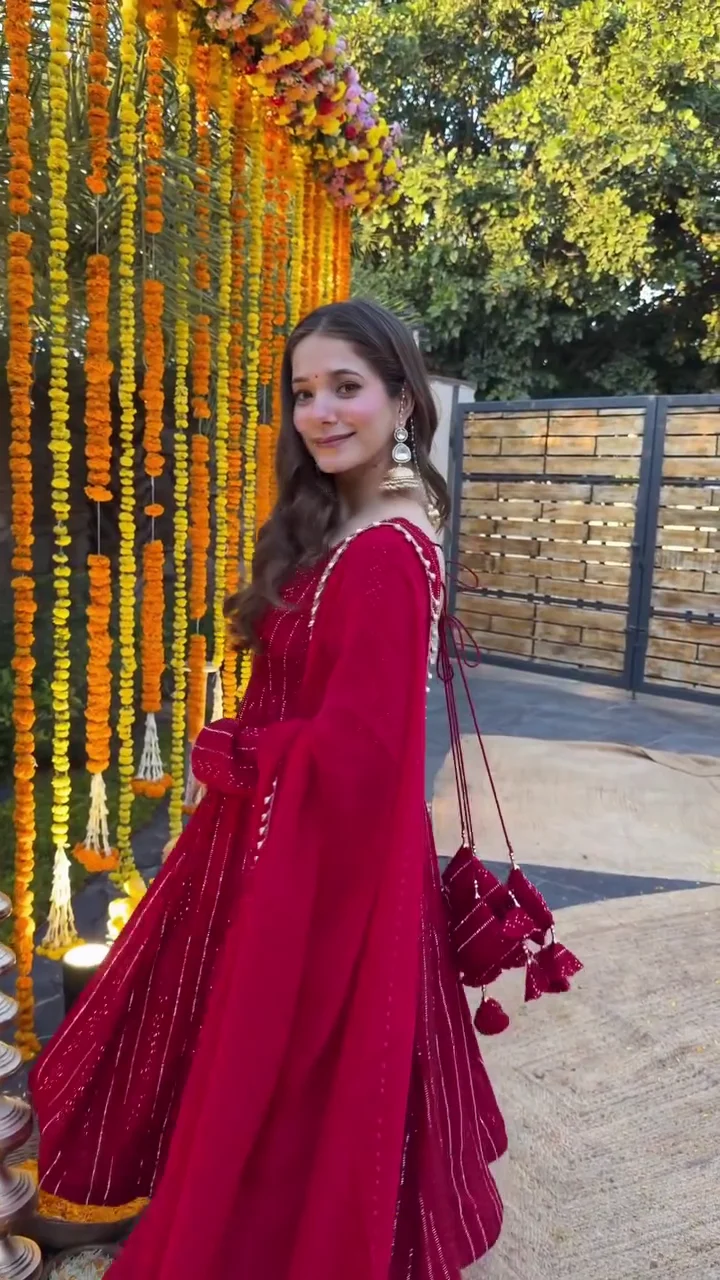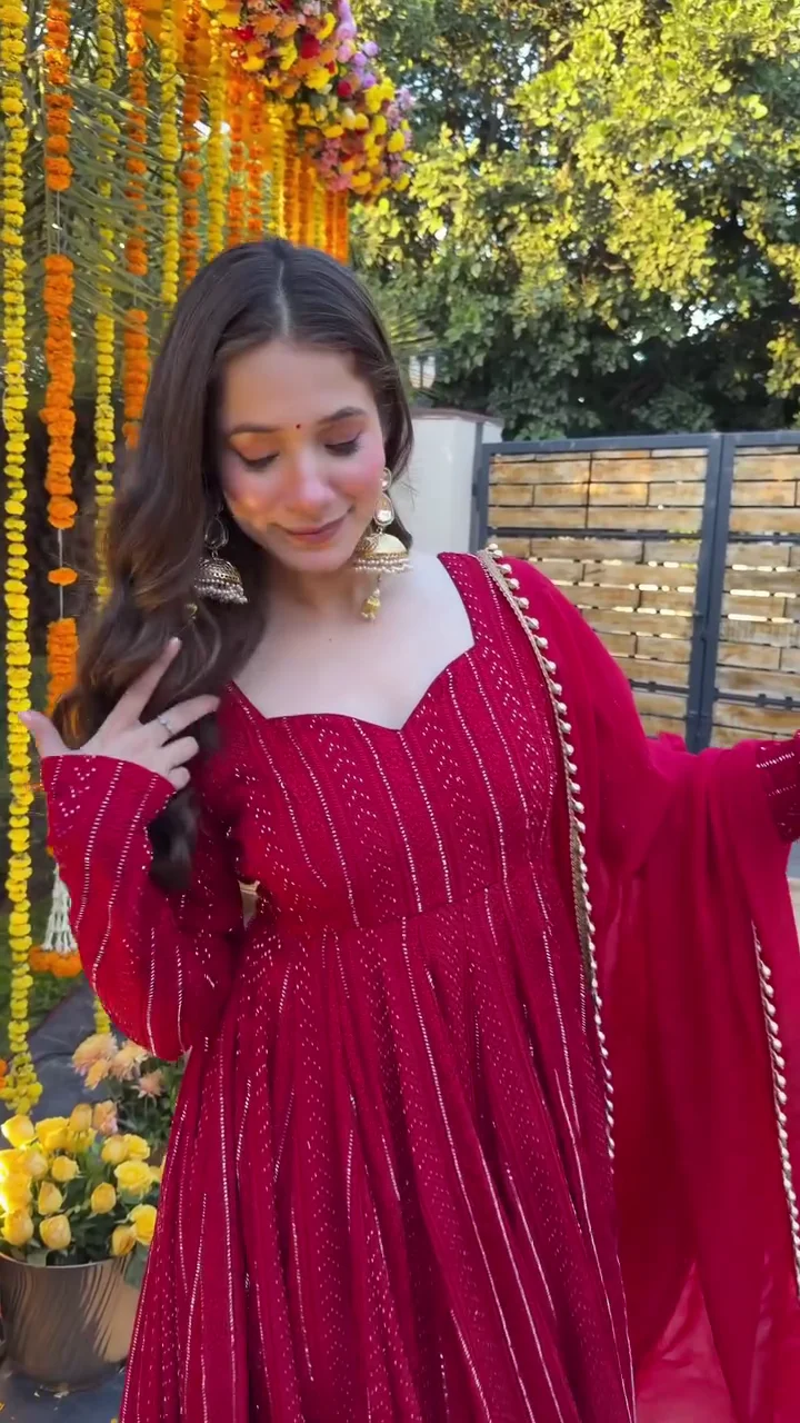 A graceful wine red Anarkali suit designed with fine vertical embellishment that enhances the flow and elegance of the outfit. The flared kurta is paired with a matching bottom and dupatta, making it perfect for festive occasions, family functions, and celebrations. The rich color and soft drape create a flattering silhouette suitable for all body types.