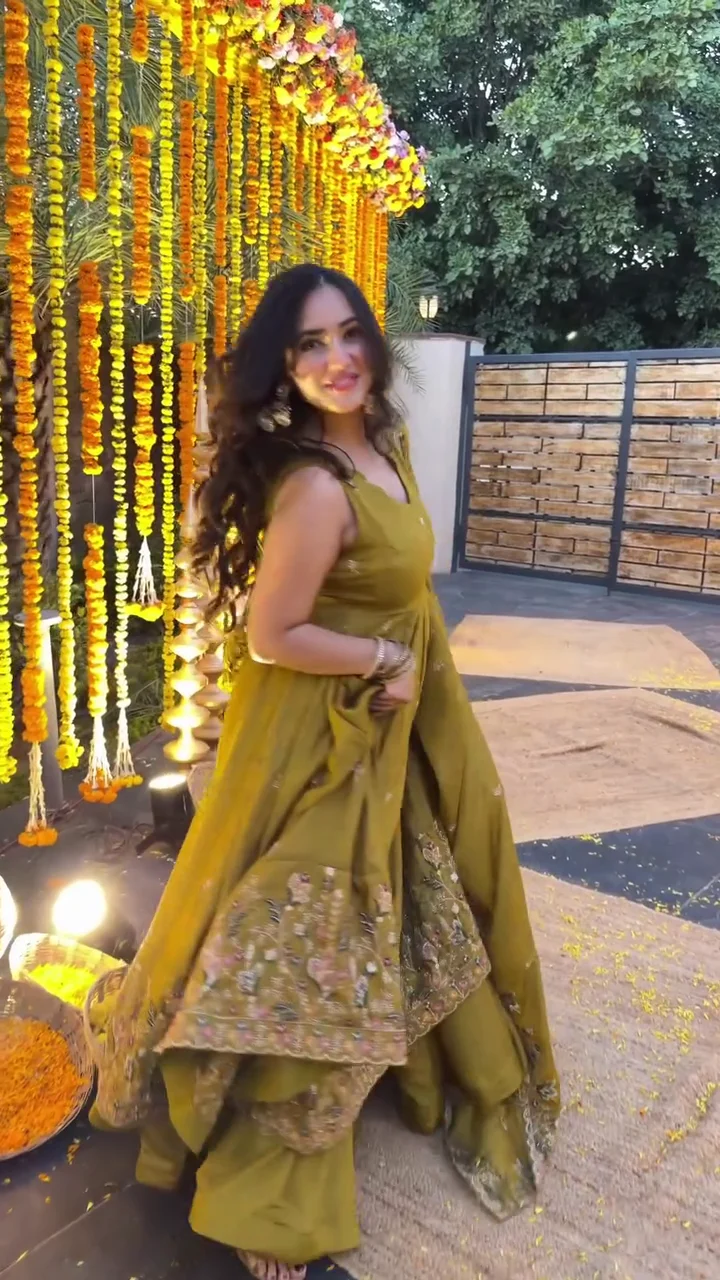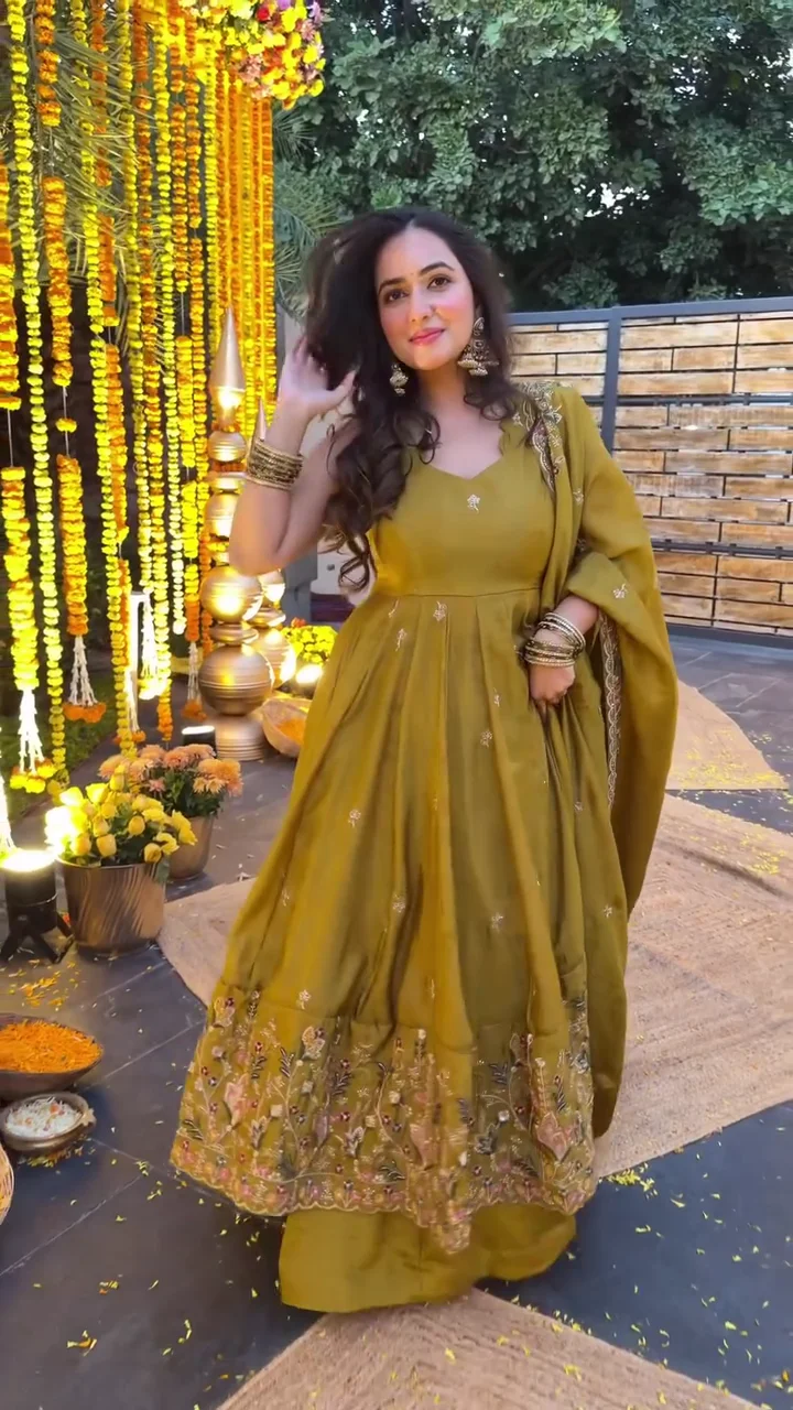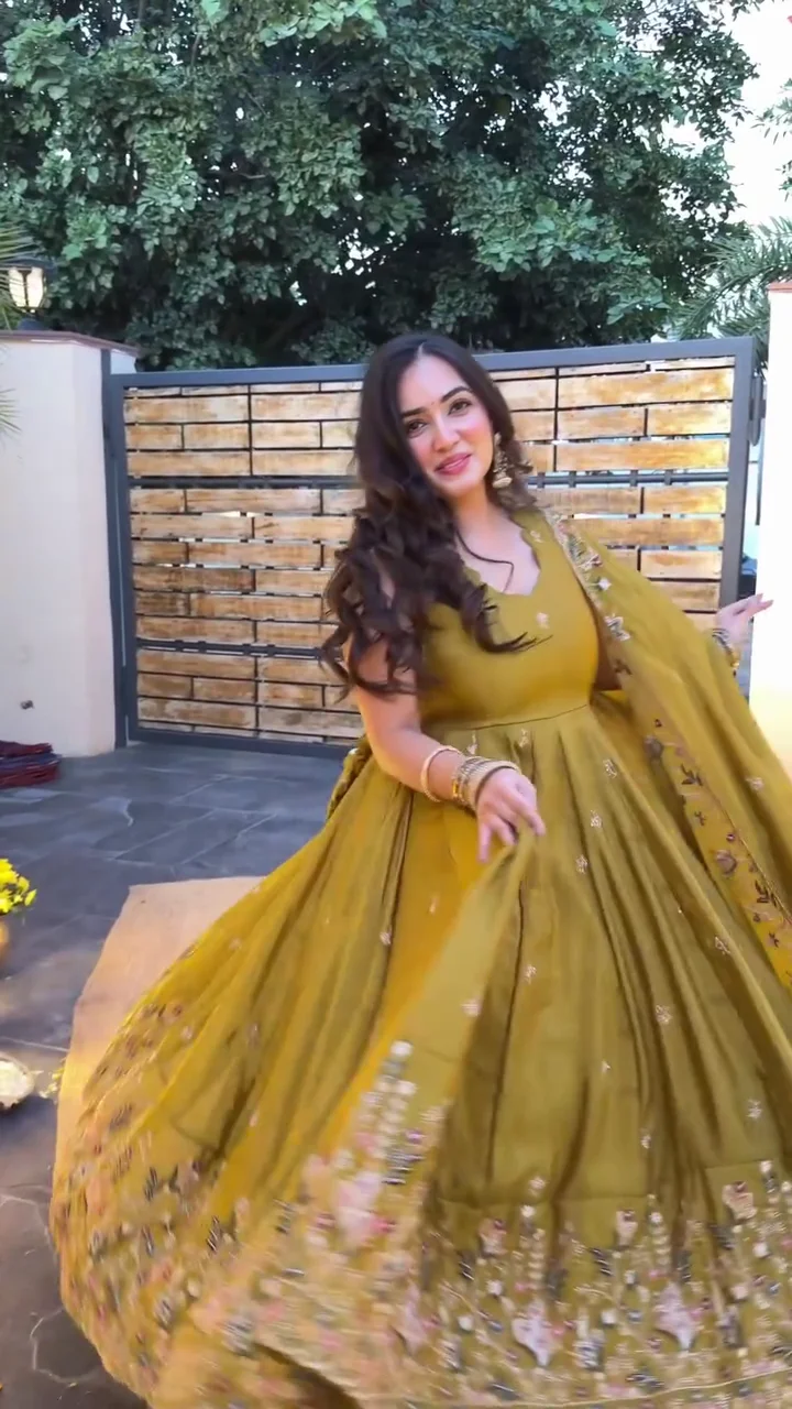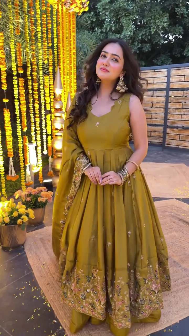 An elegant olive green Anarkali suit adorned with delicate embroidery along the hem and subtle motifs throughout. The outfit includes a matching dupatta and bottom, offering a refined traditional look. Suitable for festive wear, poojas, and daytime celebrations, this piece blends classic design with contemporary color appeal.