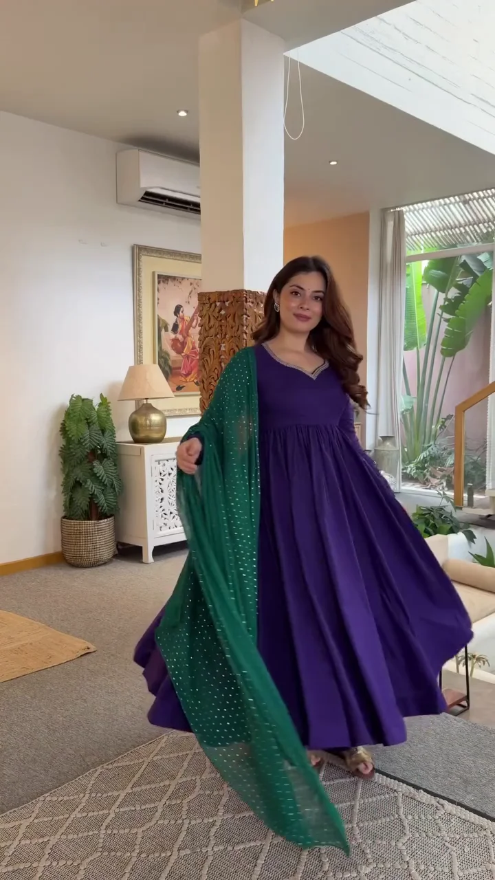 This deep purple Anarkali suit is designed with a flowing silhouette and a neatly finished neckline, paired with a contrasting green dupatta. The combination adds visual interest while maintaining a traditional aesthetic. Perfect for festive gatherings, cultural events, and evening functions.