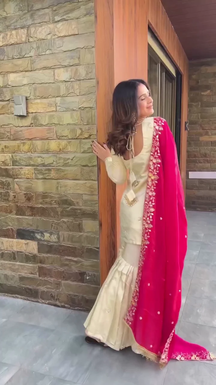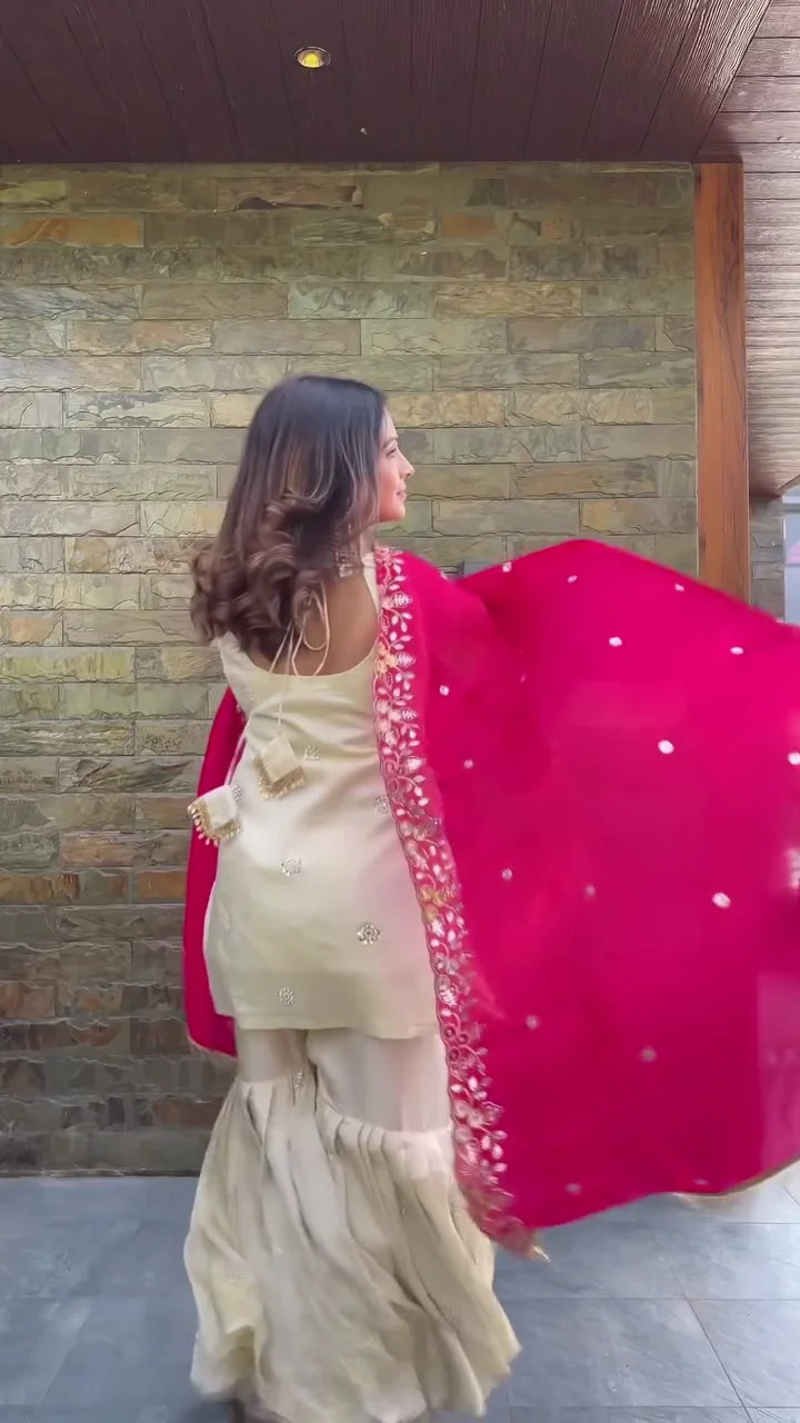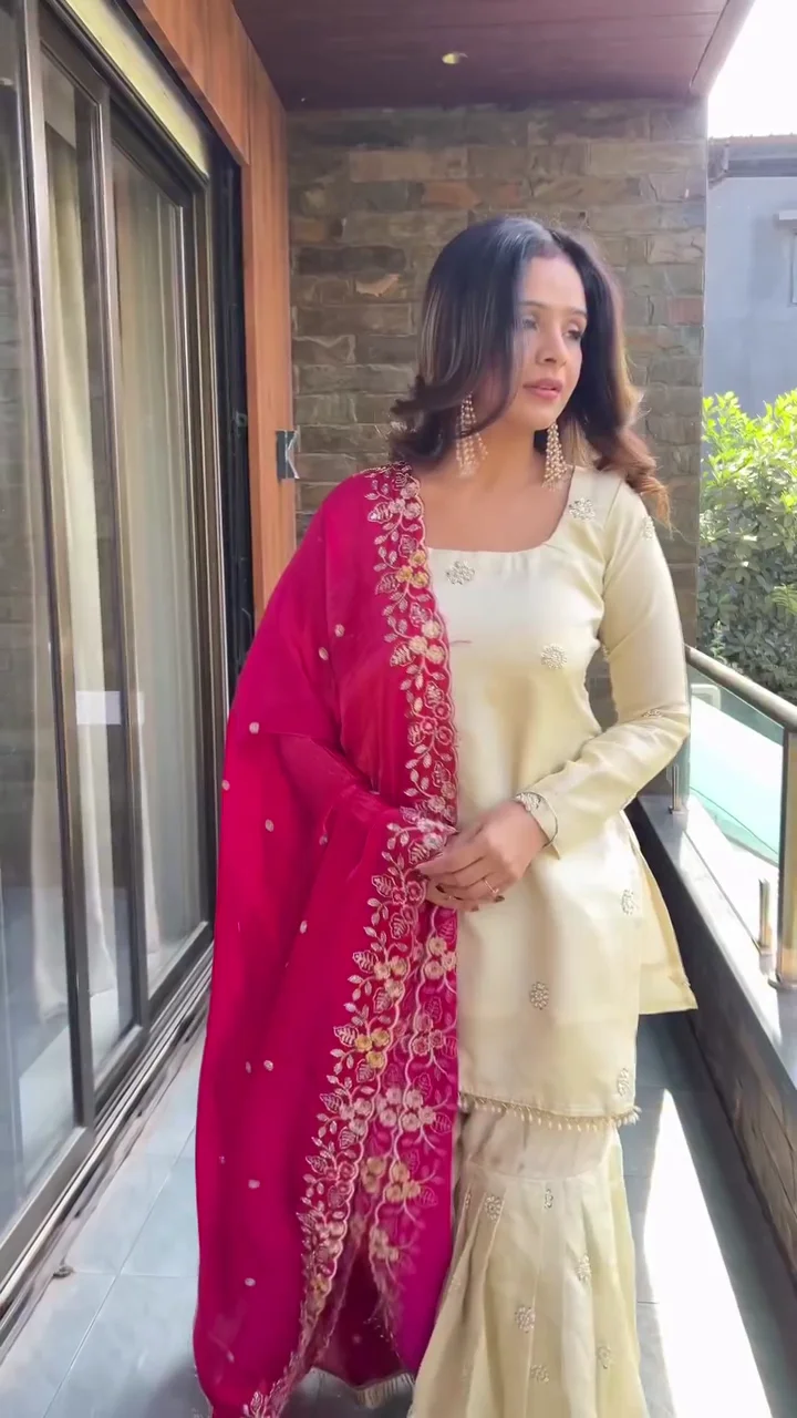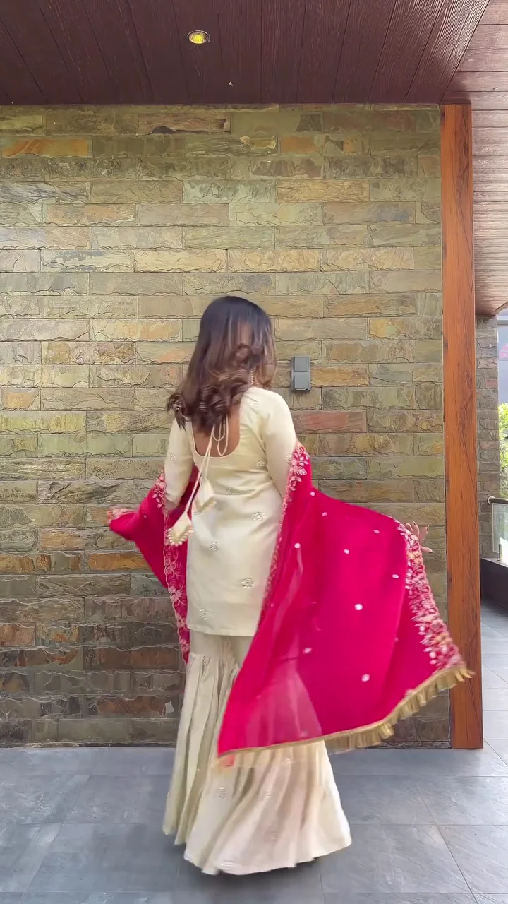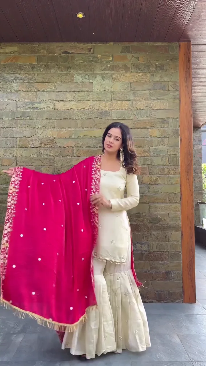This cream kurta set is complemented by a bright pink embroidered dupatta that adds a bold festive touch. The kurta features subtle embellishments for a refined look, while the sharara bottom provides volume and comfort. The intricate floral embroidery on the dupatta enhances the traditional aesthetic. Suitable for festive occasions and wedding functions, this outfit offers elegance with a statement contrast.