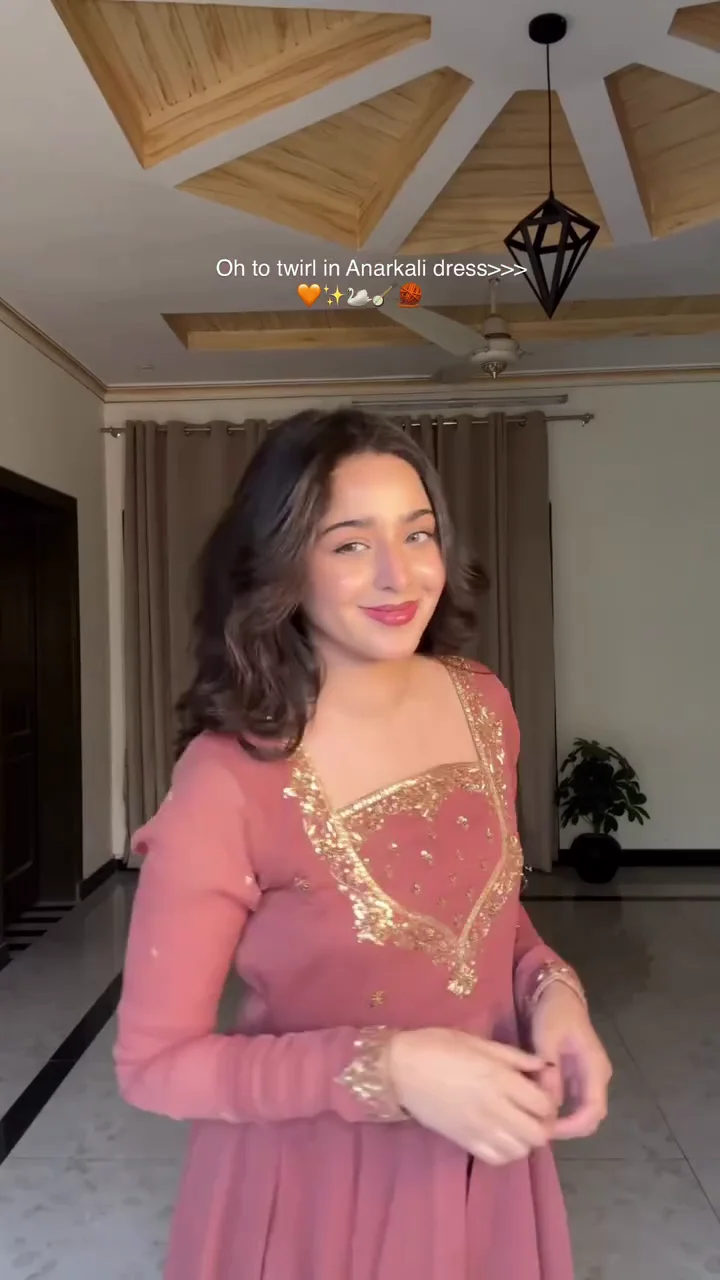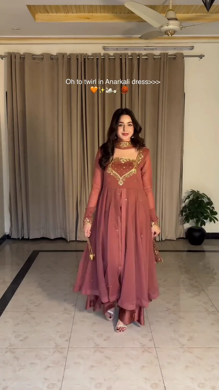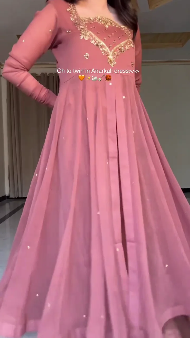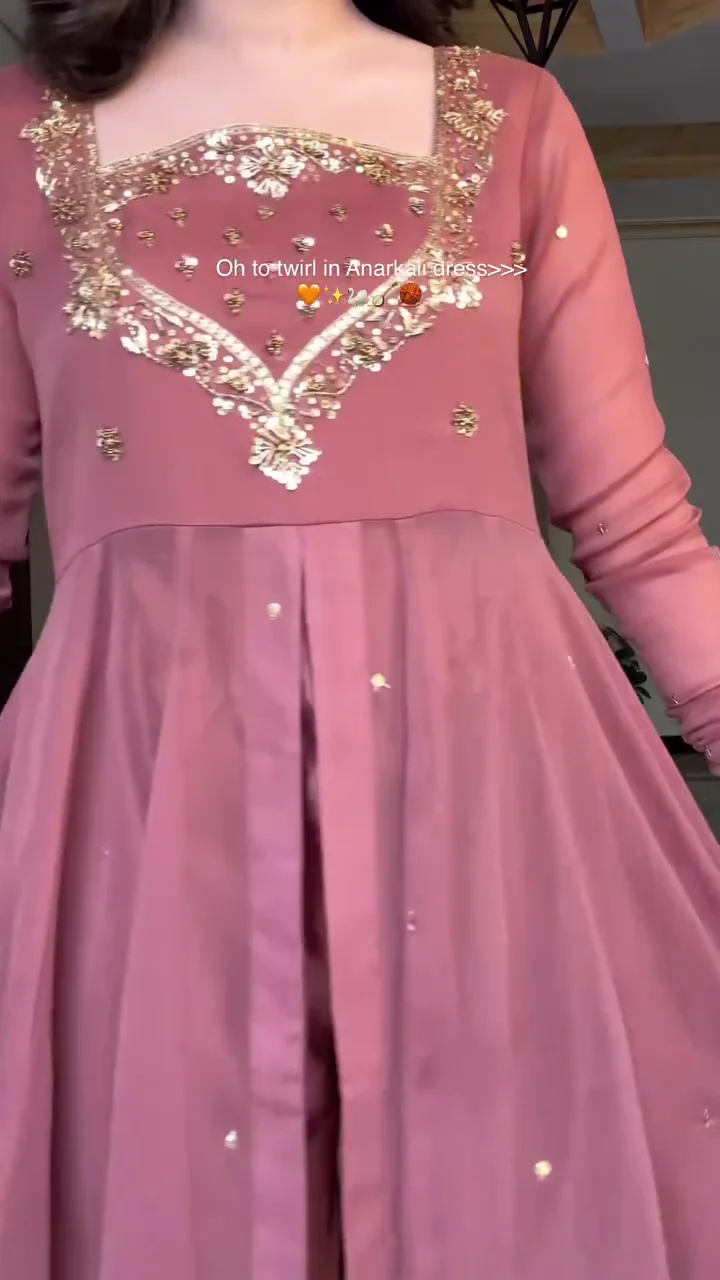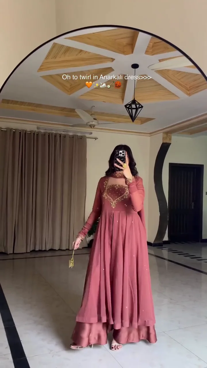 This dusty rose Anarkali dress features delicate embroidery across the bodice and sleeves, enhancing its feminine charm. The fitted upper bodice flows into a soft, pleated flare that creates a flattering silhouette. Designed for celebrations and formal occasions, the intricate embellishments add a refined finish while maintaining a graceful, minimal aesthetic. It is a perfect choice for festive evenings and special gatherings.