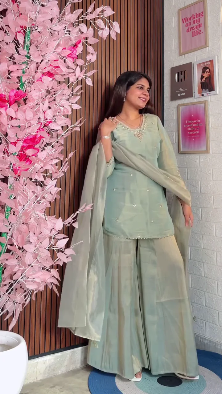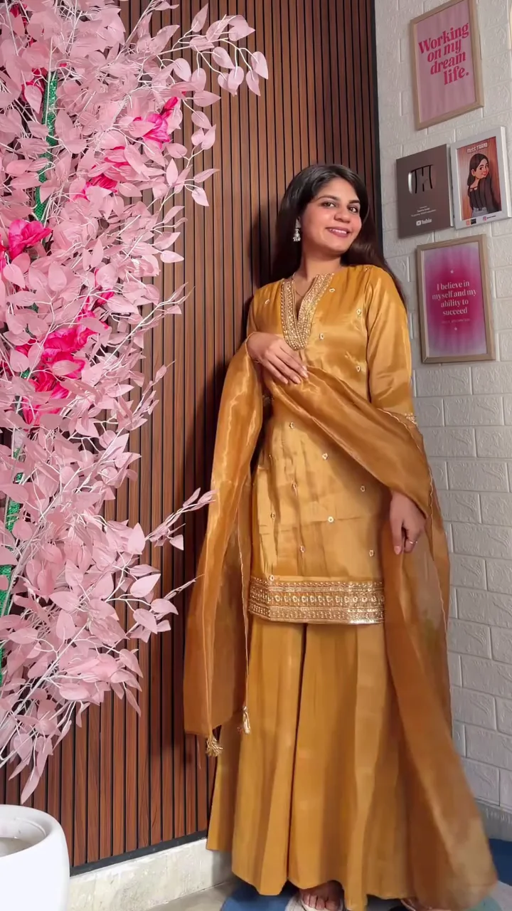 This elegant brown silk kurta set is designed for festive gatherings and formal occasions. The kurta features intricate embroidery on the neckline and sleeves, adding a refined traditional touch. Paired with a flowy matching sharara, the outfit creates a graceful silhouette that moves beautifully with every step. The rich brown tone enhances its timeless appeal, making it suitable for weddings, celebrations, and evening events. Crafted in a lustrous fabric, it offers both structure and comfort. Style it with statement earrings and classic heels for a complete ethnic look.