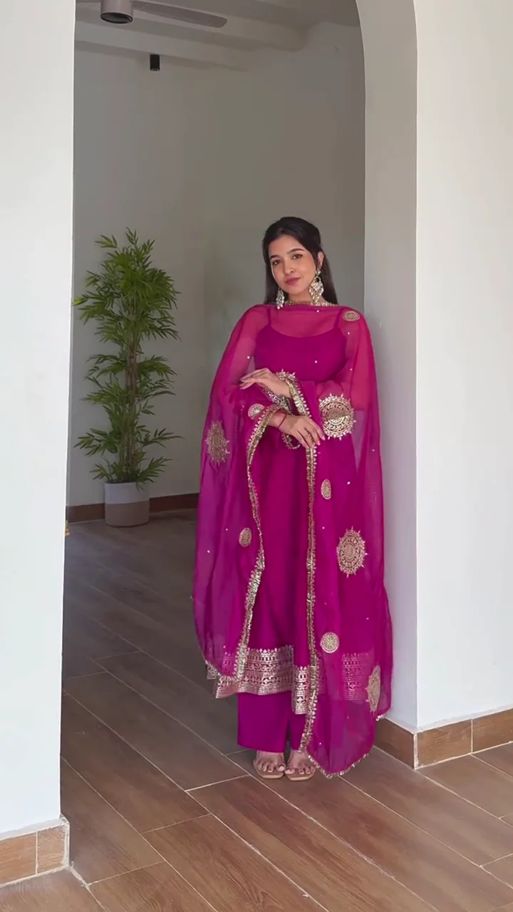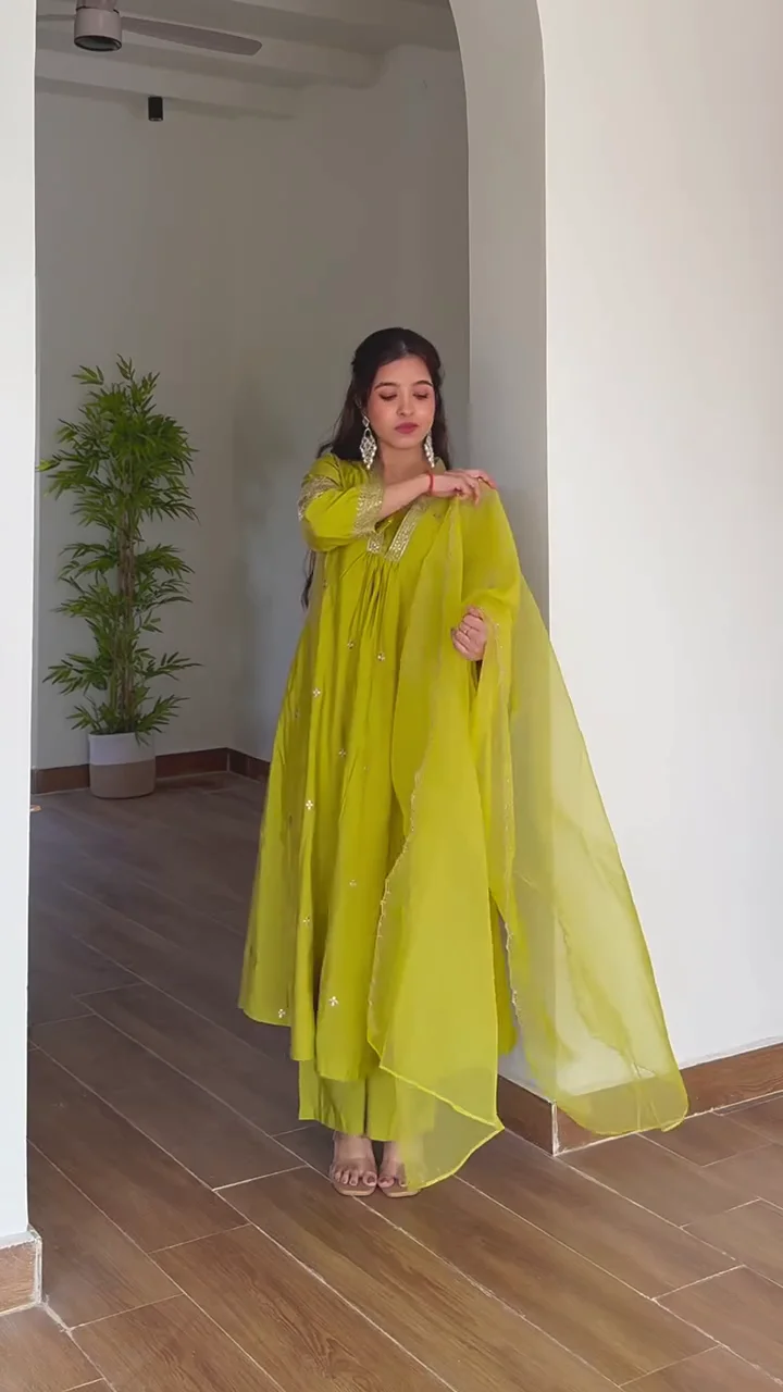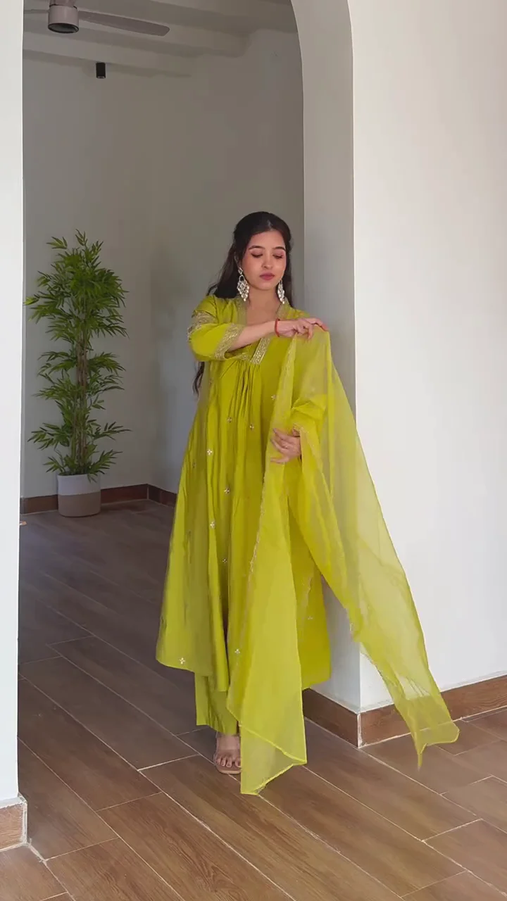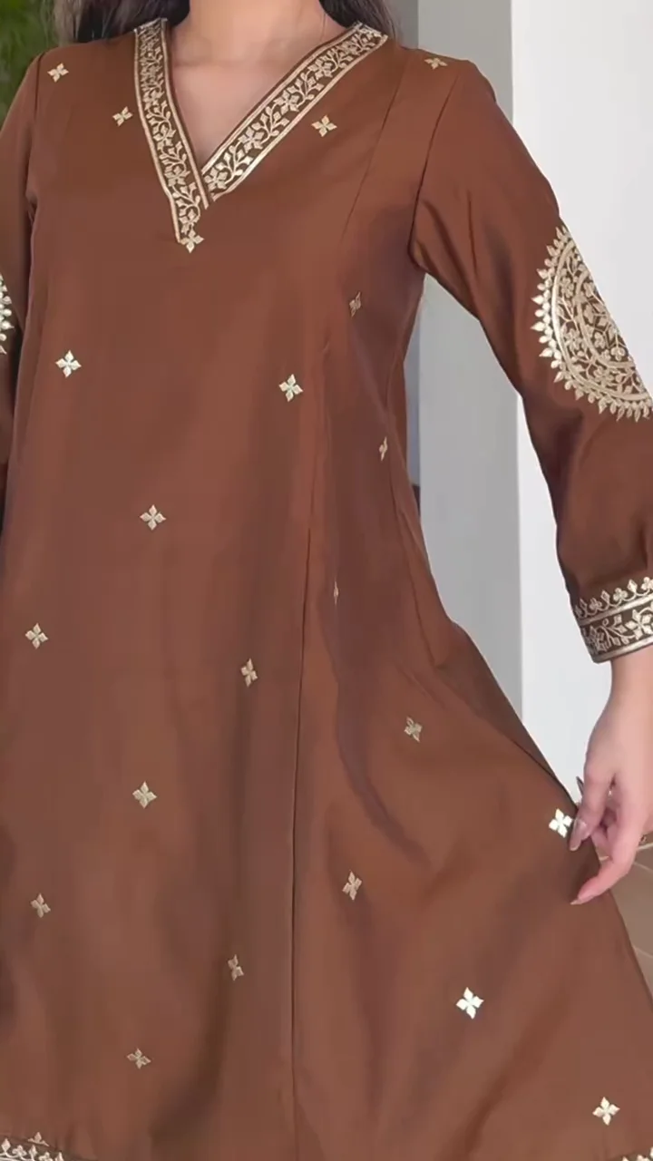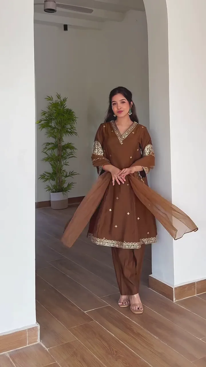 A sophisticated chocolate brown kurta set featuring delicate embroidery along the neckline, sleeves, and hem. The straight-fit pants provide a clean and modern finish, while the lightweight dupatta adds elegance and fluidity. This ensemble is perfect for intimate festive events, family functions, or traditional dinners. The minimal yet detailed embellishments balance simplicity with charm, making it a versatile addition to your ethnic wardrobe.