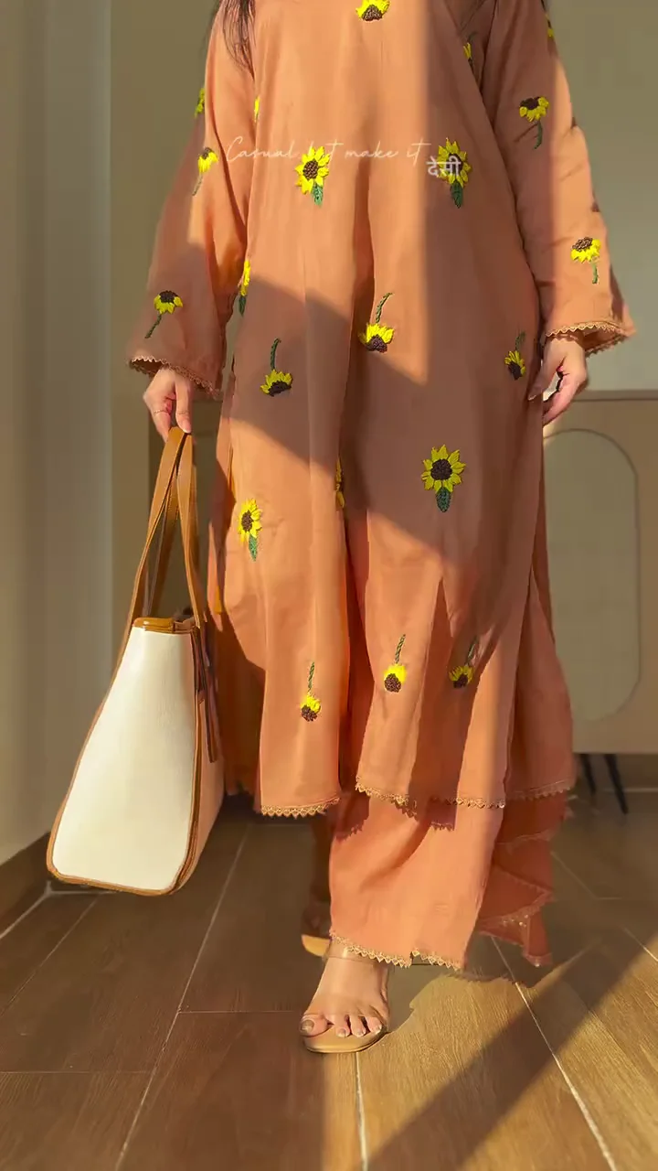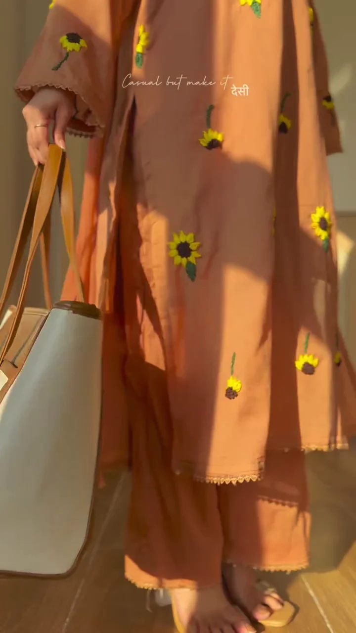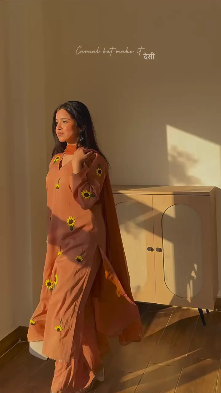 This rust-toned kurta set blends comfort with subtle festive charm. Adorned with floral embroidery across the front, it offers a fresh and youthful look. The relaxed silhouette ensures ease of movement, while the coordinating dupatta completes the outfit with effortless grace. Ideal for daytime gatherings, casual festive wear, or cultural outings, this set provides both comfort and understated elegance.