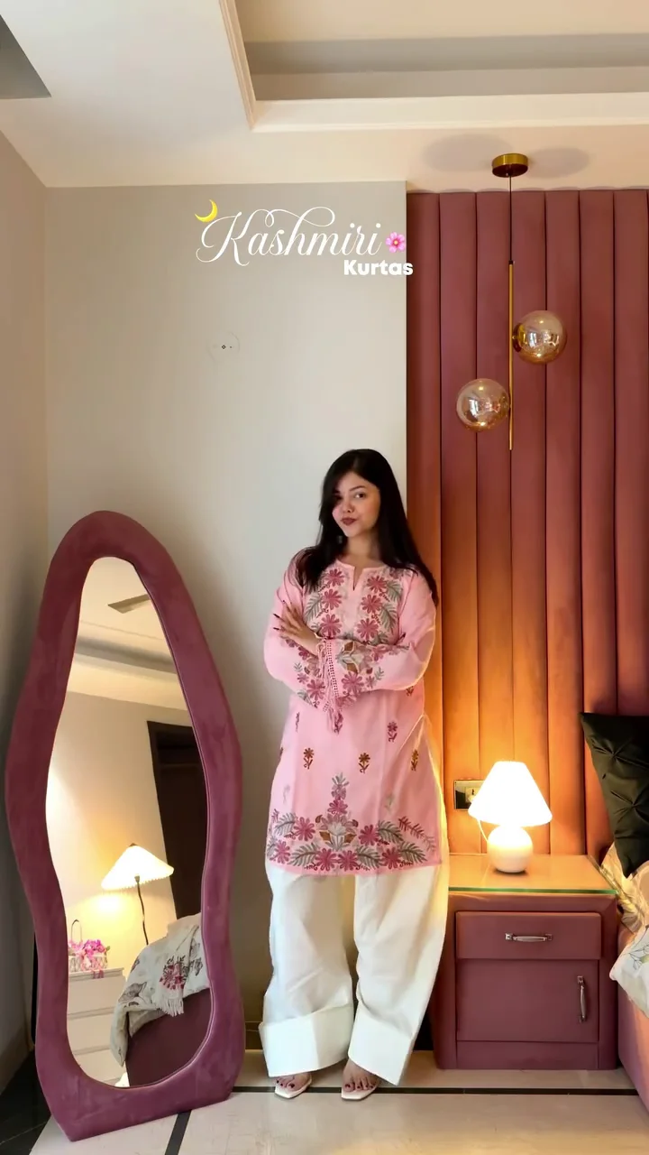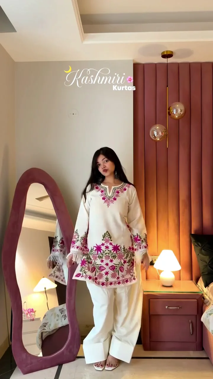 A beautifully crafted white kurta featuring vibrant Kashmiri-inspired embroidery along the neckline and hem. The wide-leg pants enhance the overall flow and comfort of the ensemble. This outfit is perfect for festive mornings, cultural events, or elegant day functions. The detailed threadwork stands out against the soft white base, creating a refined yet striking appearance.